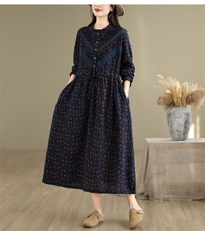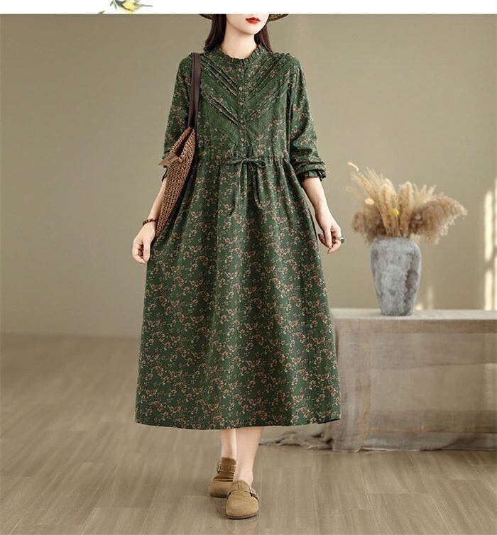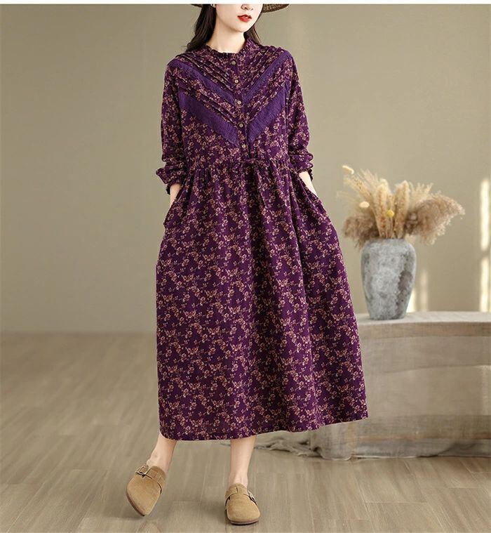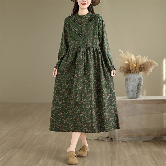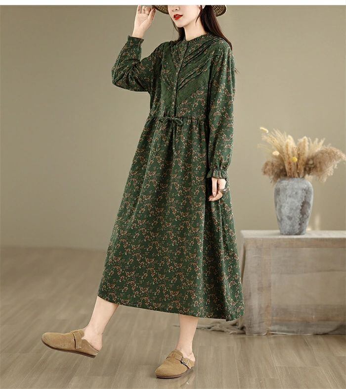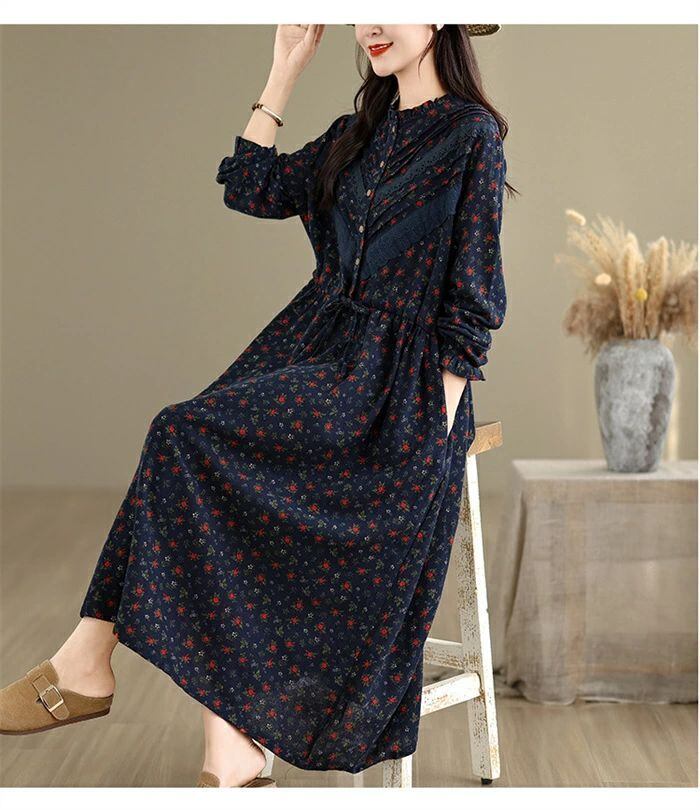 ワンピース シャツワンピース レディース 綿麻調 ロング ワンピース 長袖 コットンリネン シャツワンピ カジュアル 花柄 フリル襟 長袖 ロングワンピース フレアワンピース aライン 大きサイズ ゆったり かわいい シンプル リラックス カジュアル 春 秋 冬 森ガール 上品 通勤 OL お洒落 森ガール 30代 40代 50代 送料無料