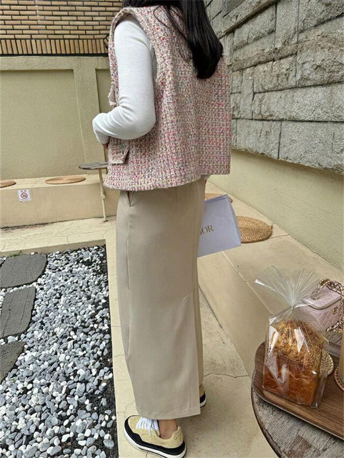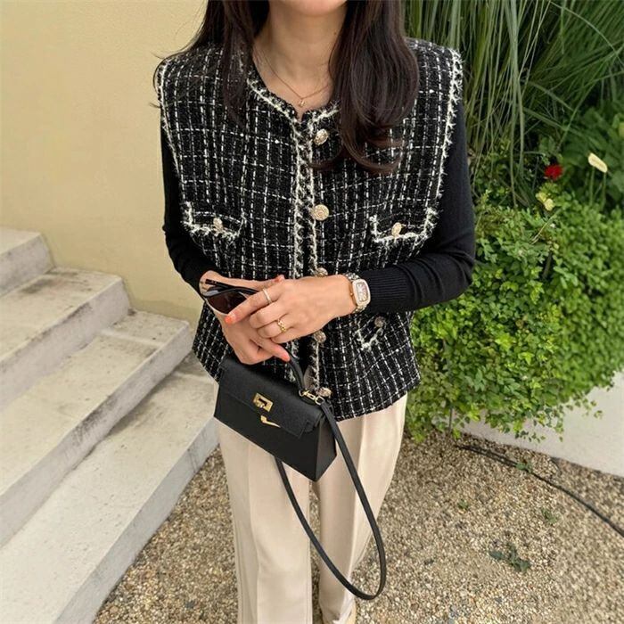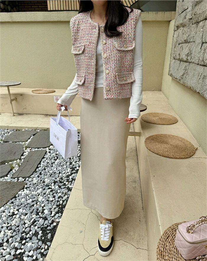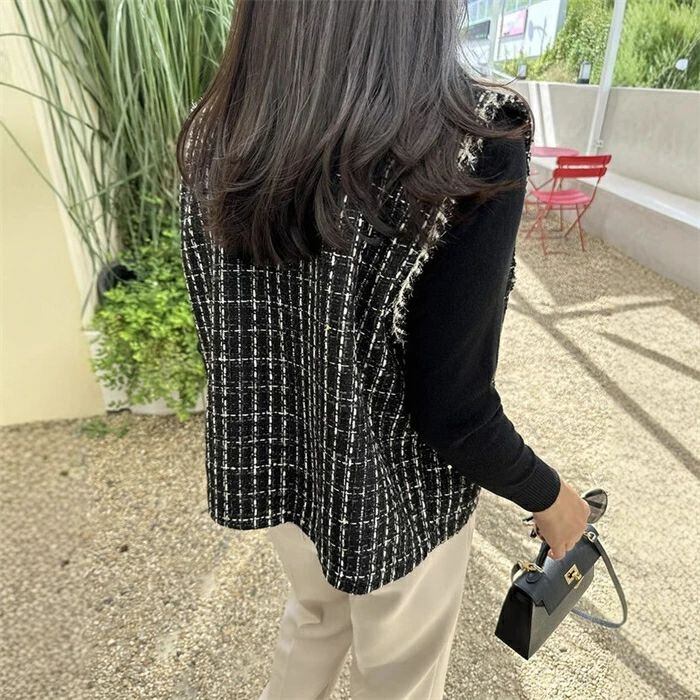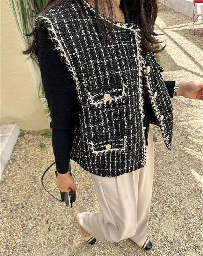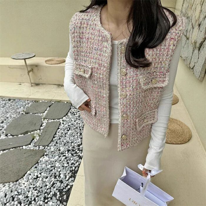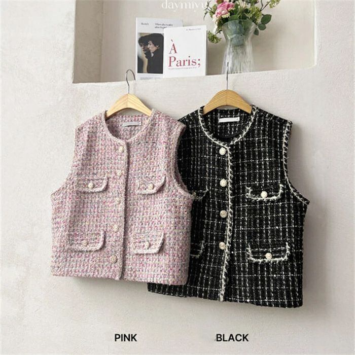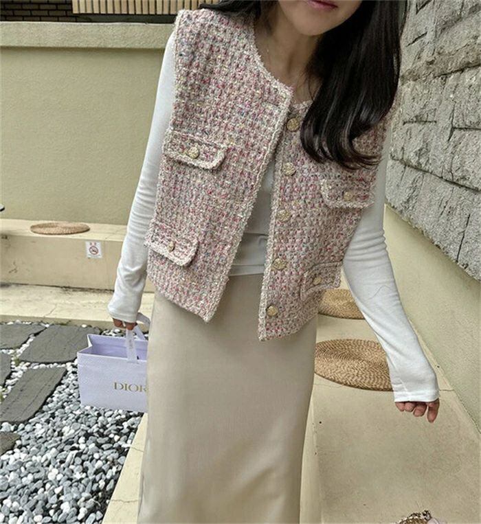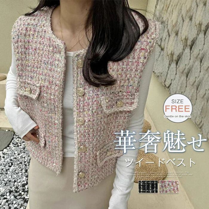 ツイード ジレ レディース きれいめ ベスト ジレ 秋 秋冬 冬 かわいい おしゃれ クルーネック 韓国ファッション 上品 エレガント 高見え カ