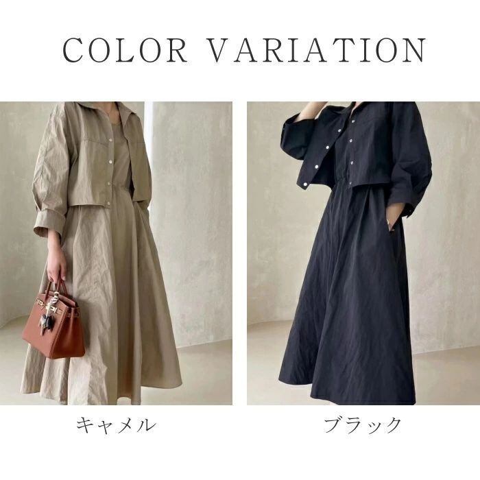セットアップ 2点セット レディース アウター 長袖 折襟 ショート丈 ワンピース ノースリーブ Aライン ロングワンピース フレア ポケット付