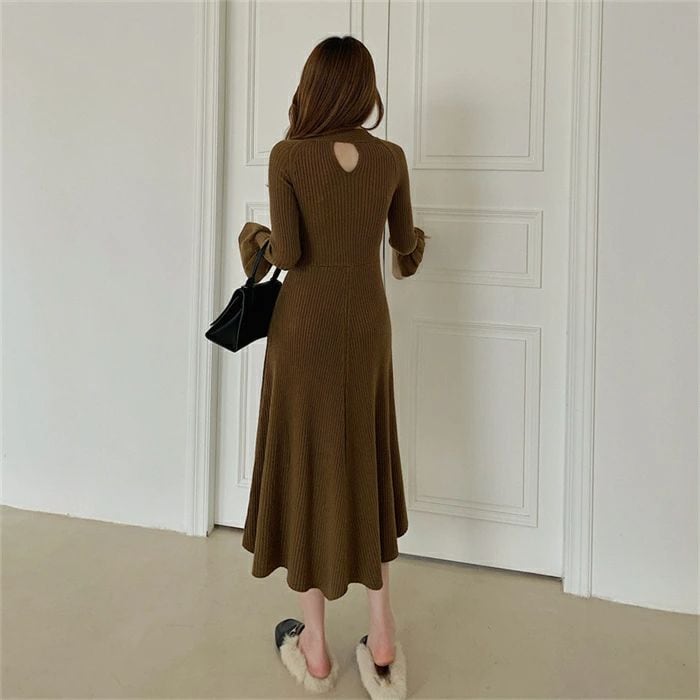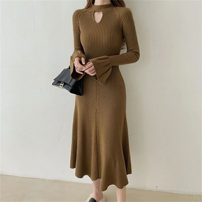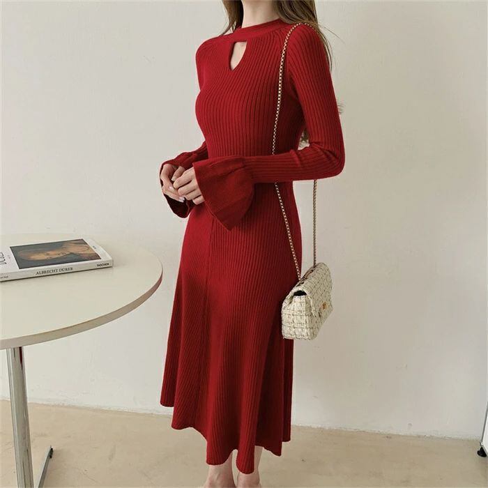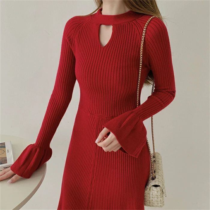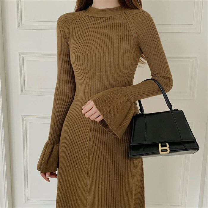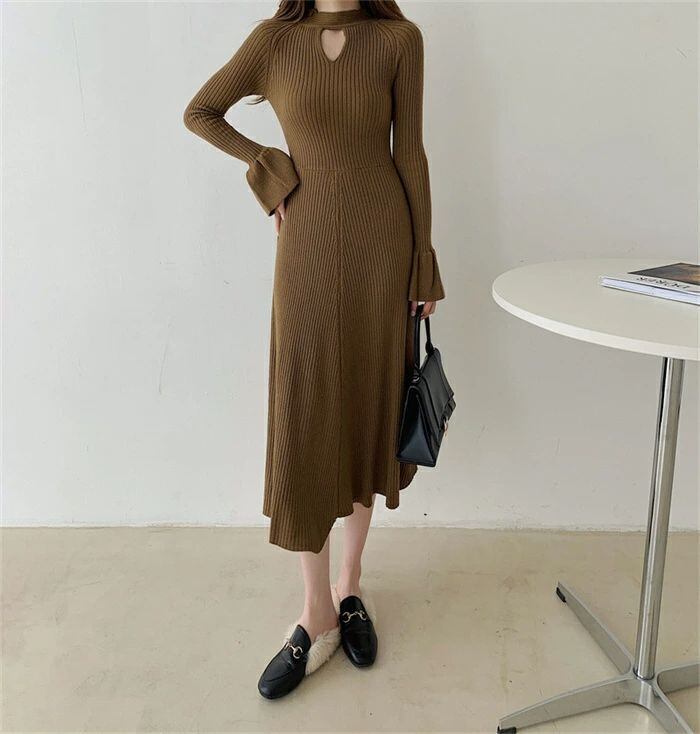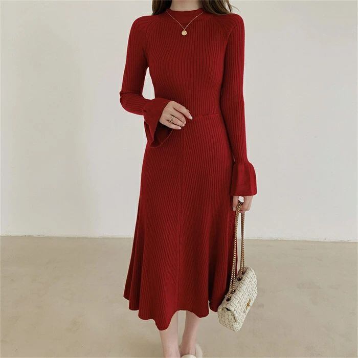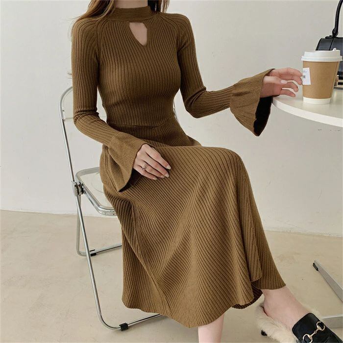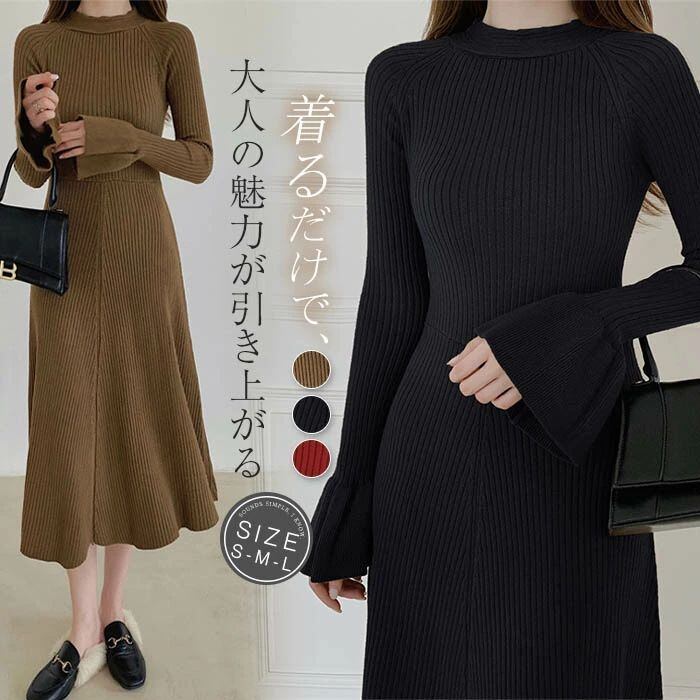 ニット ワンピース レディース ロング ワンピース ワンピ ハイネック 無地 前後両面着 aライン 秋 冬 長袖 体型カバー マーメード裾 大きい