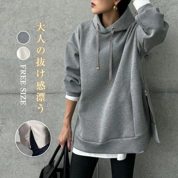 パーカー スウェット トレーナー レディース フーディー サイドジップ 秋冬 トップス 長袖 プルオーバー フード付き フードパーカー ゆった