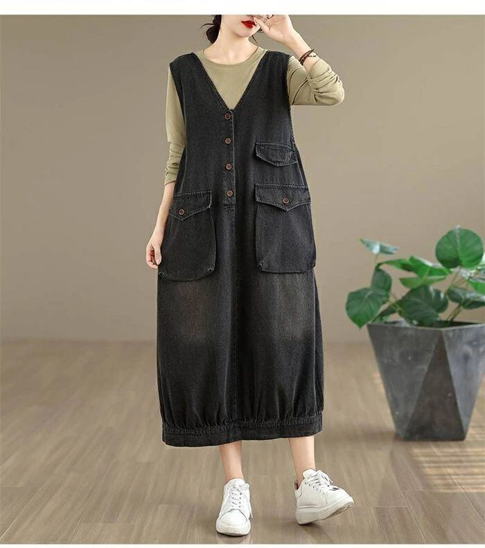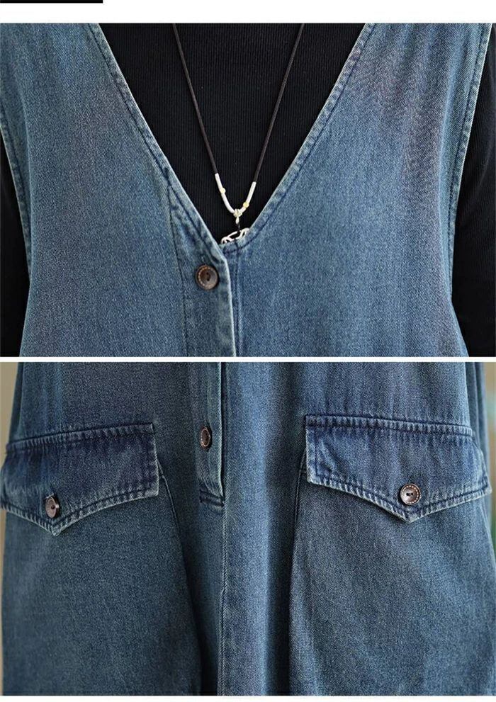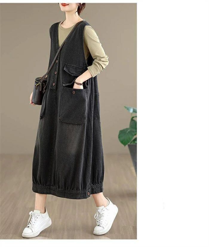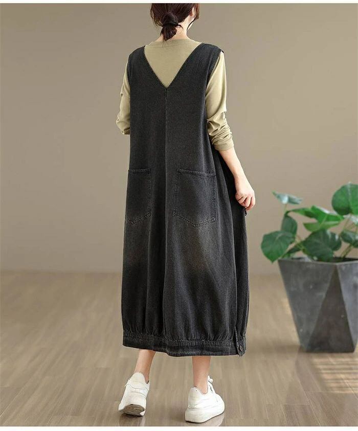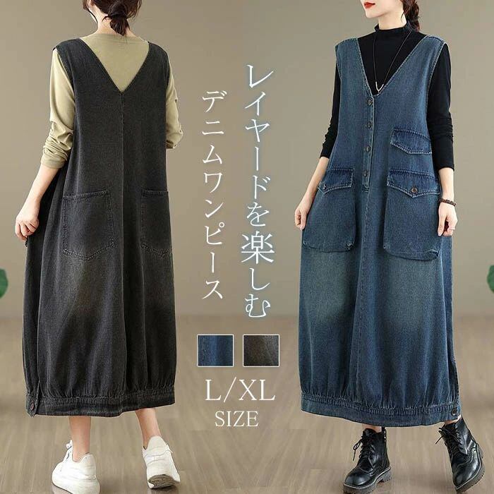 ジャンパースカート サロペット ワンピース レディース デニム ワンピース オーバーオール オールインワン デニム ワンピース ロング丈 ノースリーブ 体型カバー 春 秋 冬 ゆったり レイヤード Vネック ロングワンピ 着痩せ カジュアル 大きいサイズ リラックス 重ね着 20代 30代 40代 50代 体型カバー カジュアル トレンド レイヤード ブルー ブラック