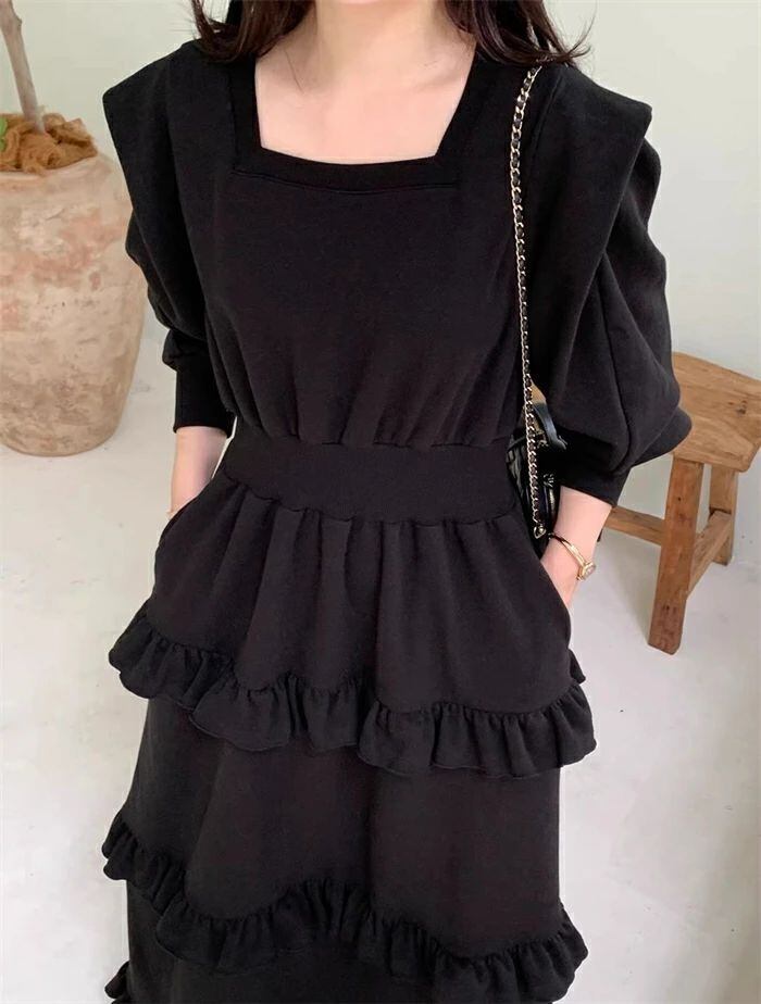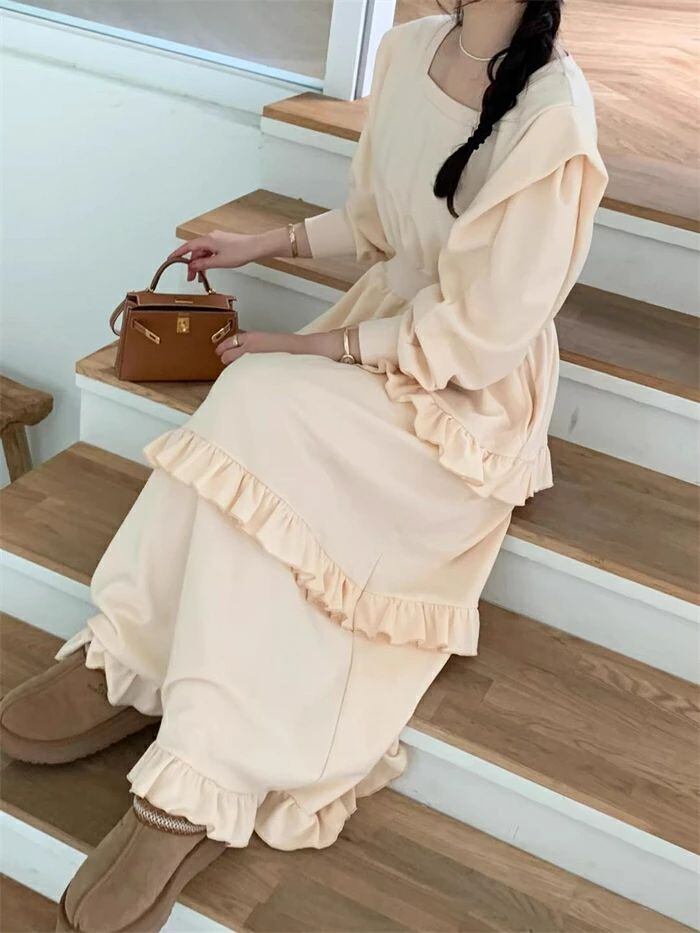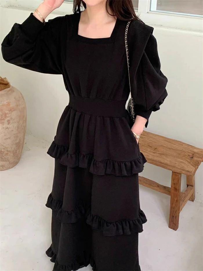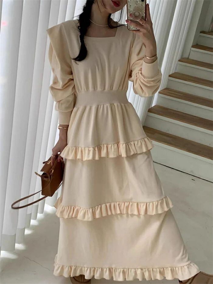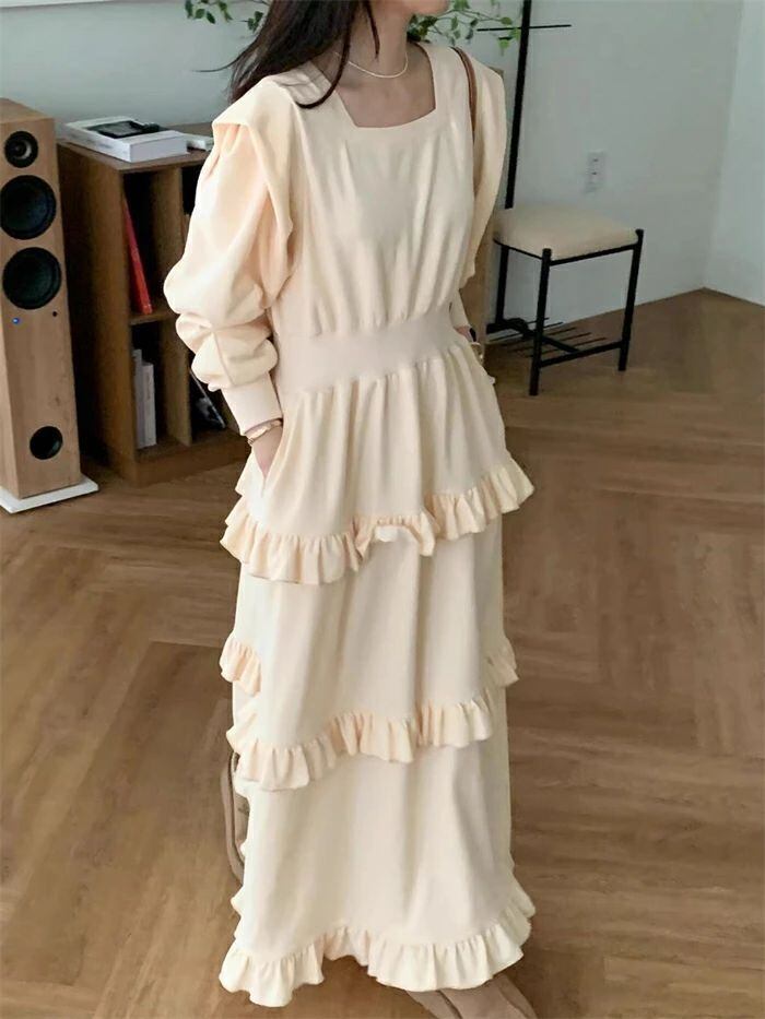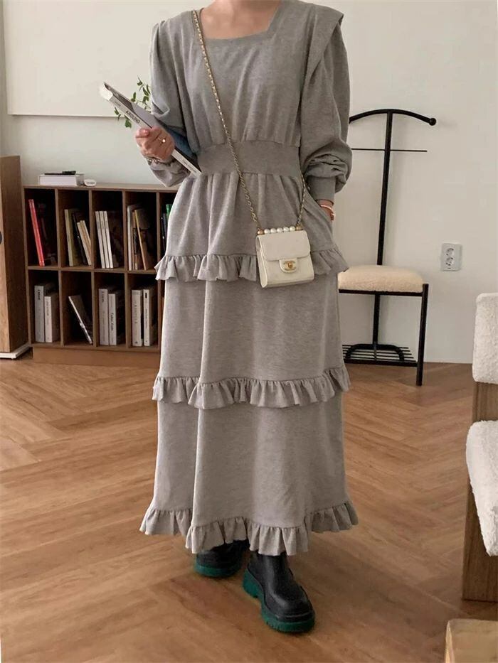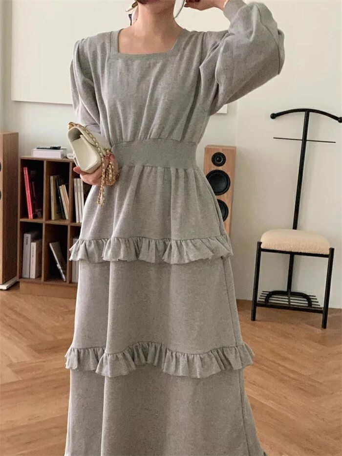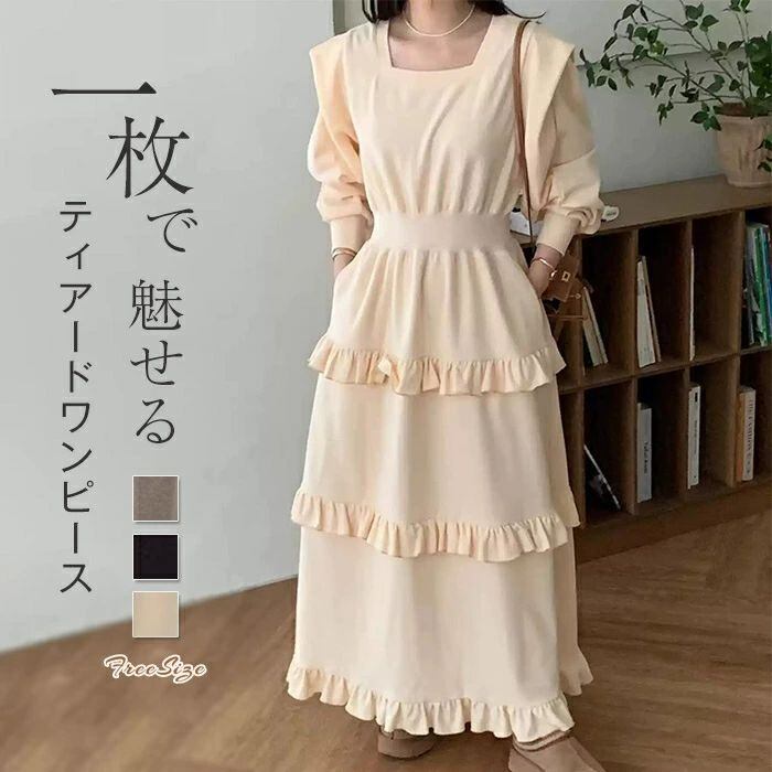 ワンピース ティアード レディース 秋冬 ロングワンピース ボリューム袖 長袖 ティアードワンピース スクエアネック スウェットワンピース ロング丈 無地 Aライン ゆったり 体型カバー 着?せ カジュアル シンプル きれいめ フェミニン 可愛い 通勤 通学 お出かけ