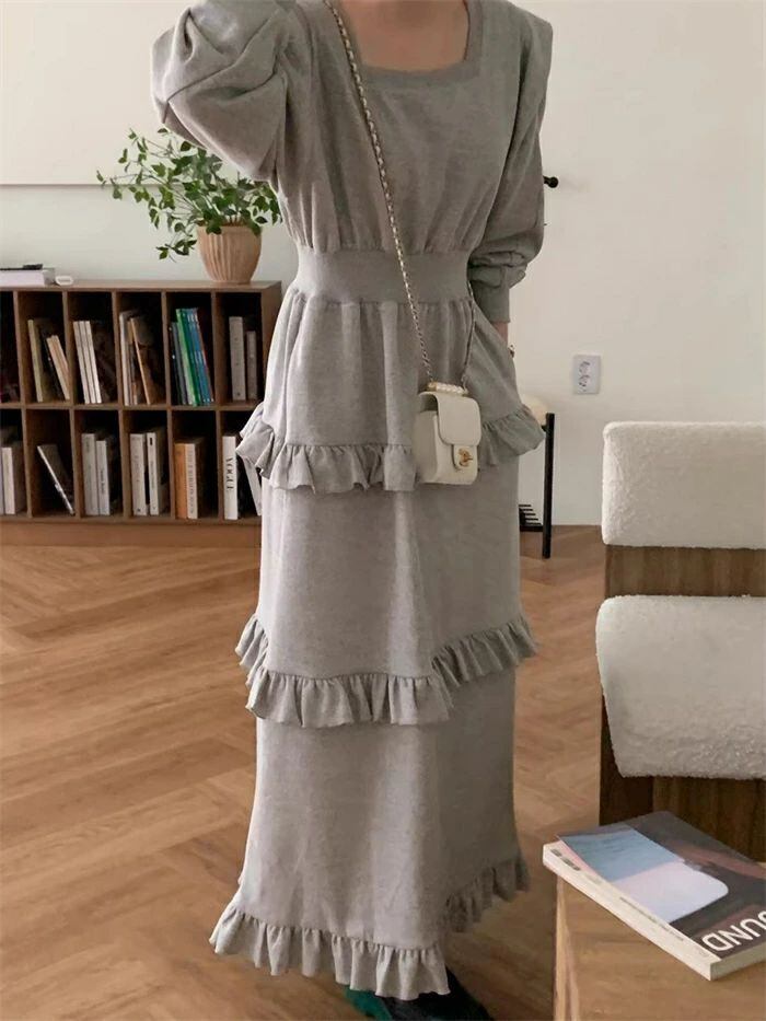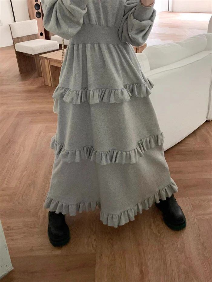 ワンピース ティアード レディース 秋冬 ロングワンピース ボリューム袖 長袖 ティアードワンピース スクエアネック スウェットワンピース