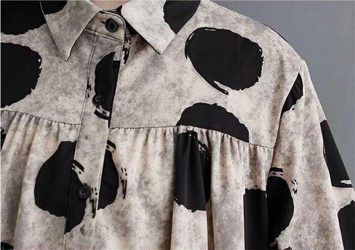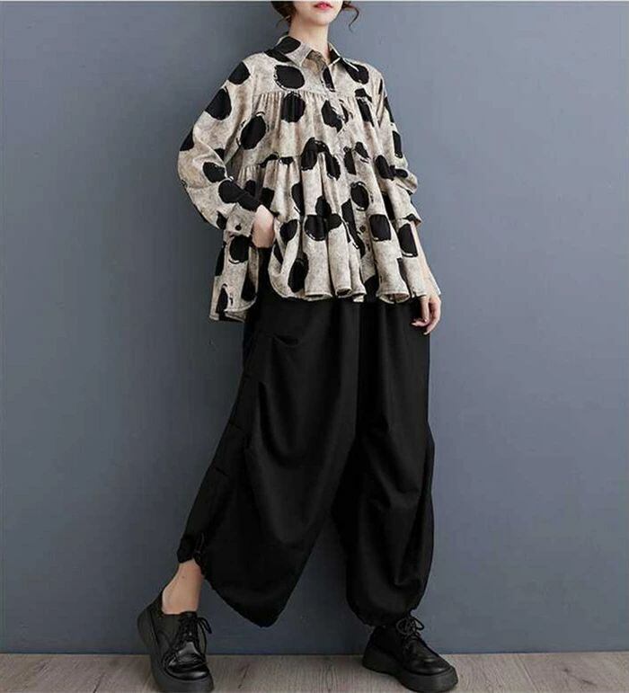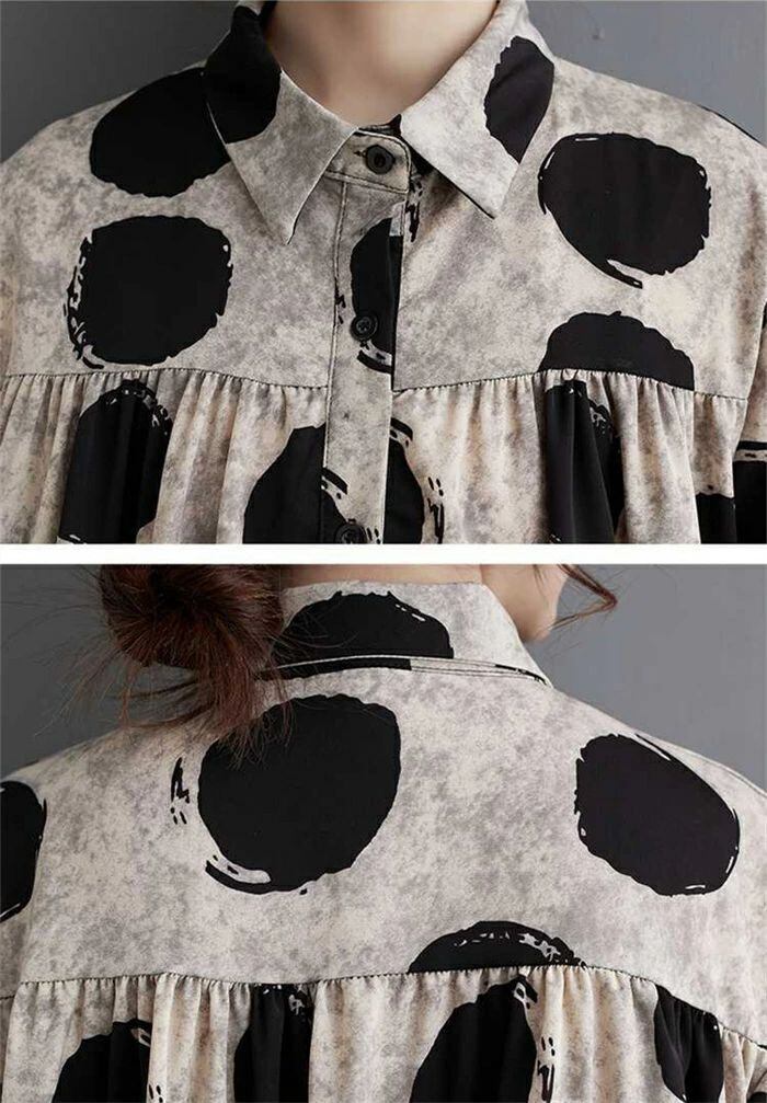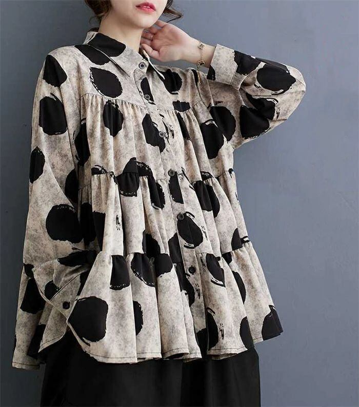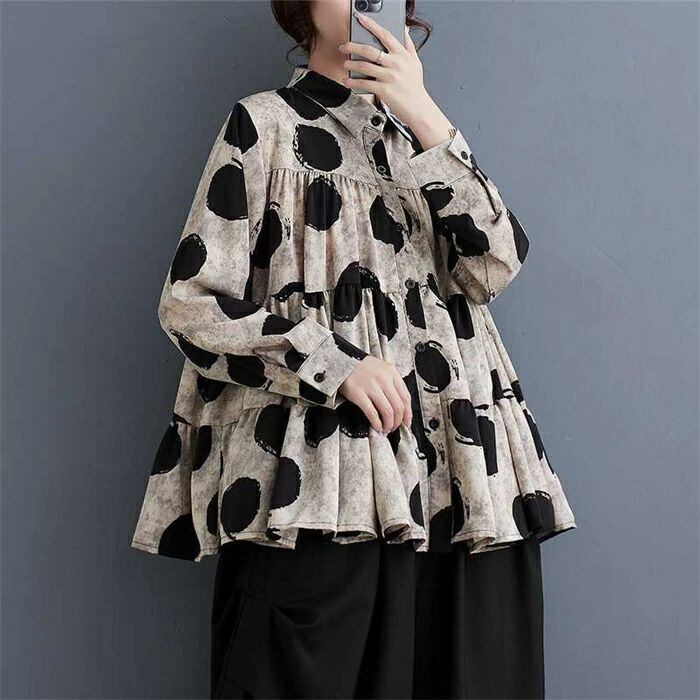 シャツ ドット柄 レディース 春秋 シャツブラウス フリル 長袖 ブラウス 可愛い 水玉柄 前開き トップス 重ね着 折襟 ゆったり 体型カバー