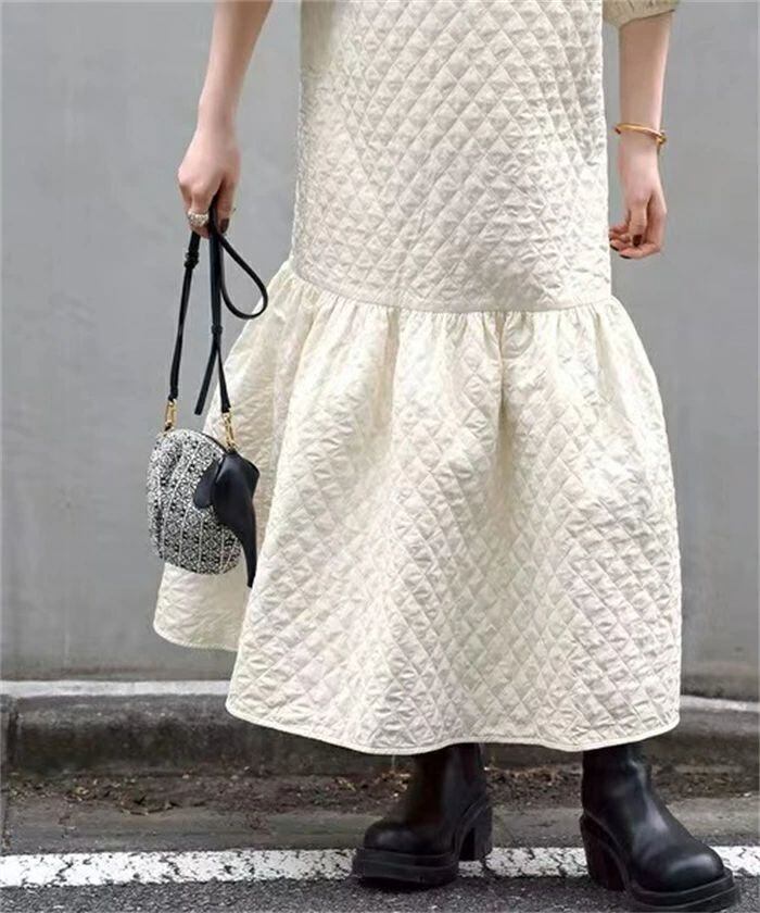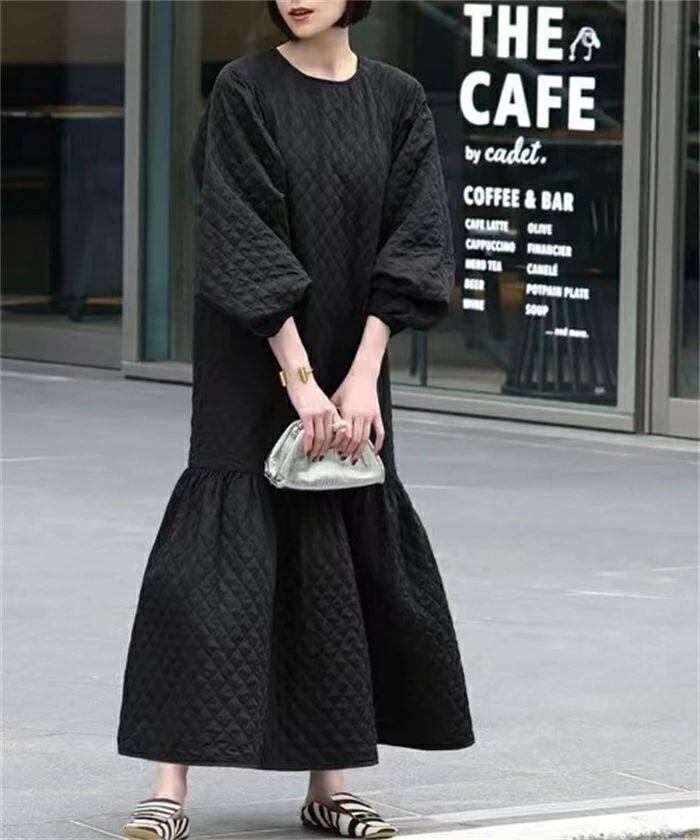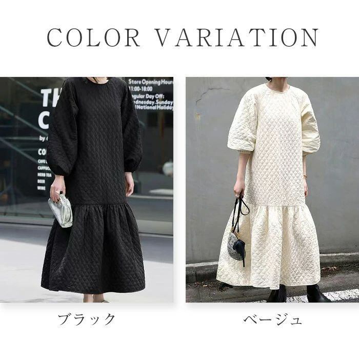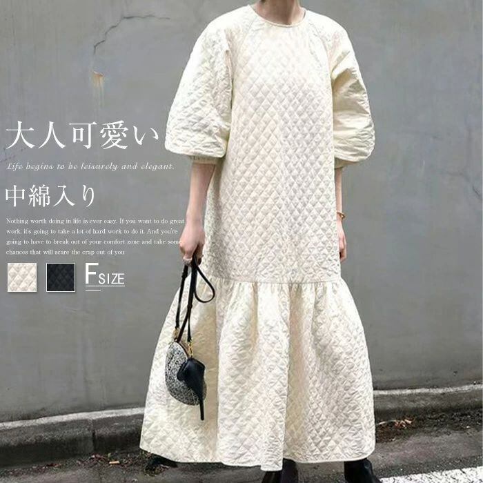 ワンピース キルティング キルティングワンピース レディース 秋 中綿 薄手 ボリューム袖 長袖 ロングワンピース ロング丈 中綿入り バルー
