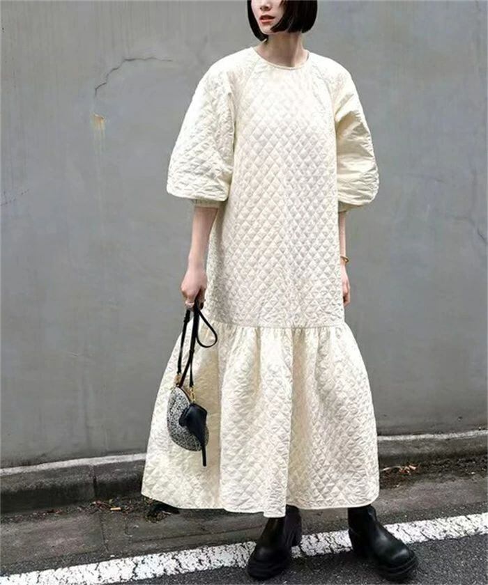 ワンピース キルティング キルティングワンピース レディース 秋 中綿 薄手 ボリューム袖 長袖 ロングワンピース ロング丈 中綿入り バルーン袖 フレア 可愛い 無地 きれいめ クルーネック ゆったり 体型カバー カジュアル シンプル 通勤OL 通学 20代 30代 40代 50代