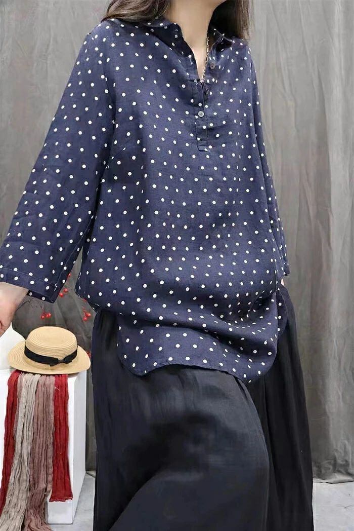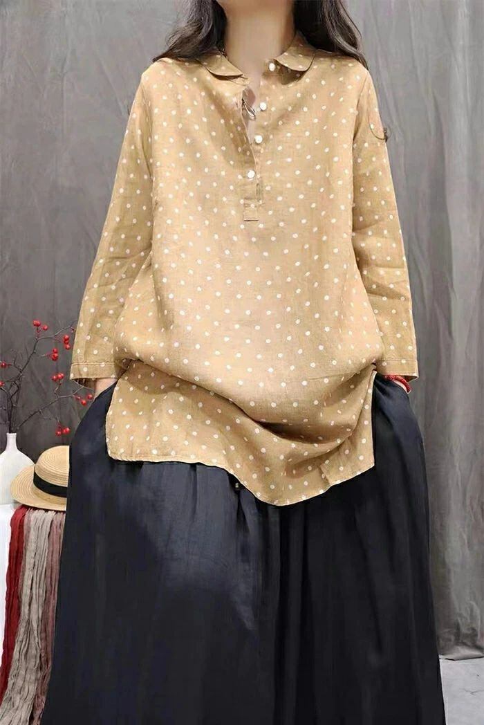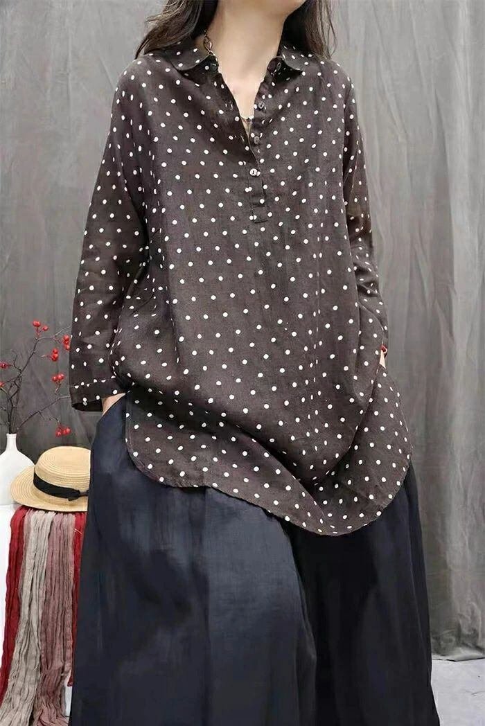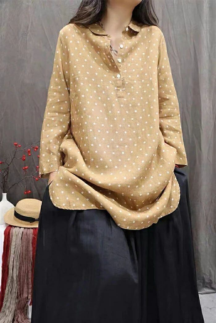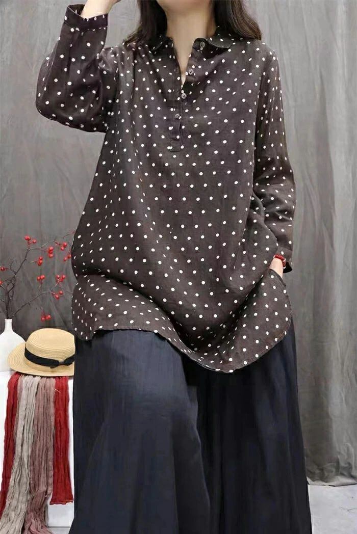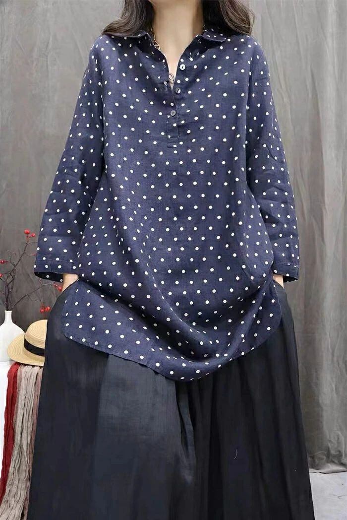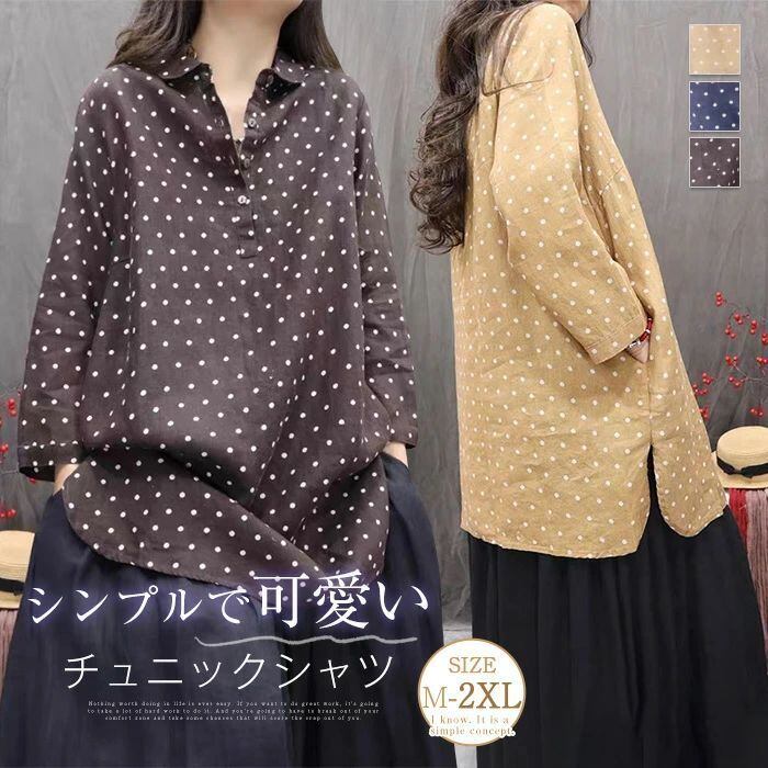 チュニック シャツ ドット柄 レディース 新作 ロング シャツ ブラウス 長袖 シャツブラウス トップス 水玉柄 プルオーバー 綿麻風 体型カバー 大きいサイズ 綿麻 春 秋 シンプル チュニック シャツ ゆったり 大人 カジュアル 通勤 OL お洒落 オフィス 着回し 送料無料 ゆったり お洒落 可愛い 着痩せ 定番 可愛い