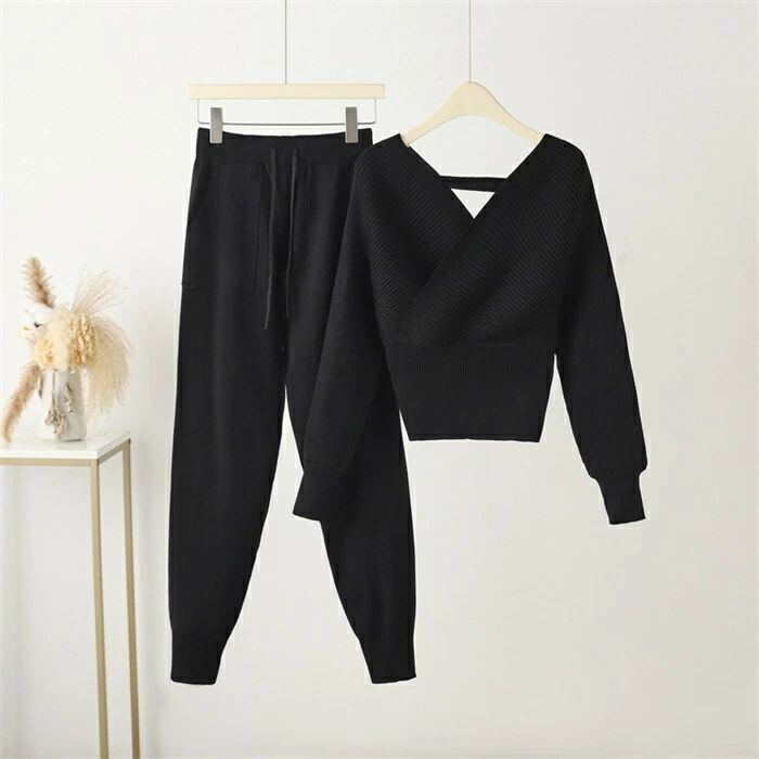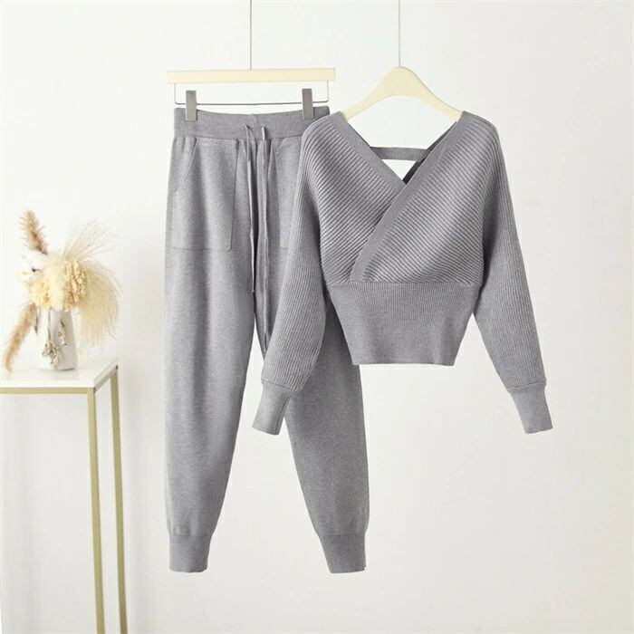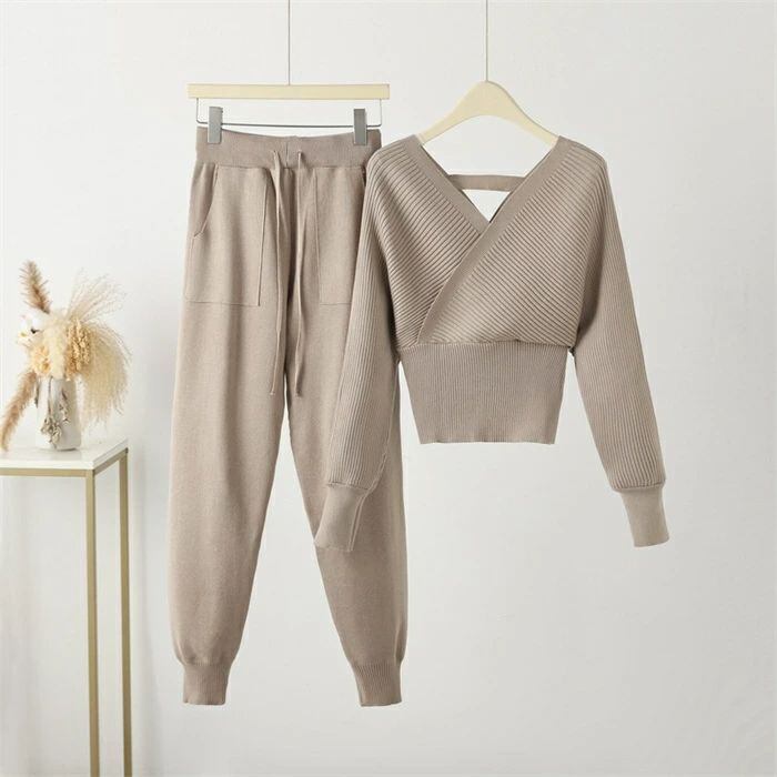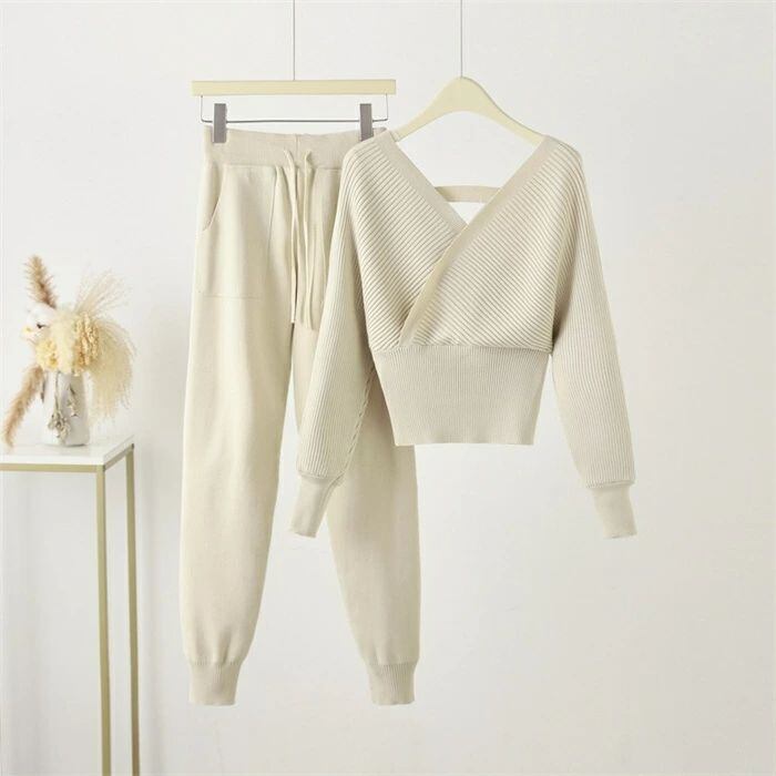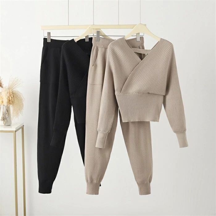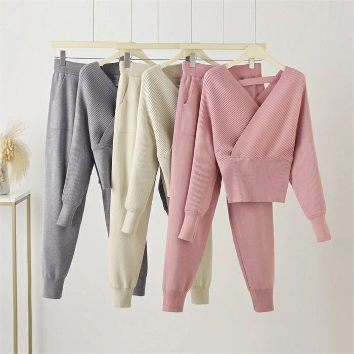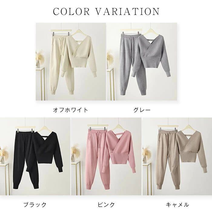 セットアップ ニット 2点セット レディース ニットセットアップ パンツスーツ リブニット 長袖 ニットトップス vネック ニットパンツ パン