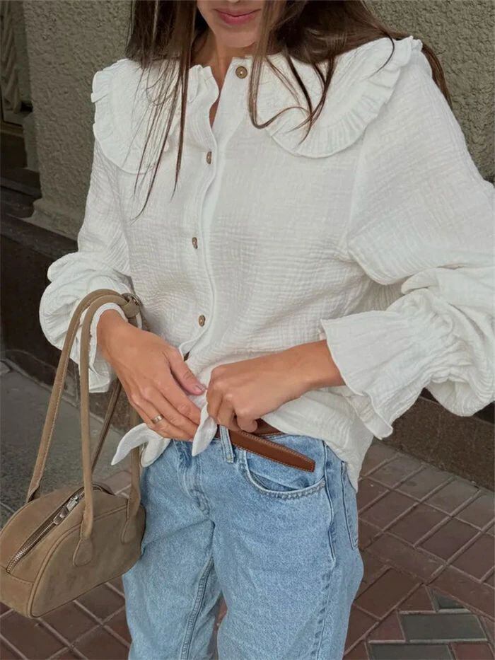 シャツ 綿100% レディース 綿シャツ シャツブラウス 長袖 ボリューム袖 白シャツ 前開き 可愛い 綿 コットン フレア袖 森ガール トップス レイヤード 重ね着 ゆったり 体型カバー 着?せ カジュアル 柔らかい シンプル オフィス 通勤OL 通学 20代 30代 40代 送料無料