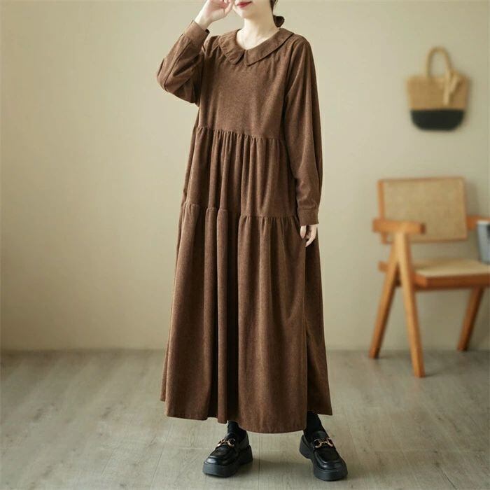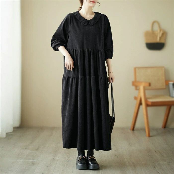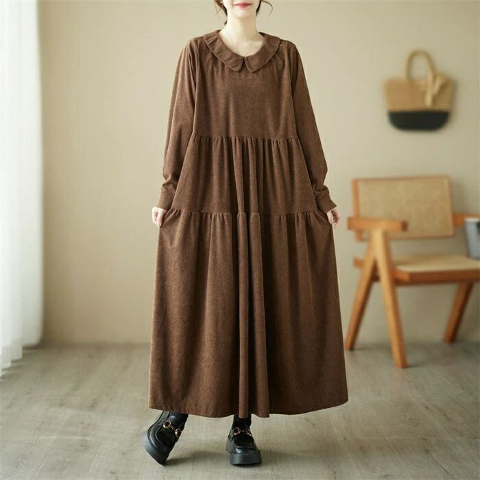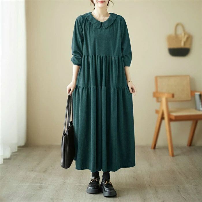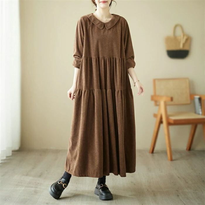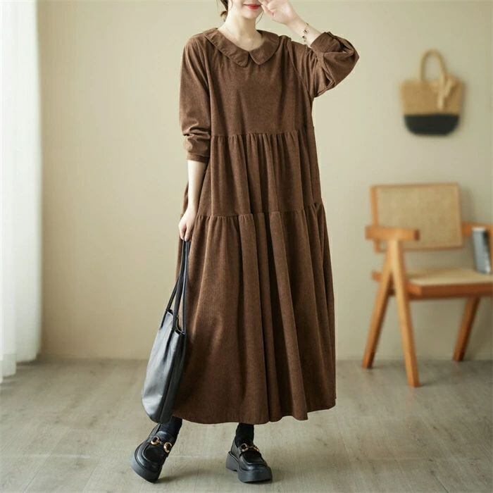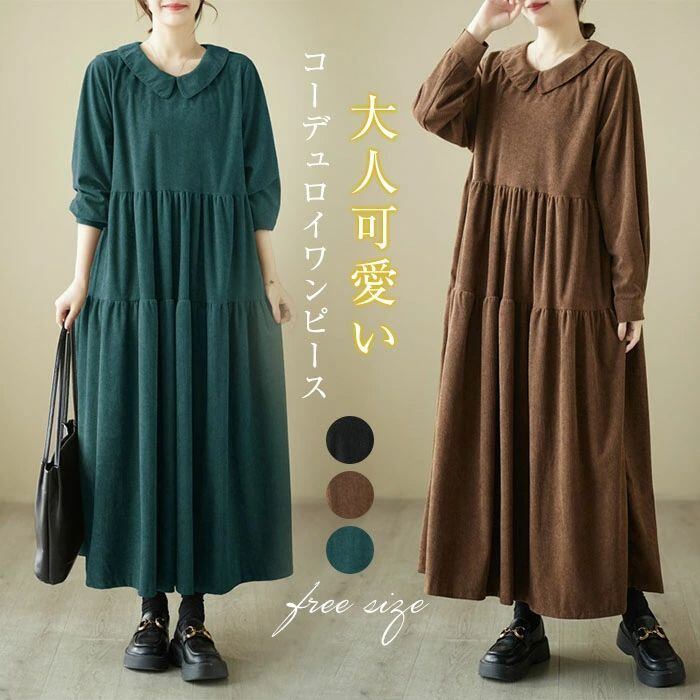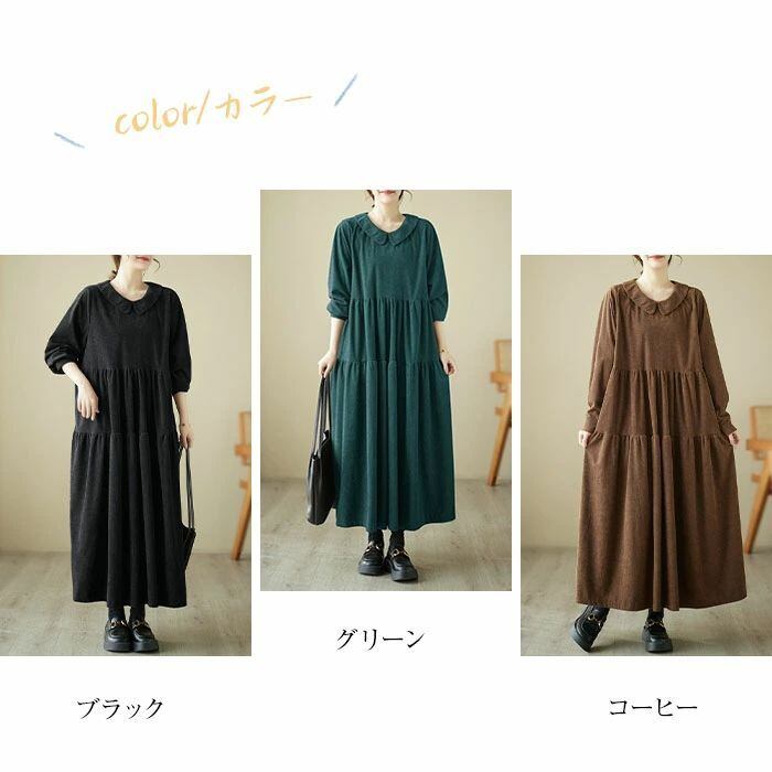 ワンピース コーデュロイ コーデュロイワンピース レディース ロングワンピース ロング丈 長袖 フレア ゆるっとワンピース 大きいサイズ Aライン 無地 ゆったり 体型カバー 森ガール カジュアル シンプル おしゃれ きれいめ 着?せ 30代 40代 50代 送料無料