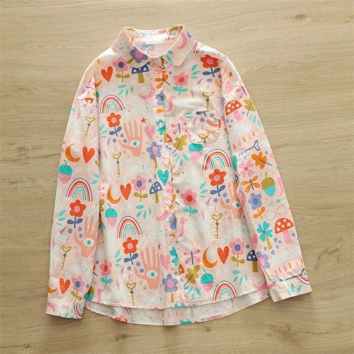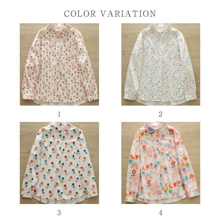 シャツ ブラウス 綿シャツ レディース シャツブラウス 総柄 花柄 ウサギ柄 長袖 コットン 可愛い 綿 トップス 丸襟 森ガール 前開き 重ね着 柔らかい ナチュラル 通勤OL 通学 オフィス フォーマル カジュアル シンプル 20代 30代 40代 50代