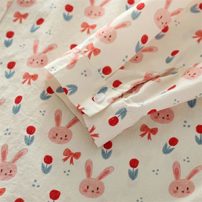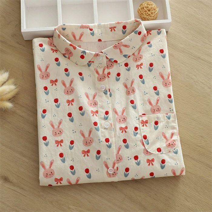 シャツ ブラウス 綿シャツ レディース シャツブラウス 綿100% 総柄 花柄 ウサギ柄 長袖 コットン 可愛い 綿 トップス 丸襟 森ガール 前開