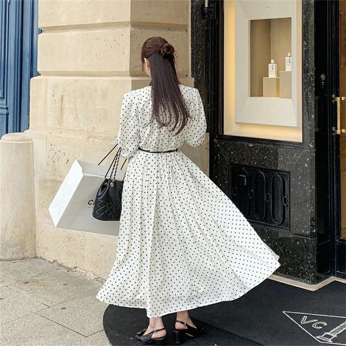 ワンピース ロングワンピース レディース 秋新作 シャツワンピース ワンピ ロング丈 長袖 ドット柄 水玉 Aライン 配色 折襟 ベルト付き 春 夏 秋 ふんわり 着?せ ゆったり 体型カバー カジュアル シンプル 可愛い きれいめ 普段着 大人 女性 20代 30代 40代 50代