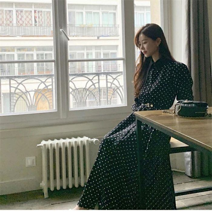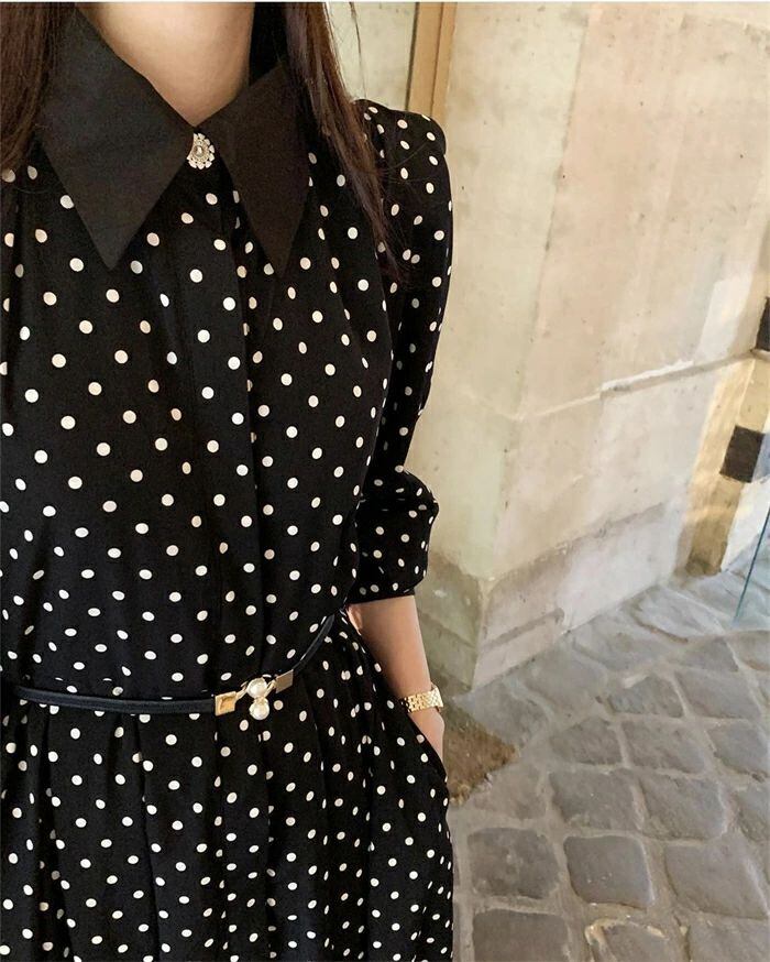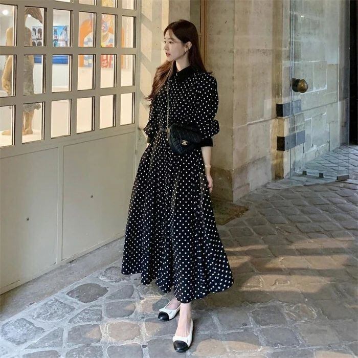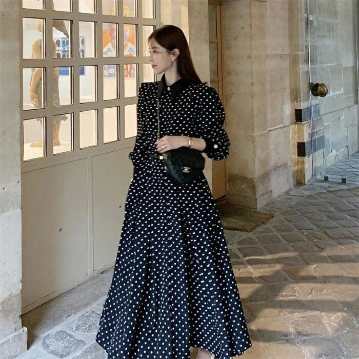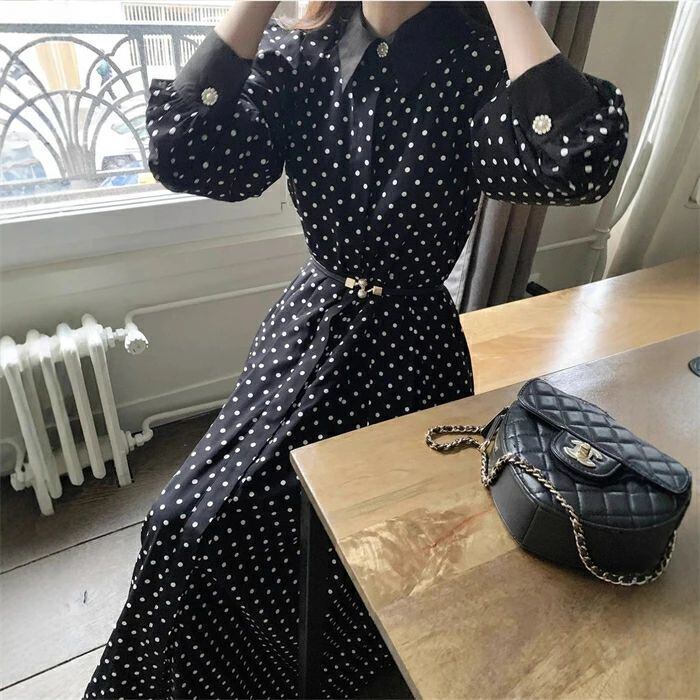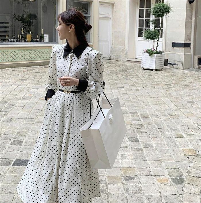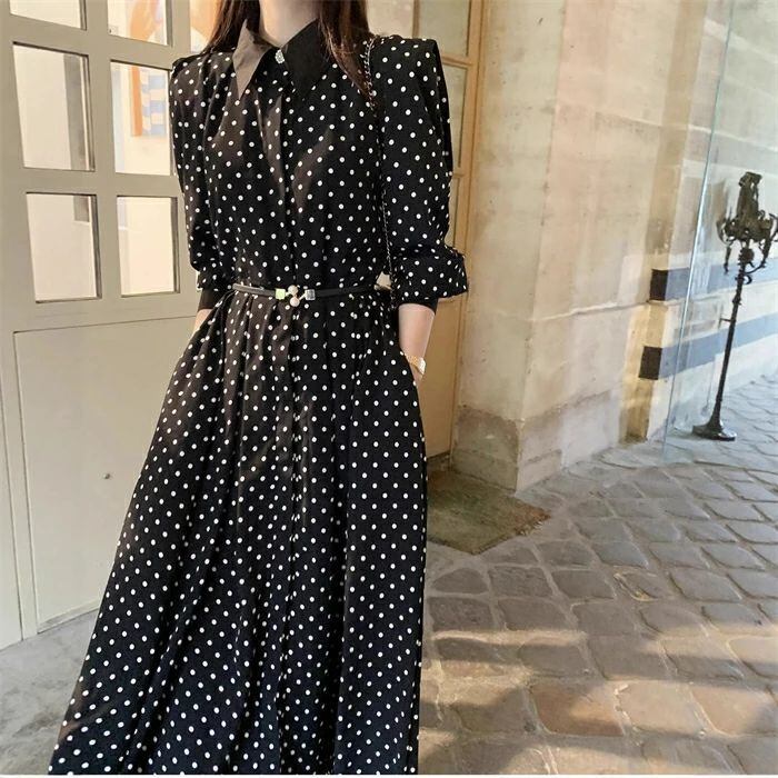 ワンピース ロングワンピース レディース 秋新作 シャツワンピース ワンピ ロング丈 長袖 ドット柄 水玉 Aライン 配色 折襟 ベルト付き 春