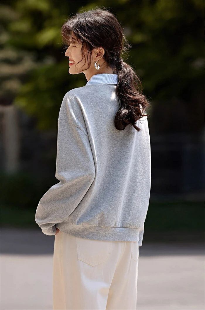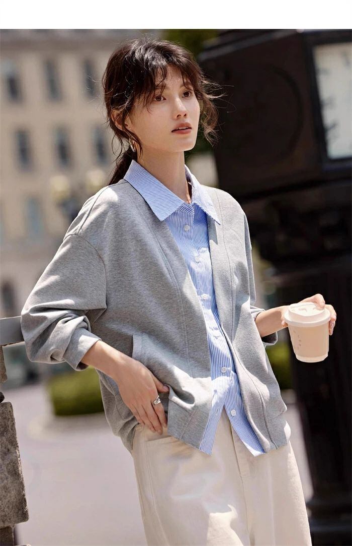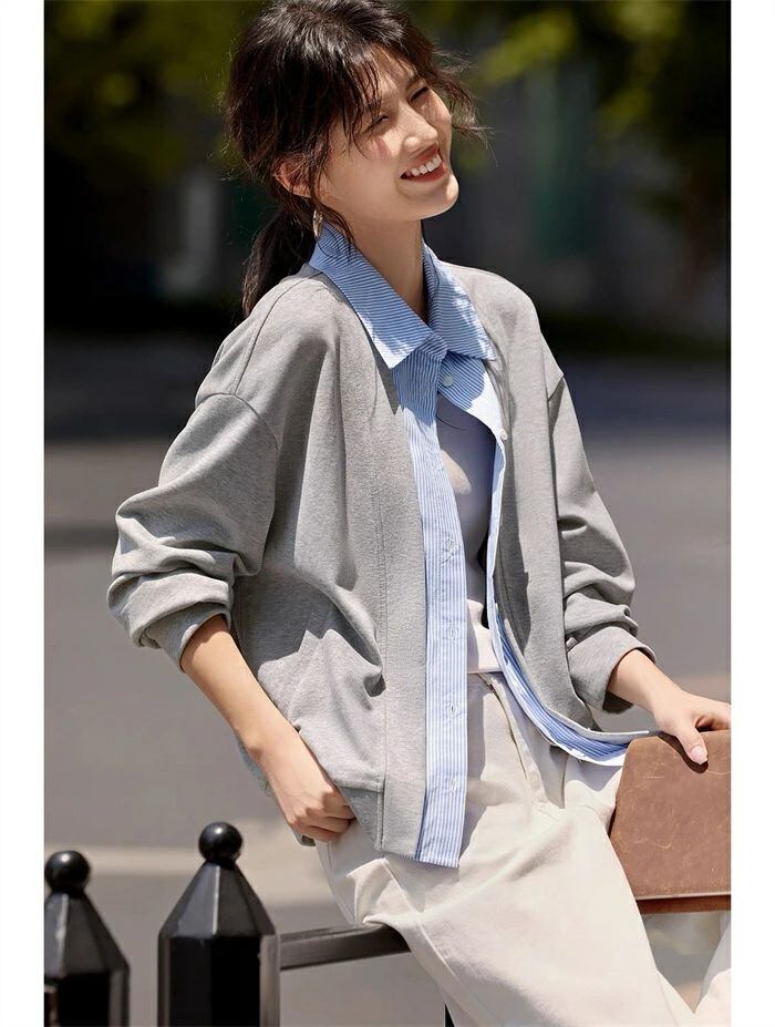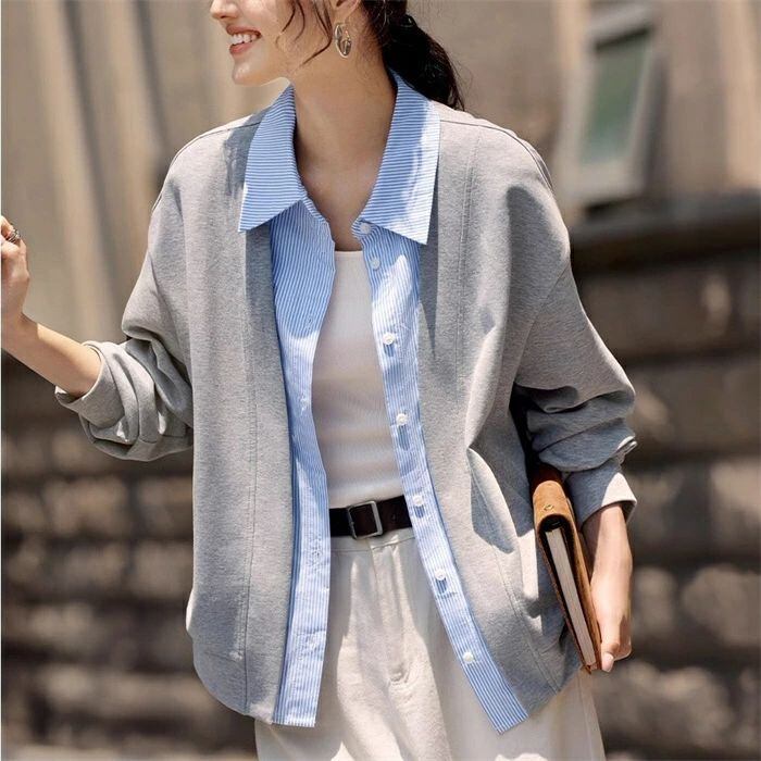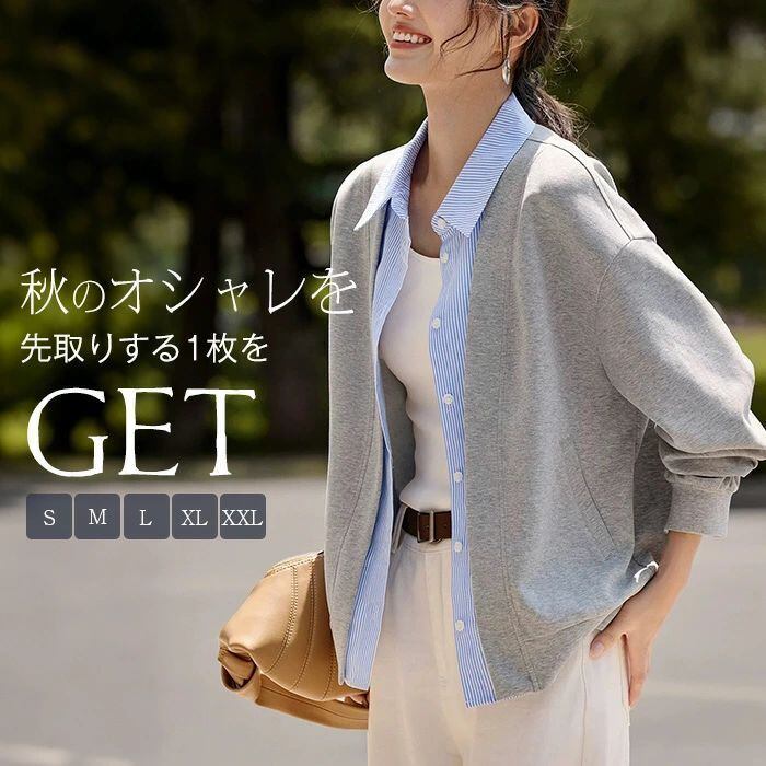カーディガン スタジャン ジャケット 秋 春 レディース スウェット トレーナー トップス アウター ライトアウター カジュアル ライトコート 薄手 羽織り コート フェイクレイヤード シャツ襟 大人 大きいサイズ ゆったり 体型カバー 着痩せ 無地 30代 40代 50代 送料無料