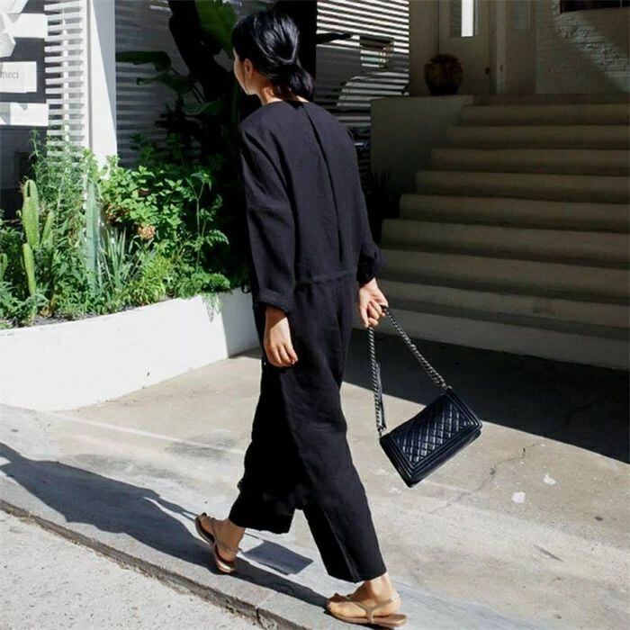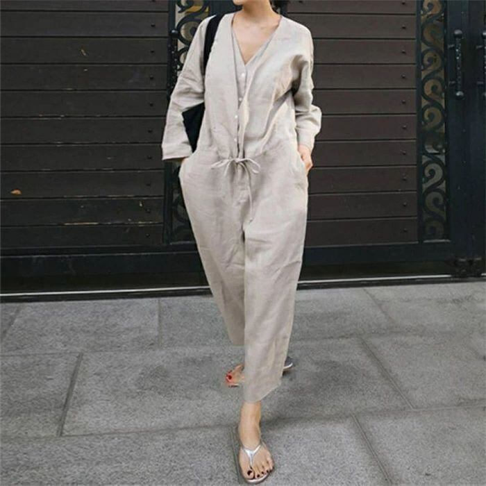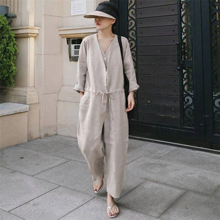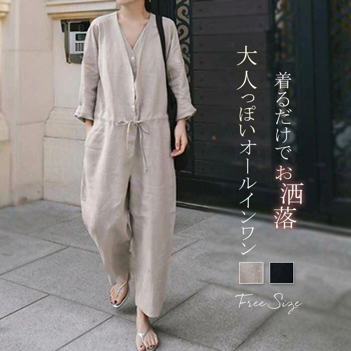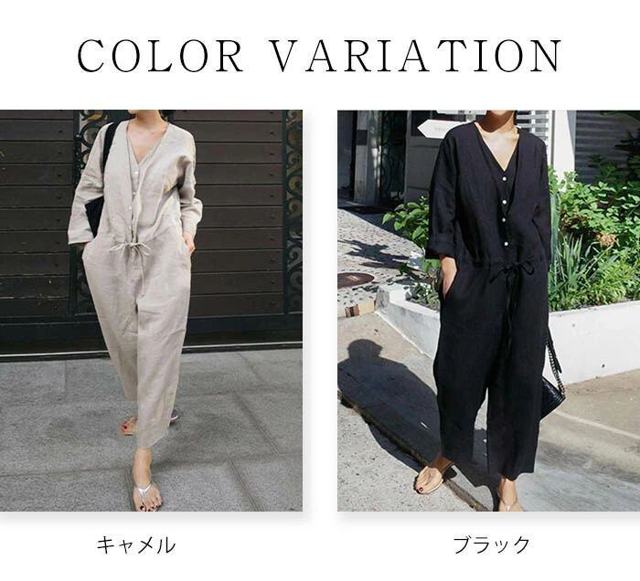 オールインワン サロペット レディース つなぎ 春 秋 連体服 オーバーオール 長袖 ロングパンツ 九分丈 Vネック 無地 綿麻風 古着風 マタニ
