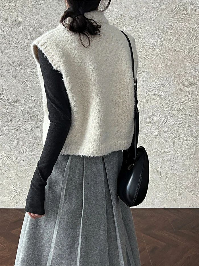ニットベスト ベスト レディース ニット 立ち襟 前開き 重ね着 トップス ノースリーブ レイヤード 無地 シンプル ウール混 上着 カットソー