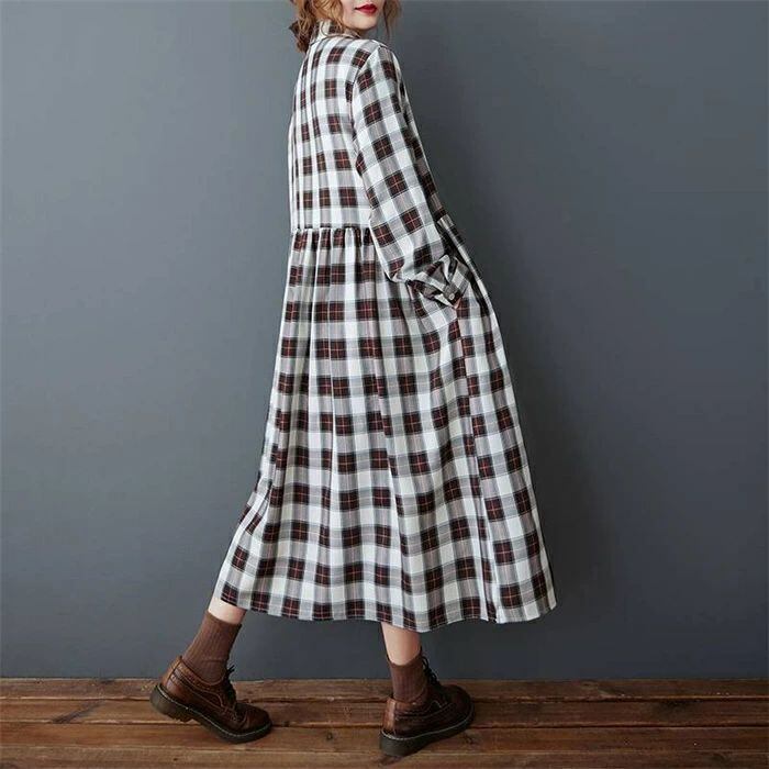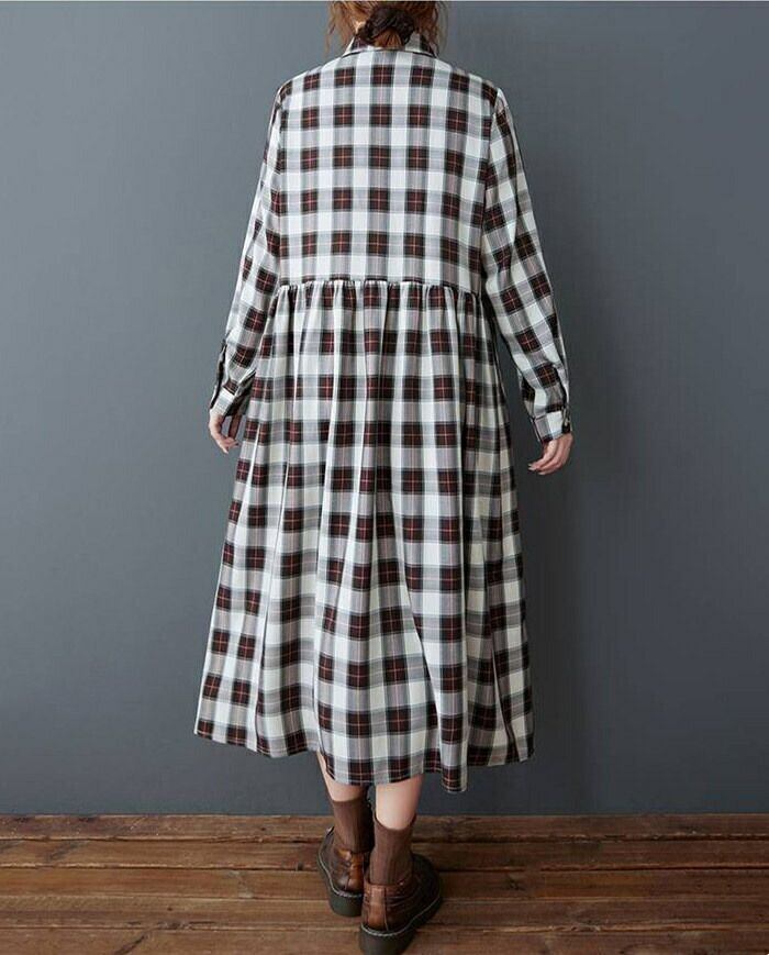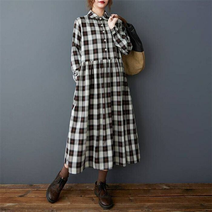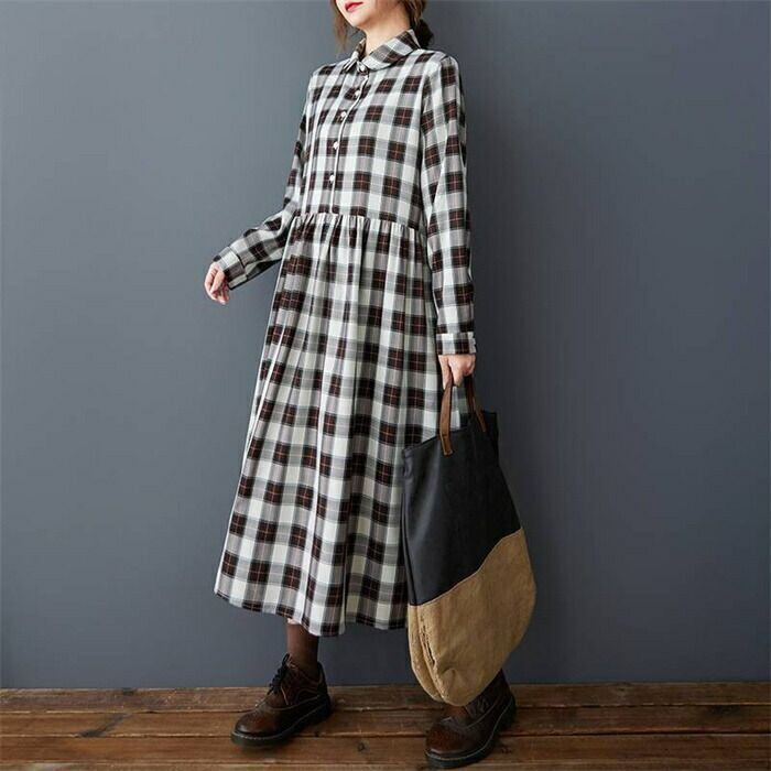 ワンピース シャツワンピース チェック柄 レディース 春秋 ワンピ シャツワンピ ロングワンピース 長袖 チェックワンピース ロング丈 大きいサイズ フレア 折襟 ゆったり 体型カバー 着?せ 森ガール カジュアル おしゃれ シンプル 通勤OL 通学 20代 30代 40代 50代