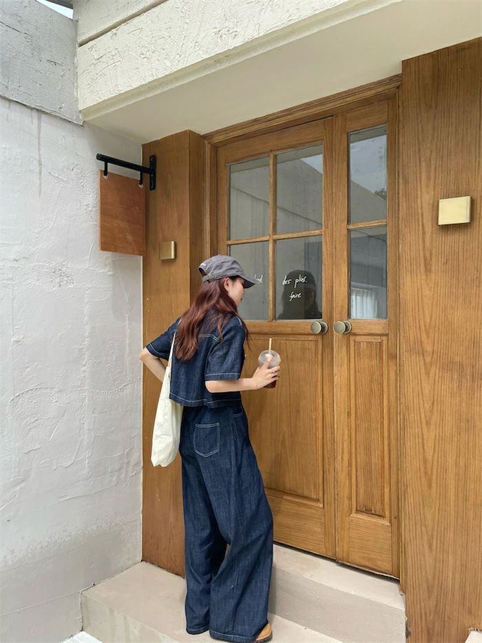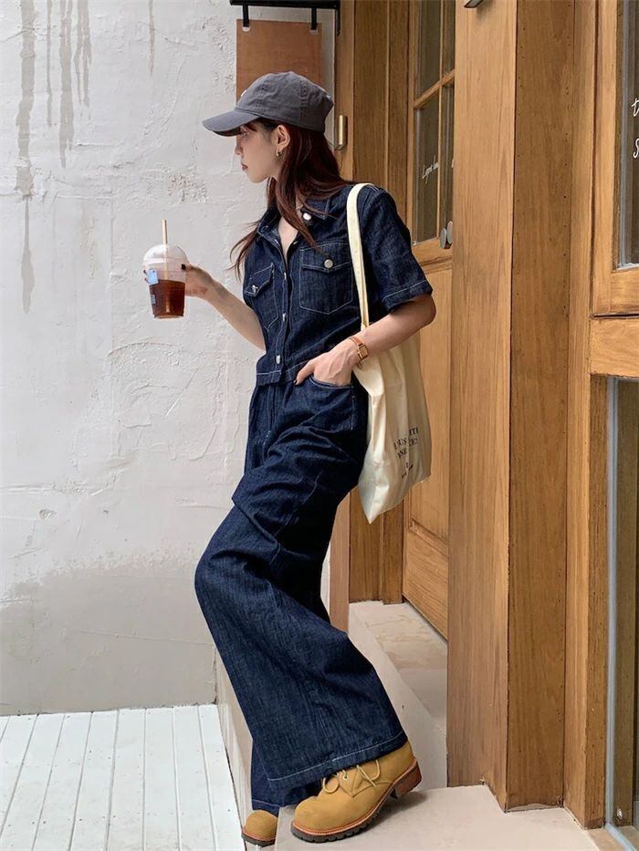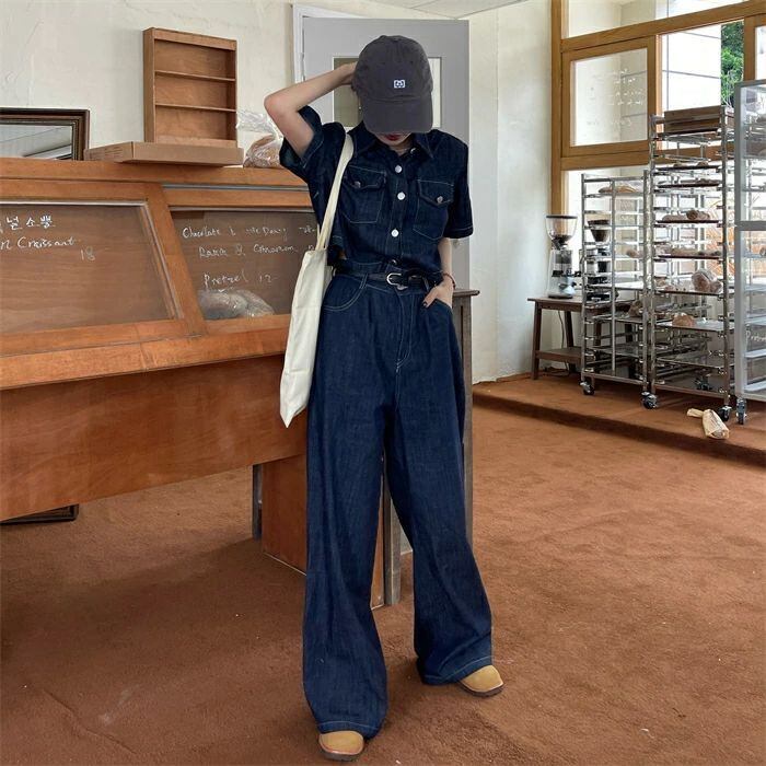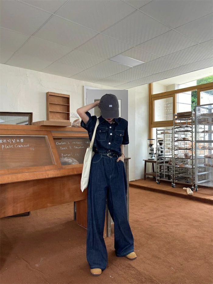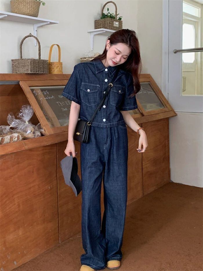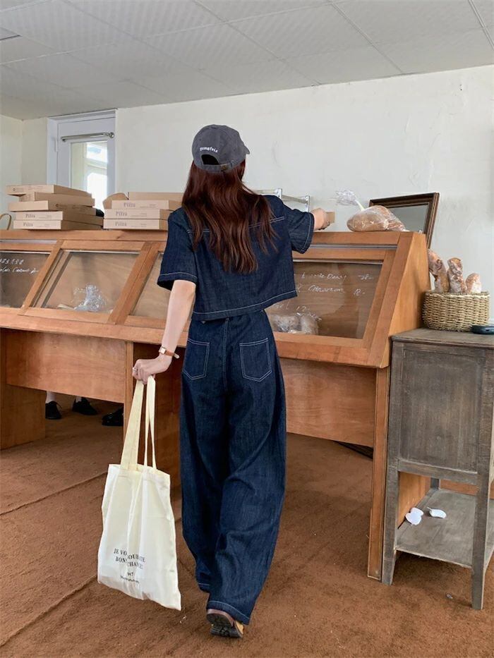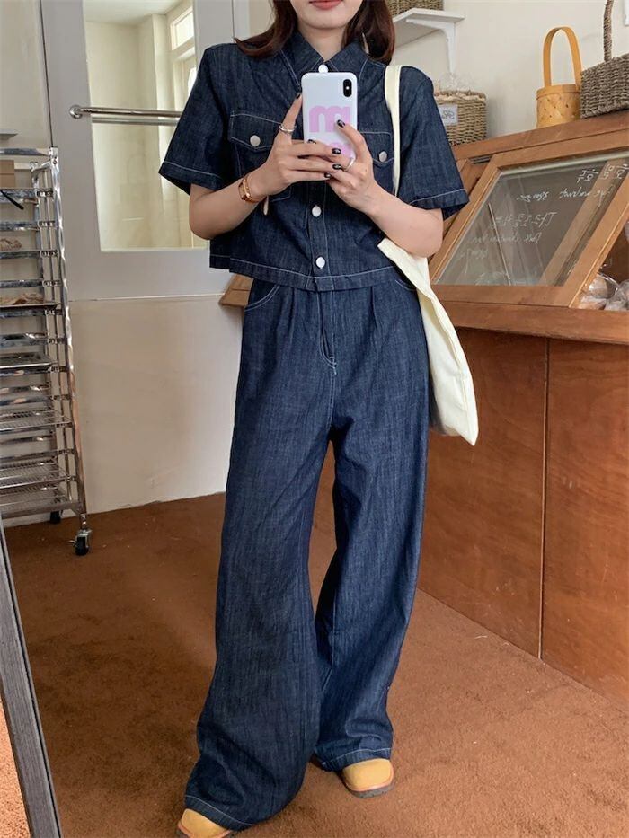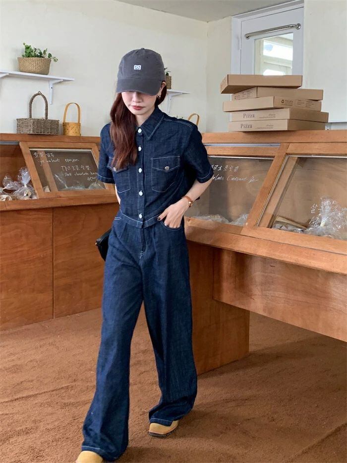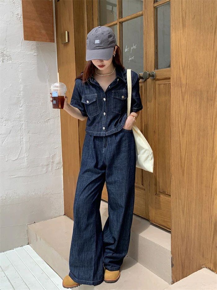 セットアップ デニムセットアップ レディース 春夏 2点セット 綿 デニム 半袖シャツ デニムシャツ 半袖 無地 ワイドパンツ デニムパンツ ゆ