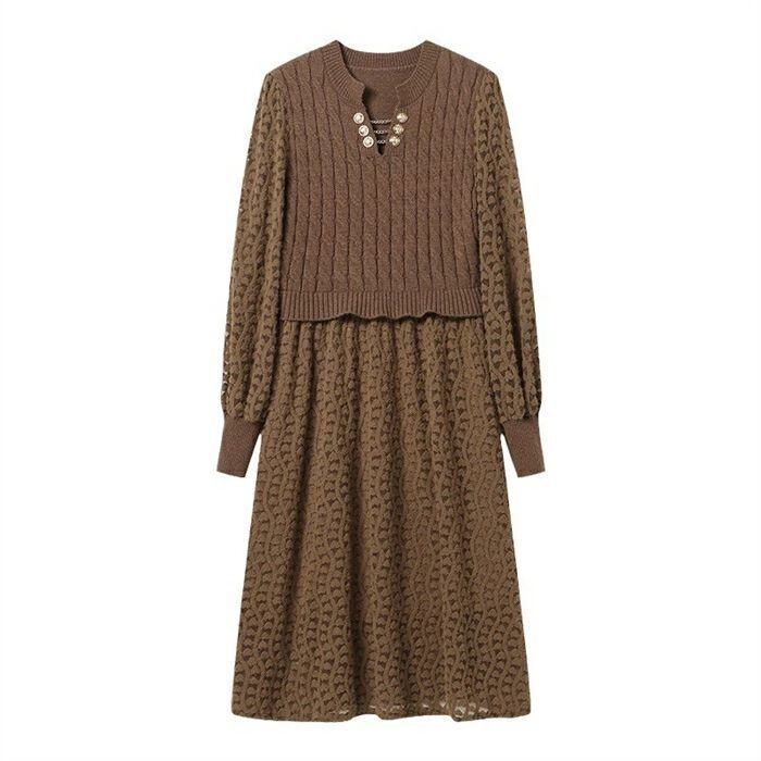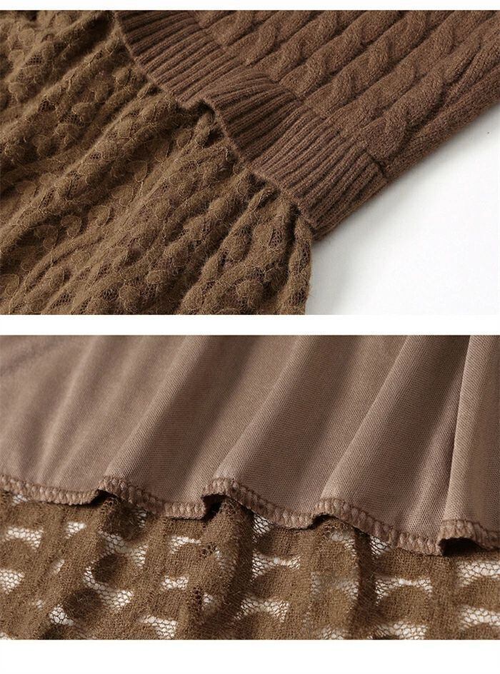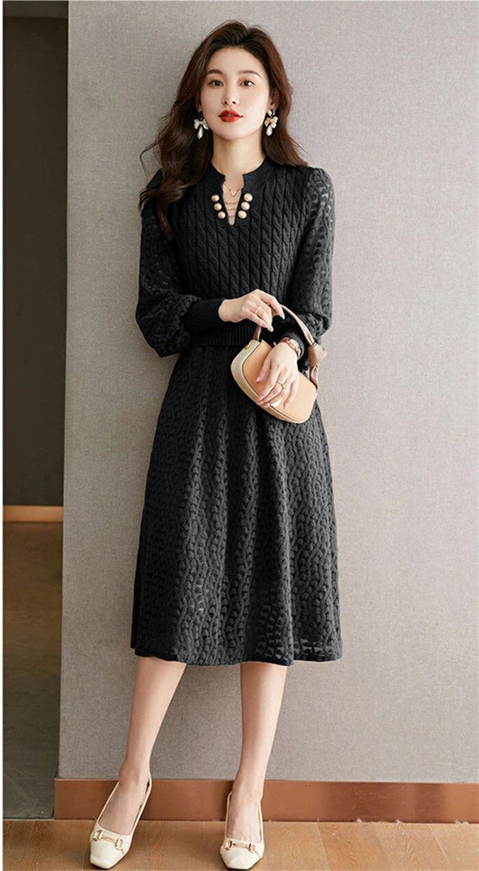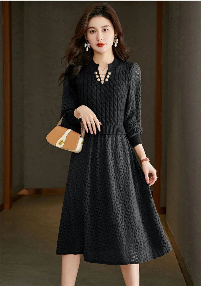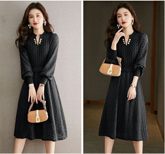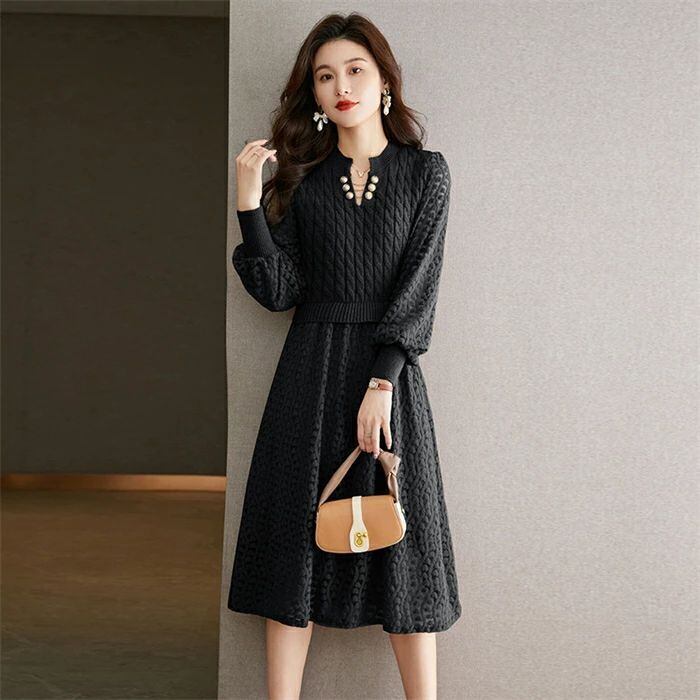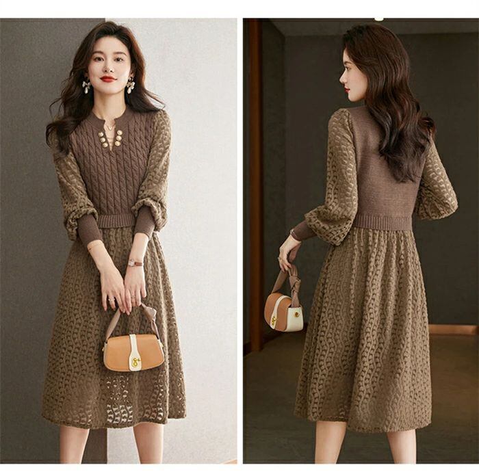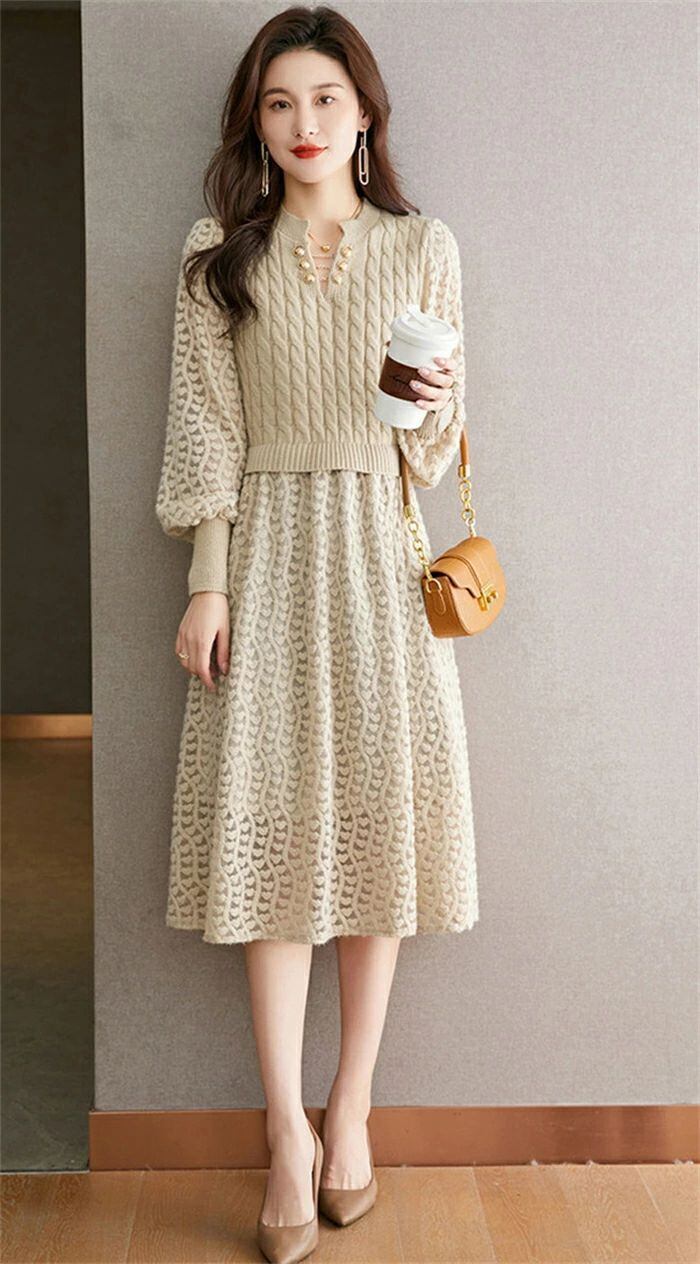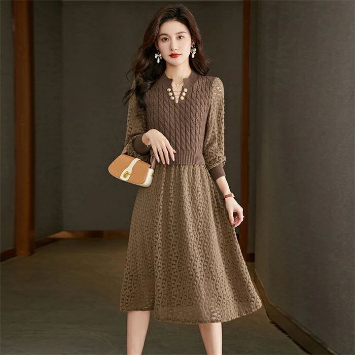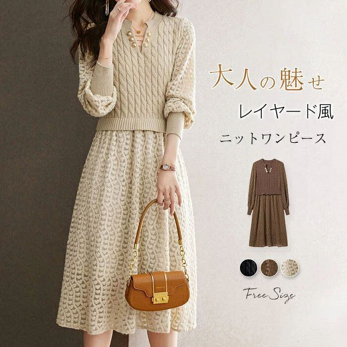 ワンピース ニットワンピース レディース 40代 秋冬 長袖 膝丈 ミモレ丈 ニット Vネック レイヤード風 フレア ロング丈 切り替え 透かし編