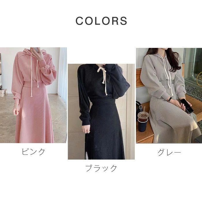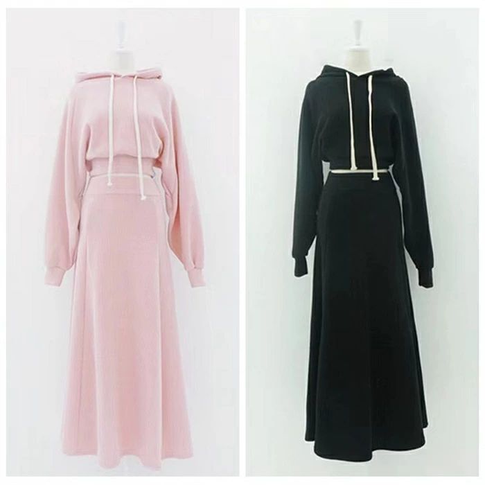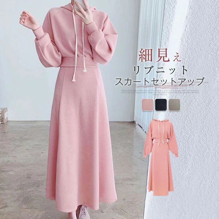 セットアップ レディース 春秋 スカートセットアップ 2点セット パーカー フード付き 長袖 リブ ロングスカート ウエストゴム スウェット