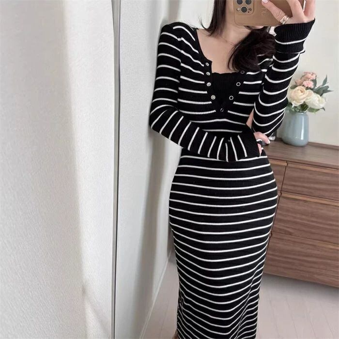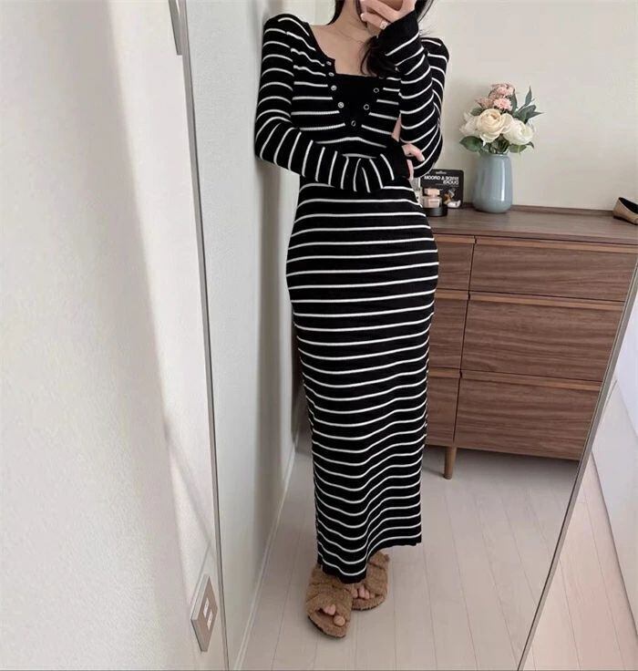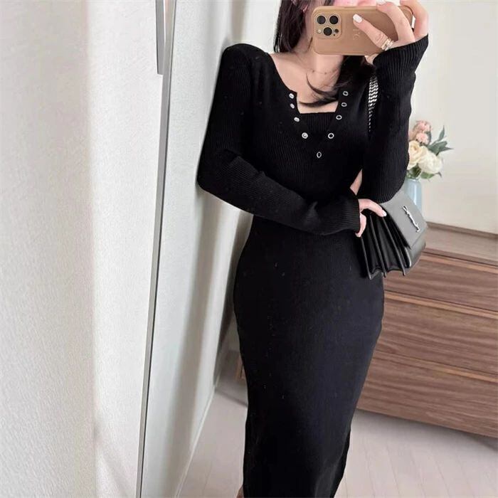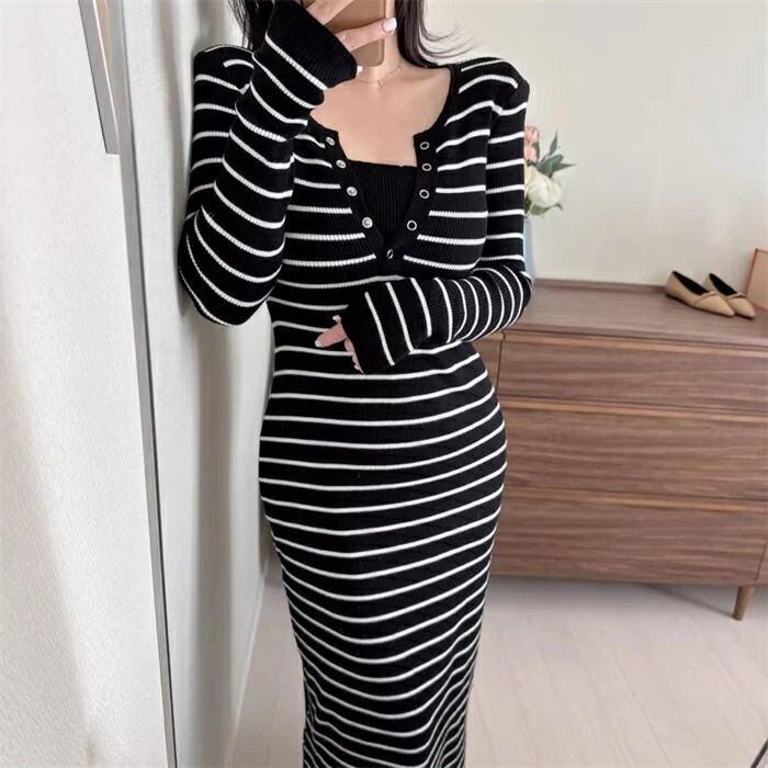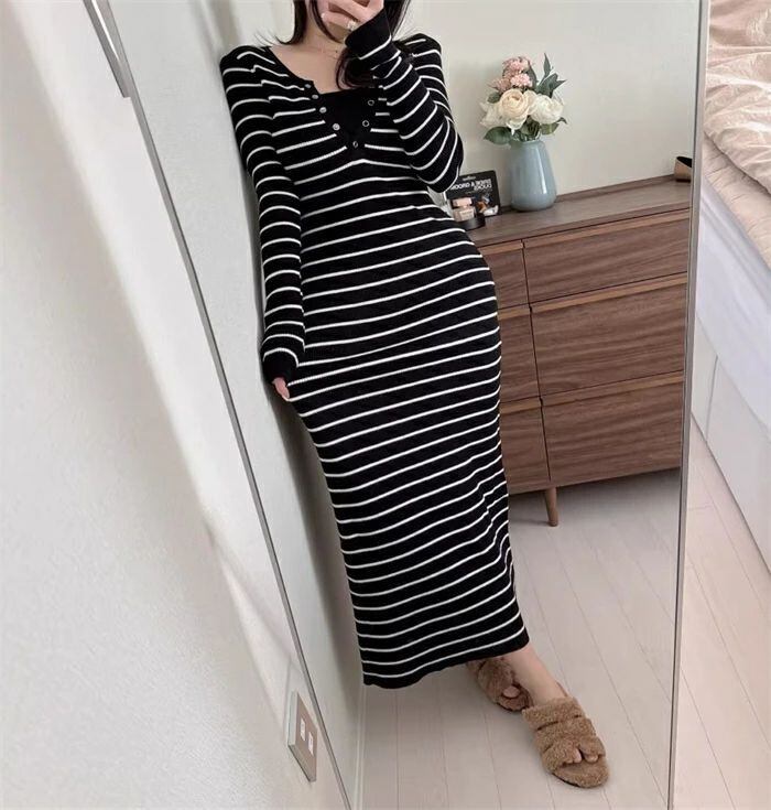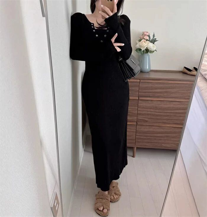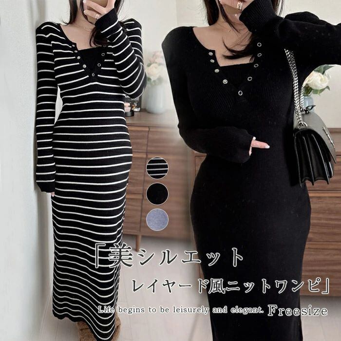 ニットワンピース タイト ワンピース ニット ニットワンピ レディース ワンピ タイトワンピ 秋冬 レイヤード風 ミモレ丈 きれいめ 結婚式