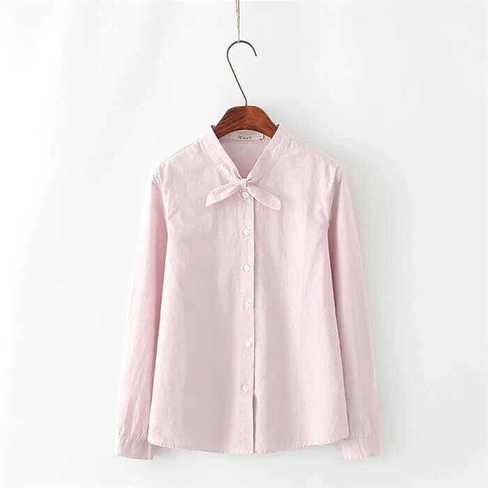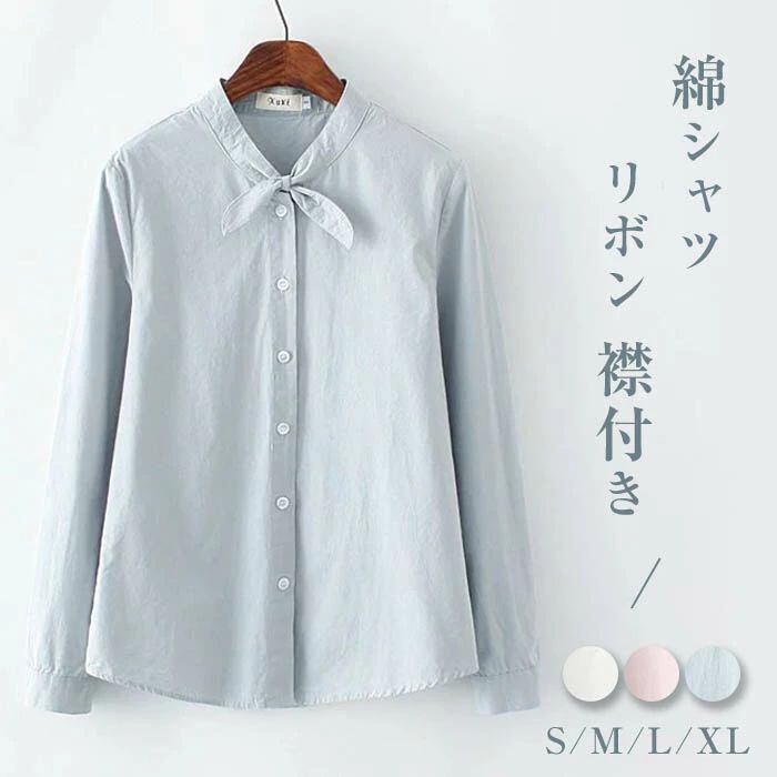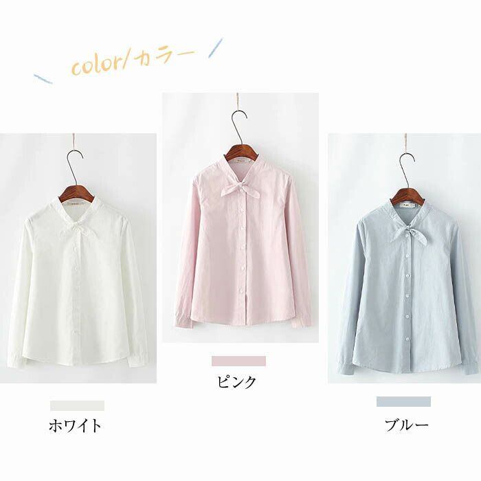 シャツ レディース 長袖 綿 チュニック 春 夏 秋 無地 リボン 襟付き ブラウス カジュアル ナチュラル 柔かい 3色 ホワイト S/M/L/XL 20代