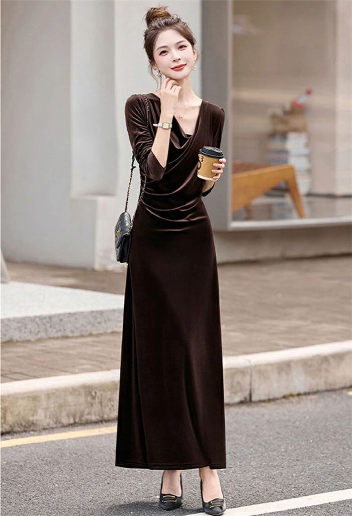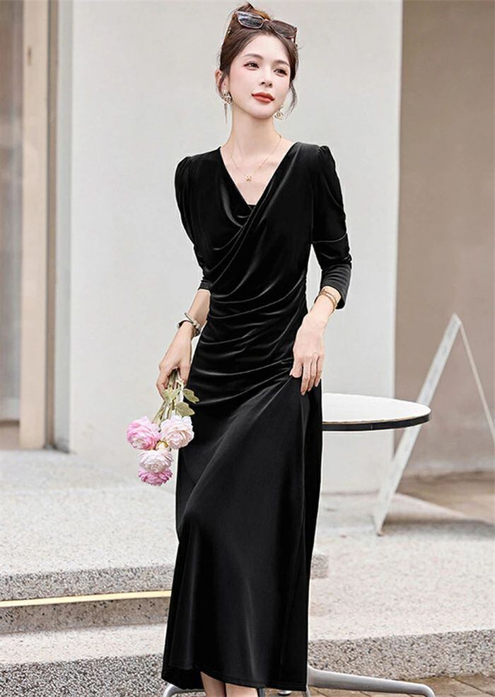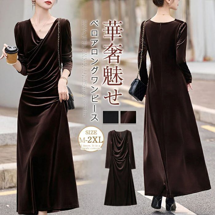 ワンピース ロングワンピース ベロアワンピース ワンピースドレス ドレス 秋冬ワンピース 美シルエット ベロア レディース 秋冬 長袖 無地