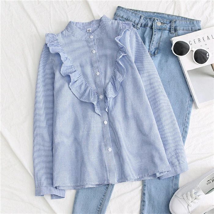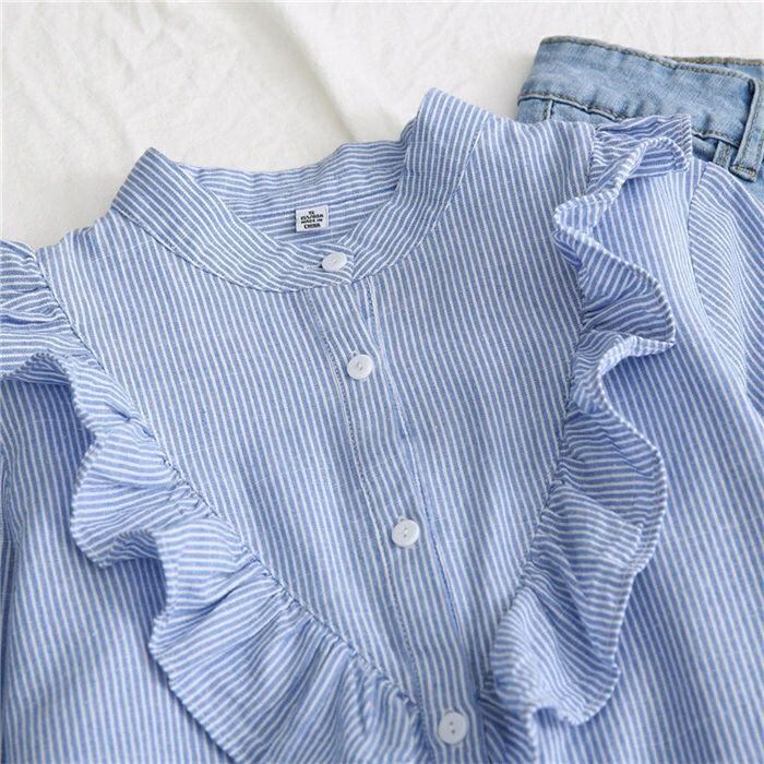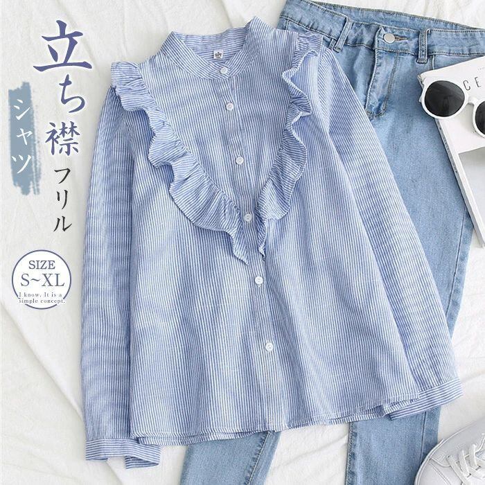 シャツ 綿シャツ レディース 春秋 シャツブラウス ストライプ柄 綿 フリル 立ち襟 長袖 コットン 可愛い ブラウス トップス レイヤード 重