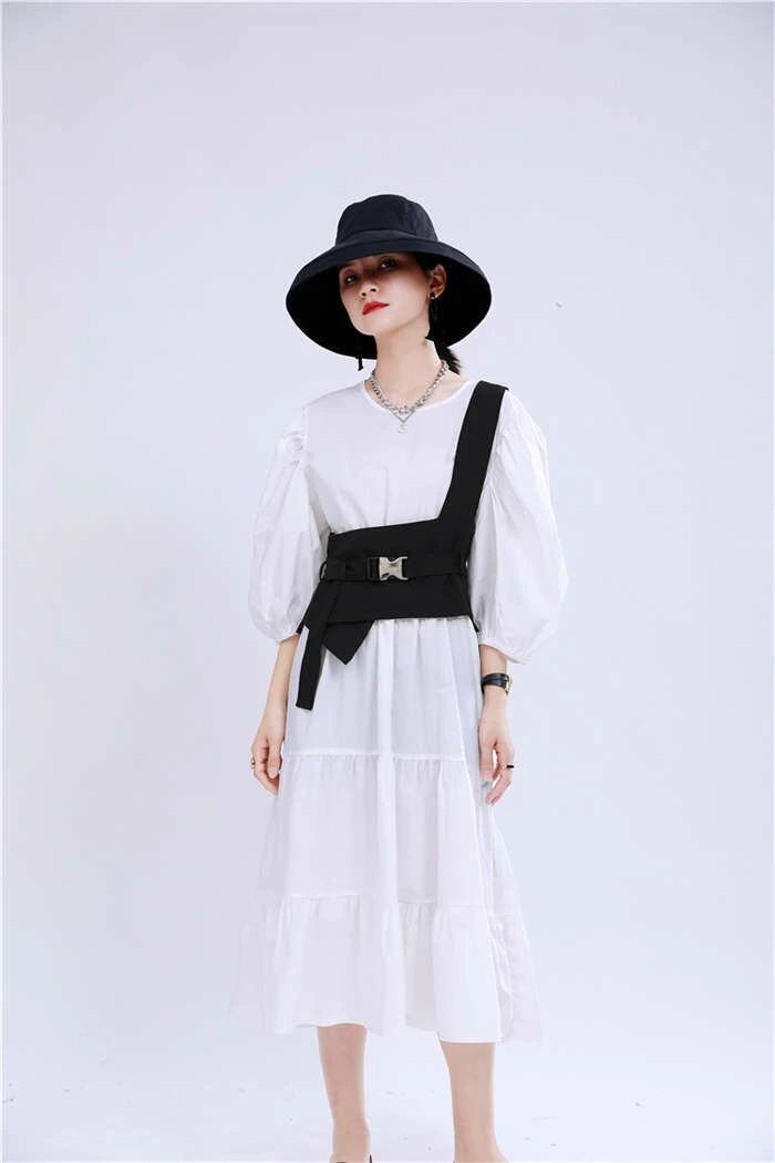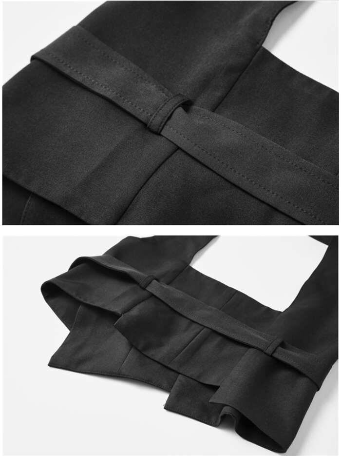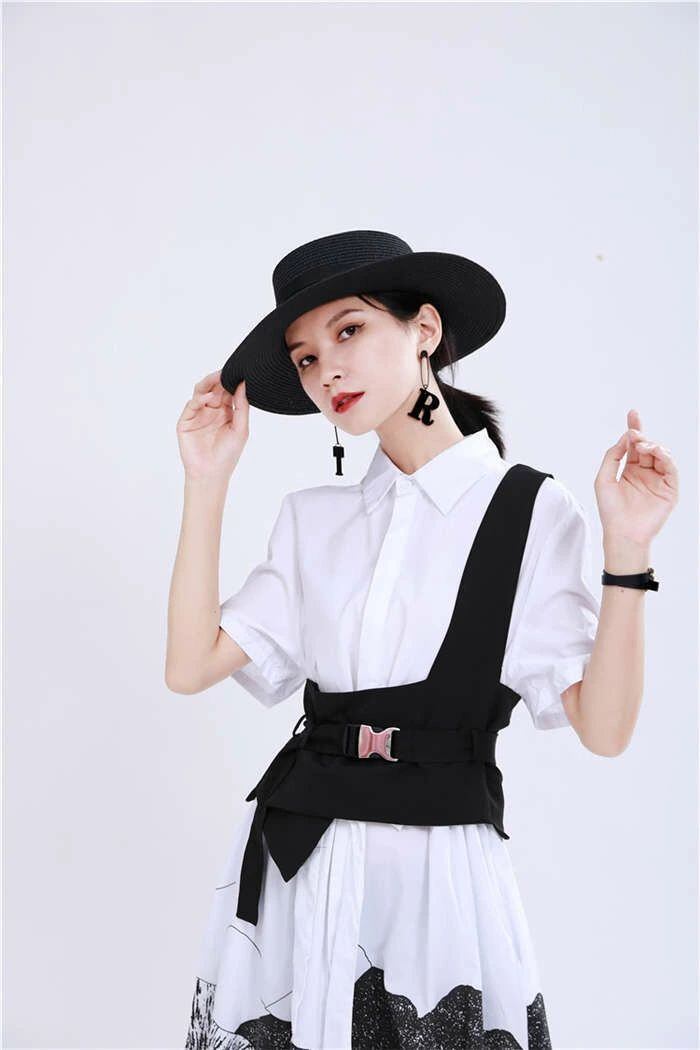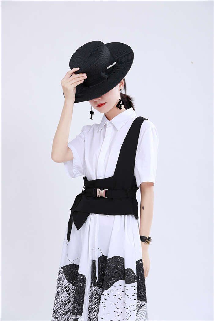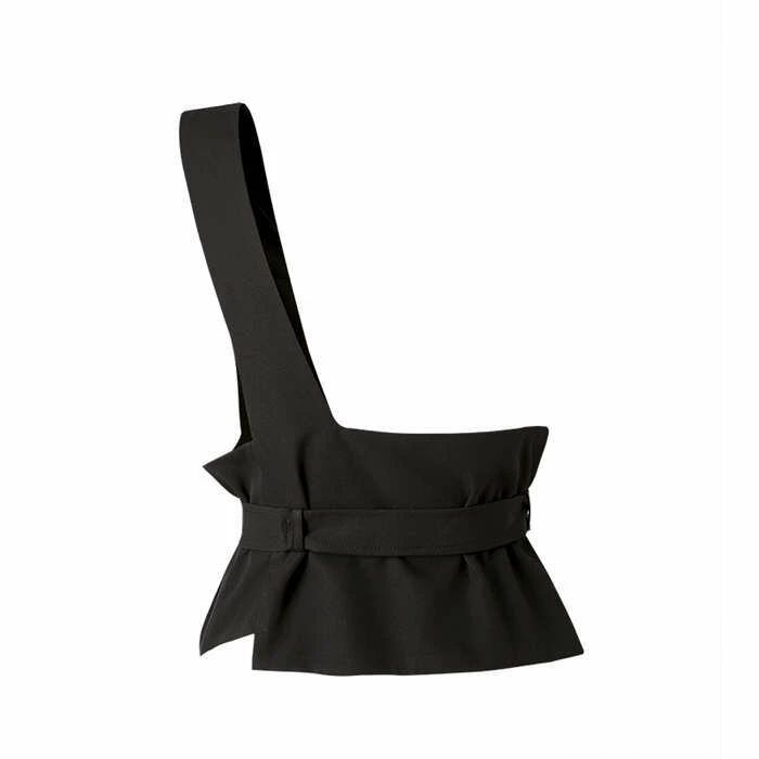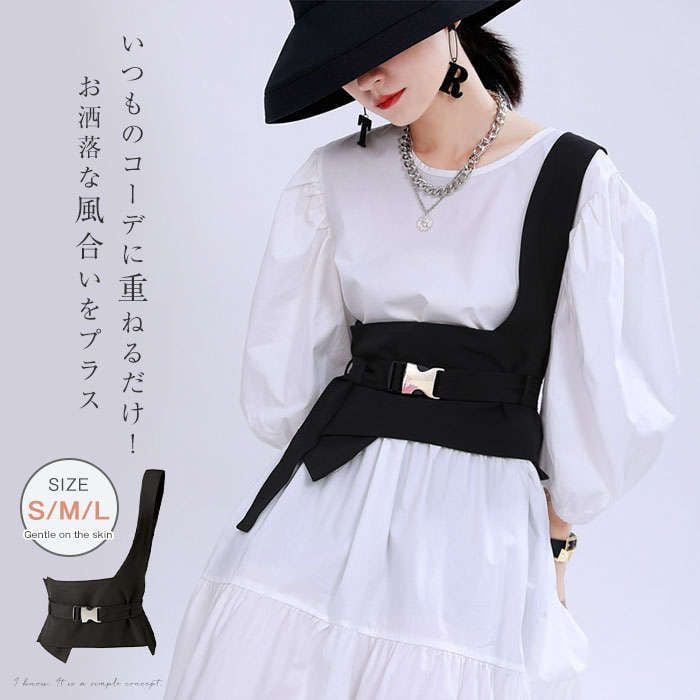 オリジナルデザイン ジレ ベスト レディース イレギュラーヘム 変形 個性的 コルセットベルト ワンショルダー トップス レディース アシンメトリー トップス 重ね着 チュニック ベスト レイヤード風 OL 通勤 ブラック 送料無料 20代 30代 40代