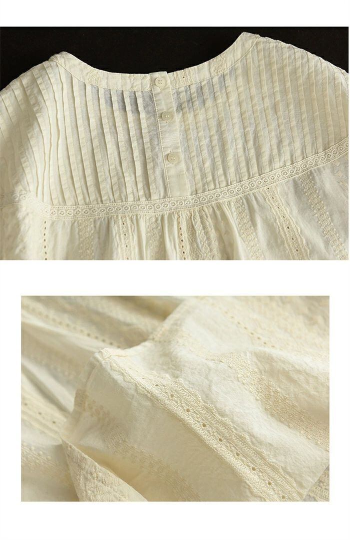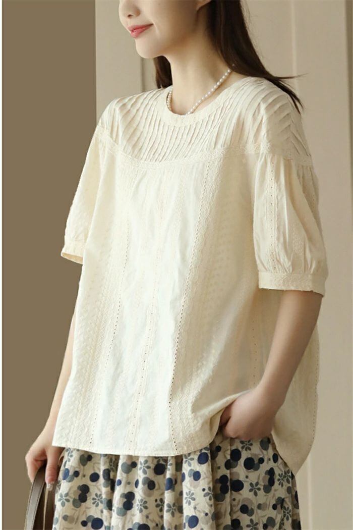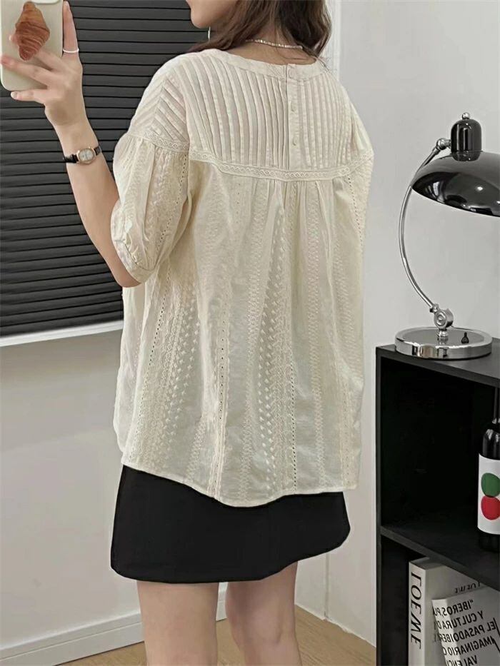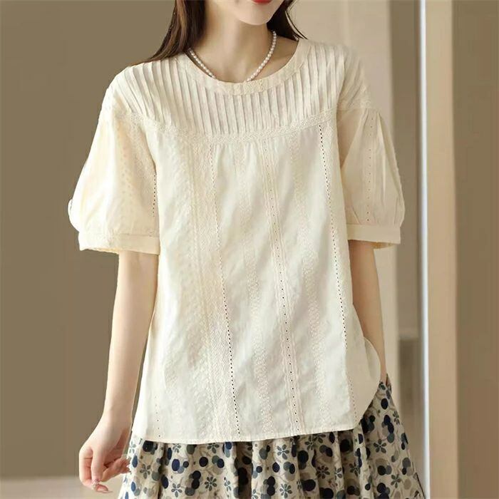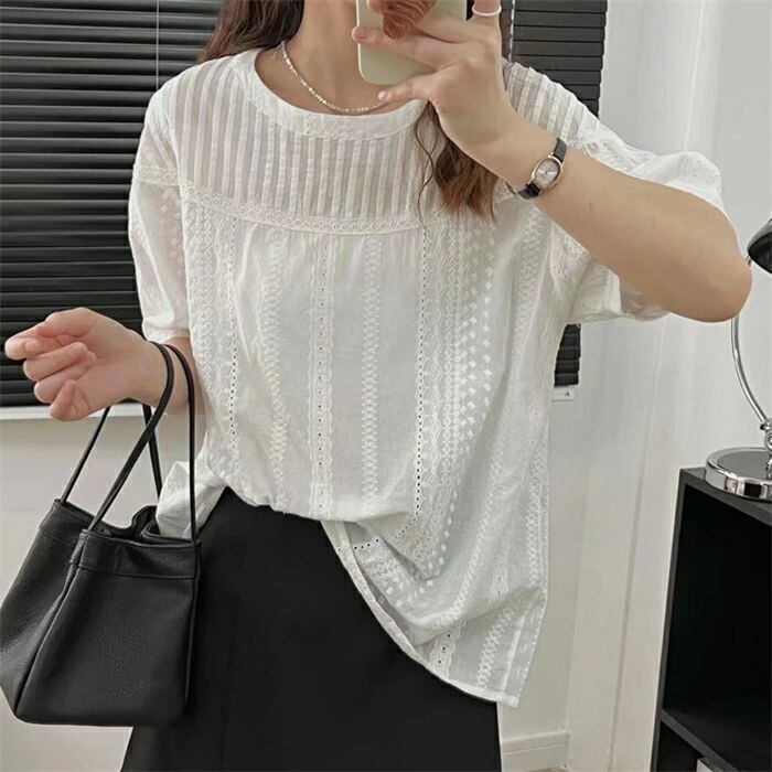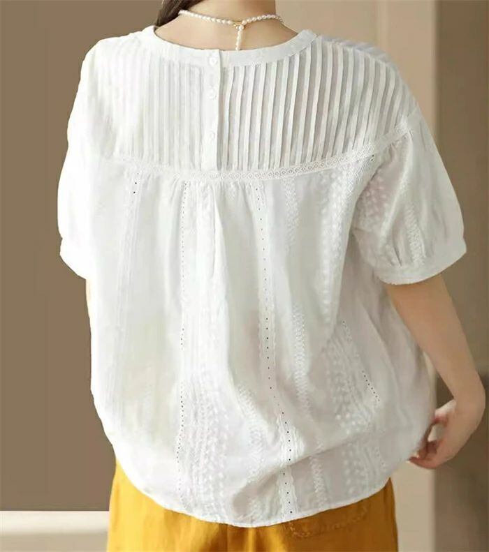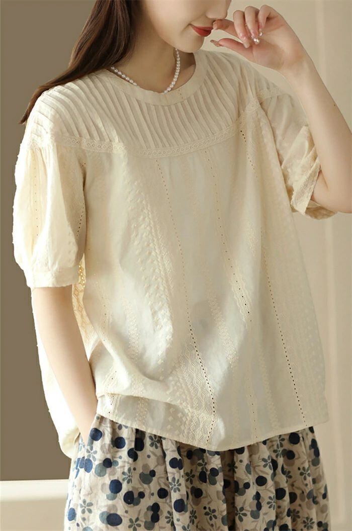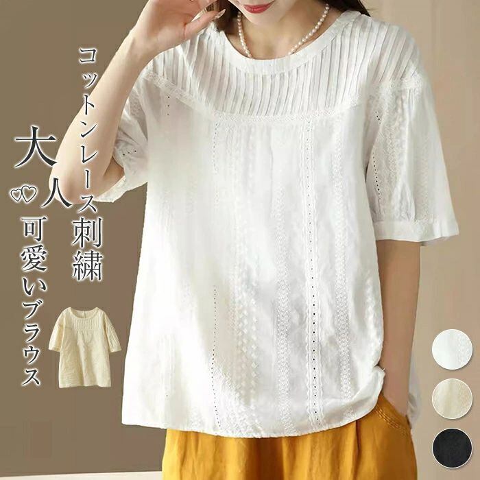 ブラウス レディース 春夏新作 おしゃれ 半袖 ブラウス レディース 半袖 オフィス 綿100% クルーネック 刺繍ブラウス レース 刺繍 トップス 森ガール コットン きれいめ シャツ オフィス プリーツ 切り替え 透け感 着痩せ ゆったり 柔らか 大人 可愛い お洒落 春 夏 シンプル カジュアル 通勤 上品 白 黒 ベージュ トップス 通勤 着痩せ 上品 ゆったり 30代 40代 50代 新作 送料無料