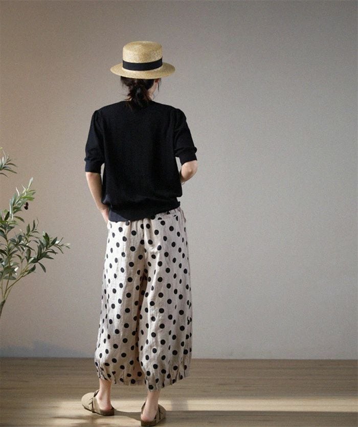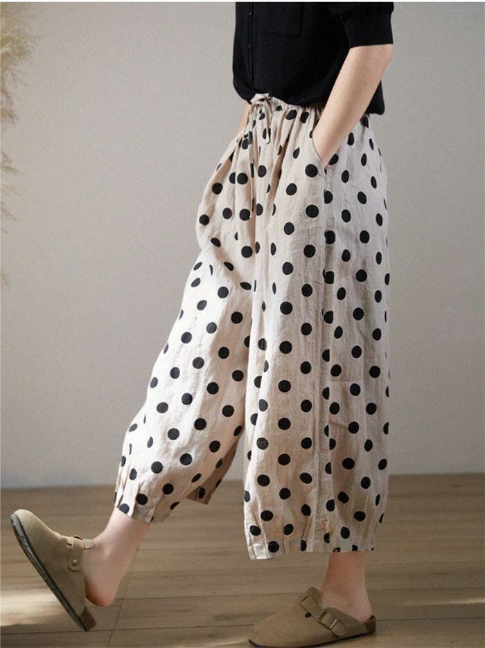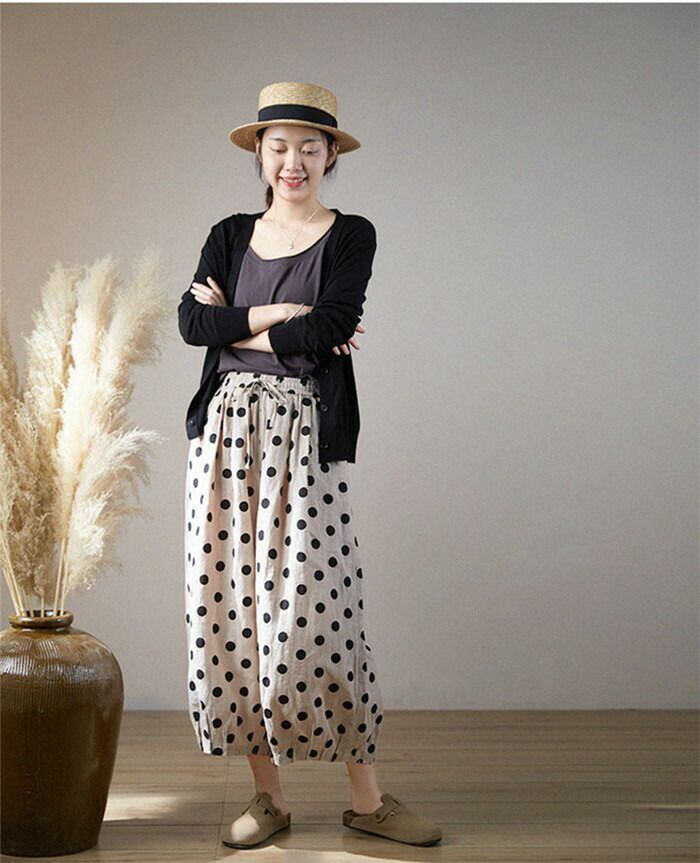 ガウチョパンツ ワイドパンツ レディース 綿麻 パンツ 春 秋 夏 パンツ ボトムス 九分丈 ゆったり 麻混 ウエストゴム ファッション ドット柄 涼しい 通勤 30代 40代 50代 無地 ロング丈 おしゃれ ナチュラル 着やせ 美脚