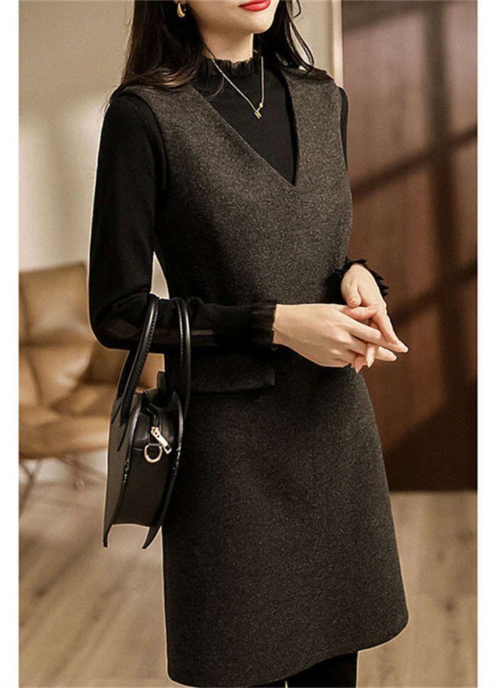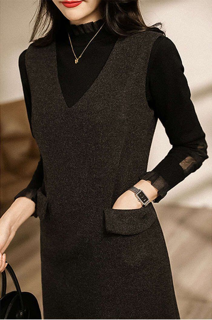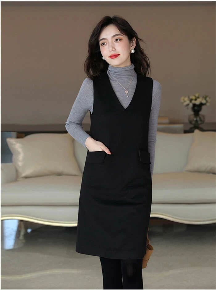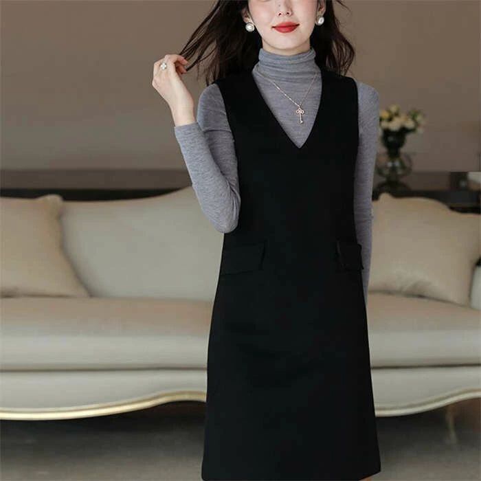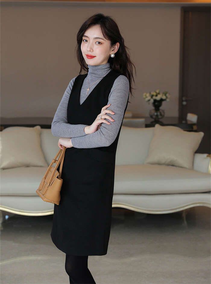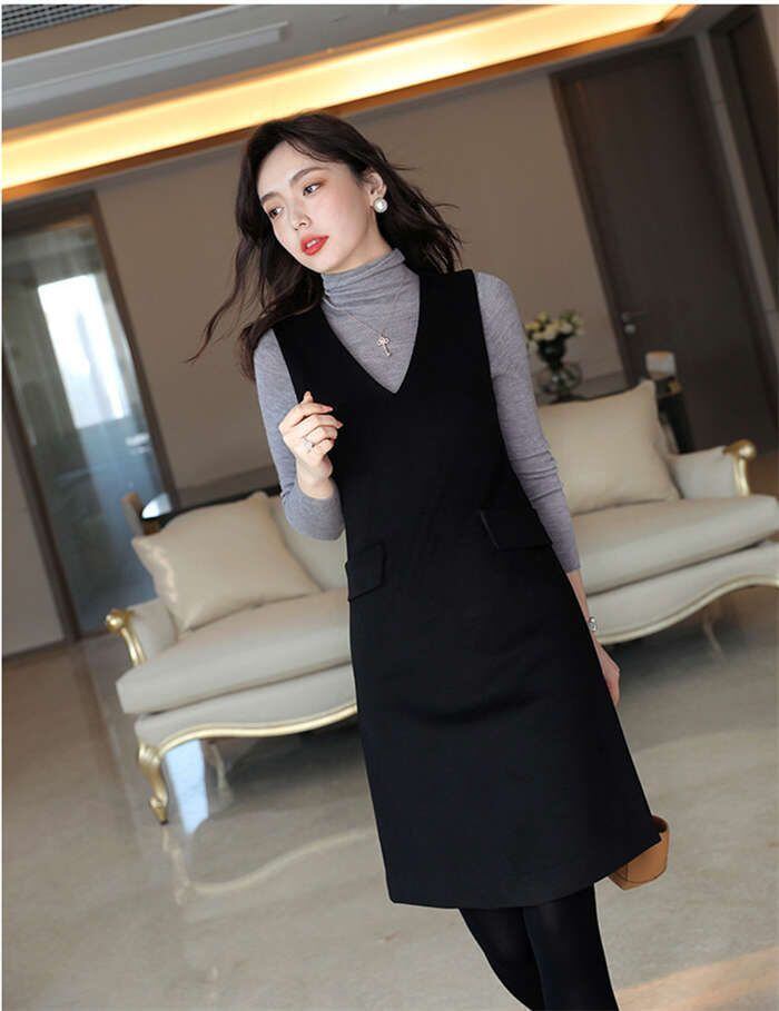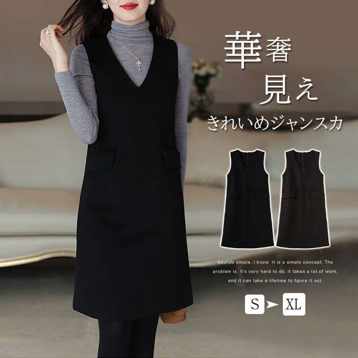 ジャンパースカート 秋 冬 ワンピース きれいめ Vネック ノースリーブ 無地 レディース オールインワン 膝丈 大人 大きいサイズ ジャンスカ