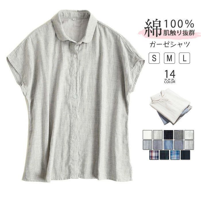 ガーゼ シャツ レディース ガーゼシャツ 春 夏 ガーゼ コットンシャツ ガーゼ シャツ ガーゼ フレンチスリープ シャツ 丸襟 トップス 半袖