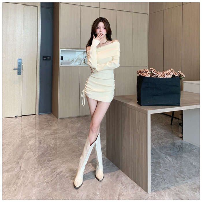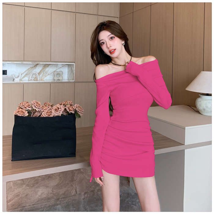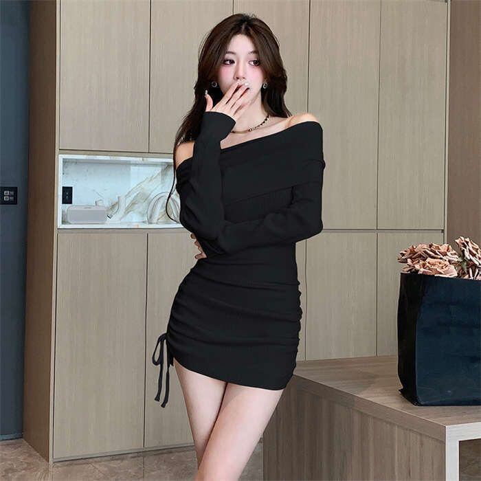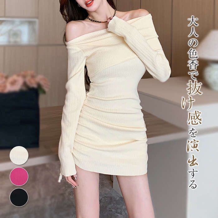 ニットワンピース リブニットワンピ 春 秋 ストレッチ 伸縮性 長袖 オフィス シンプル OL オフショルダー 着回し 膝上 ニット ワンピース