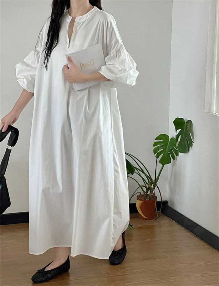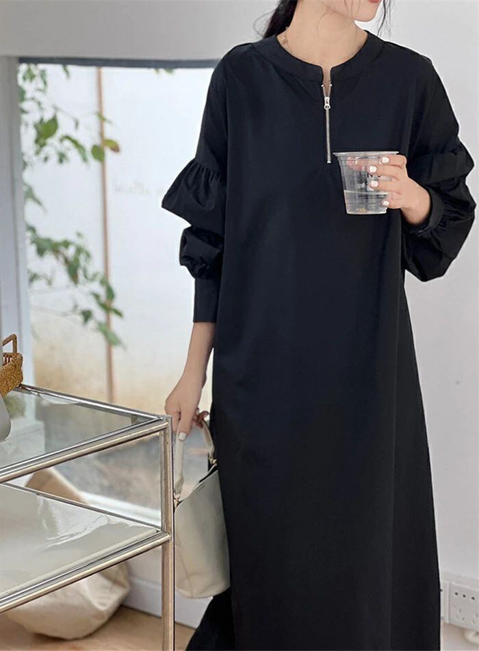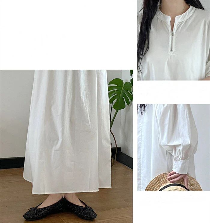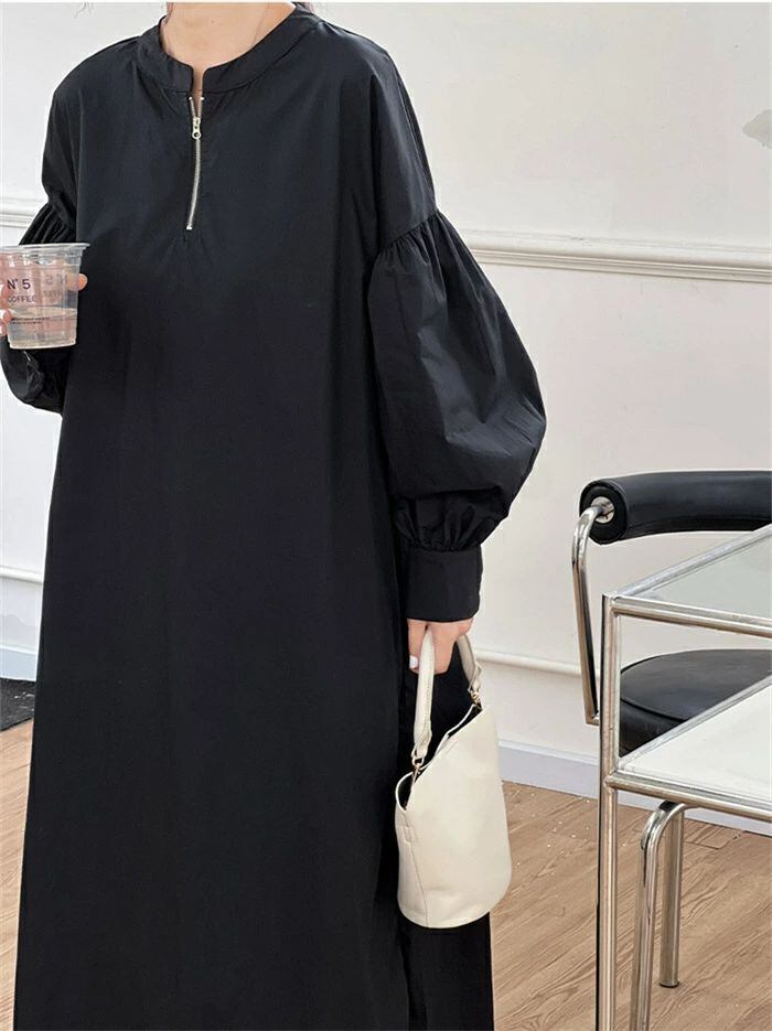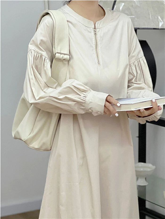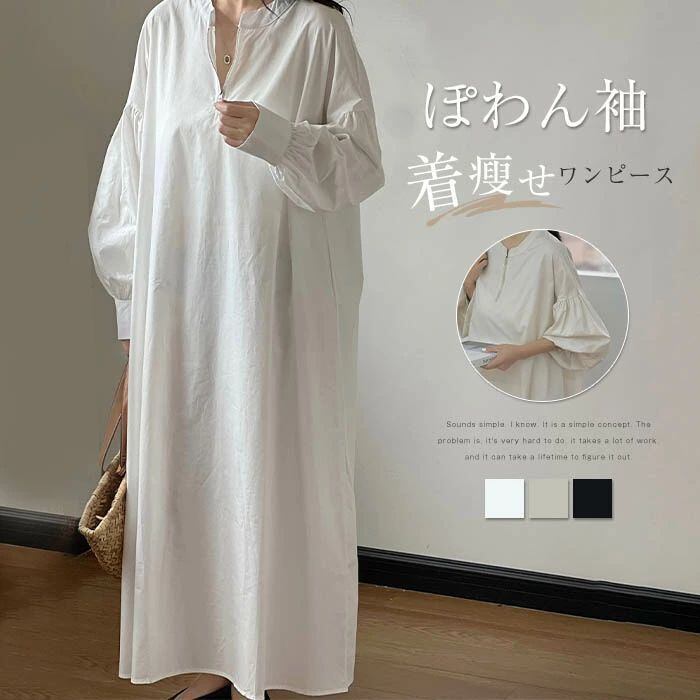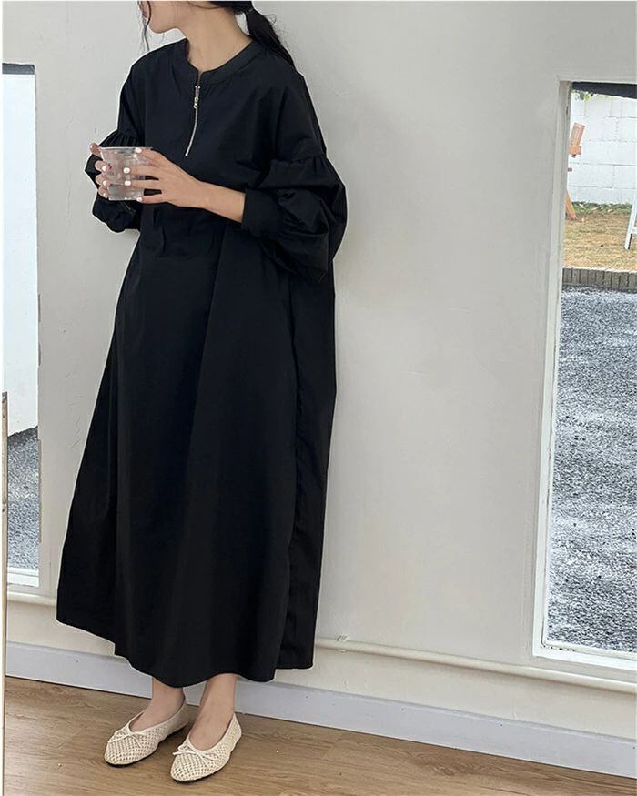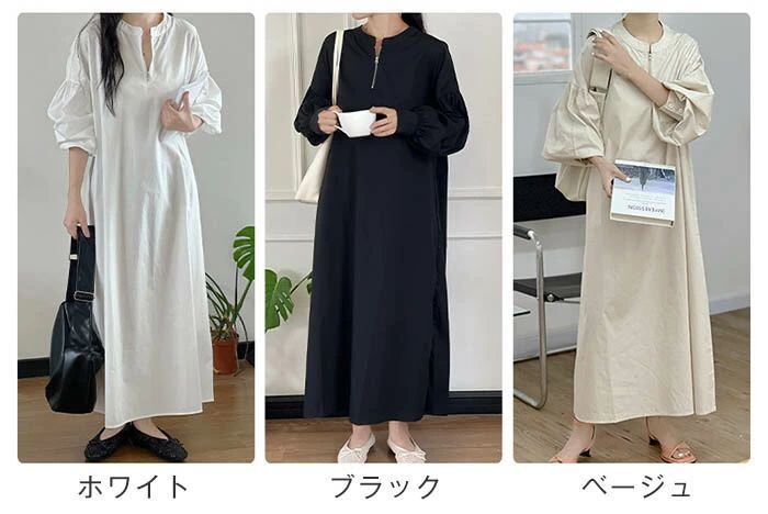 ワンピース レディース 春秋 ロングワンピース 長袖 ハーフジップ ロング丈 ぽわん袖 夏 立ち襟 マキシワンピース マキシ丈 春服 ボリュー