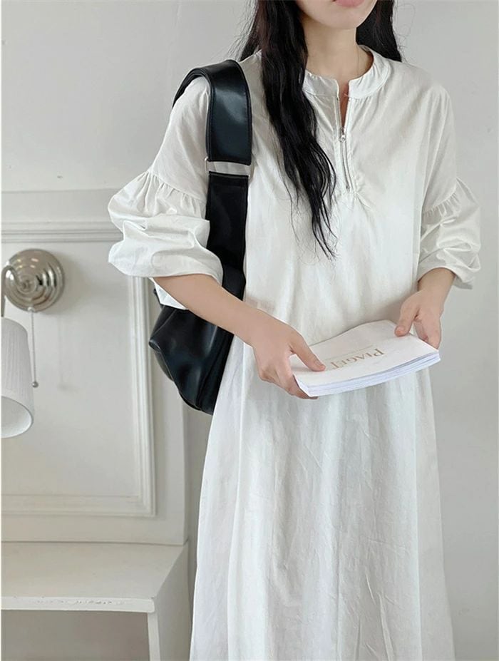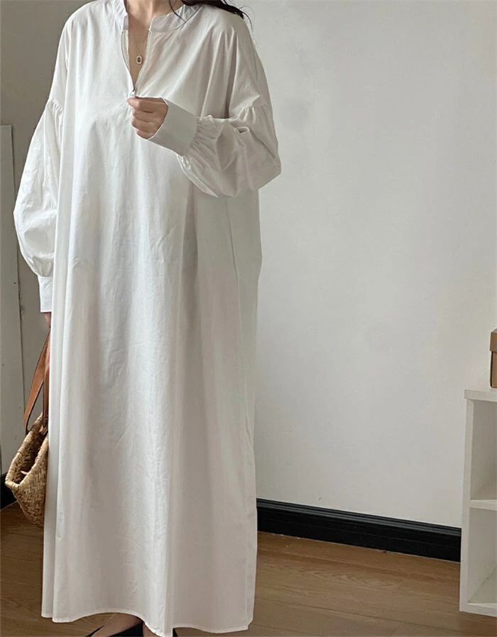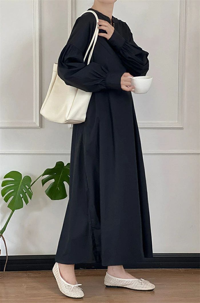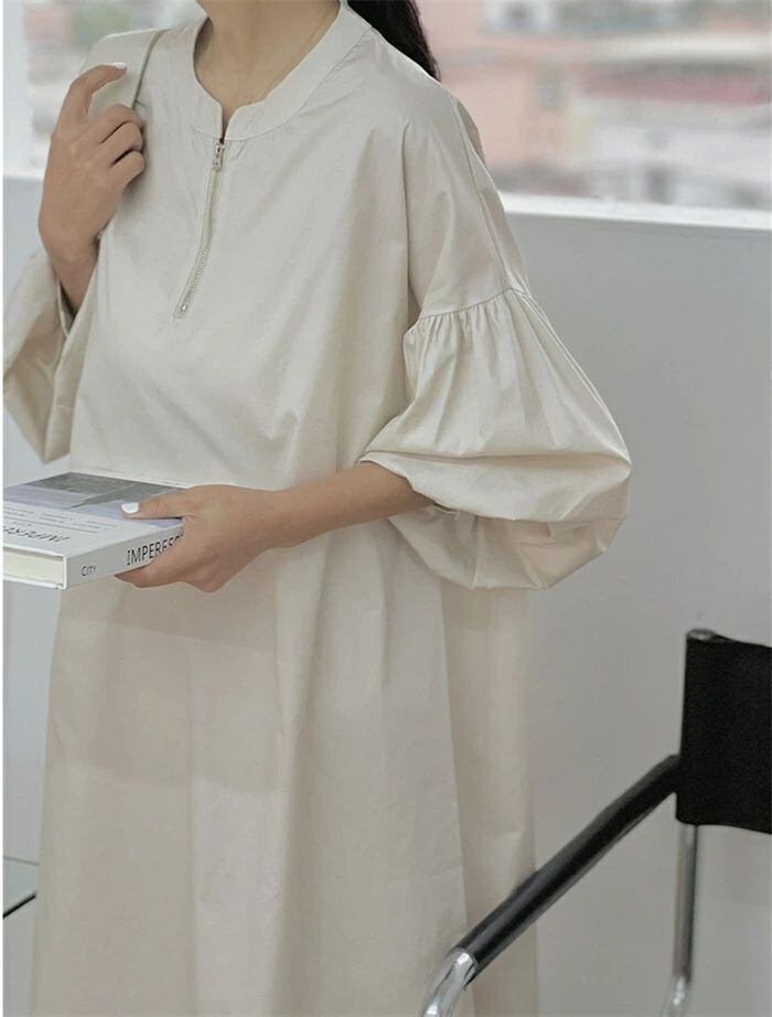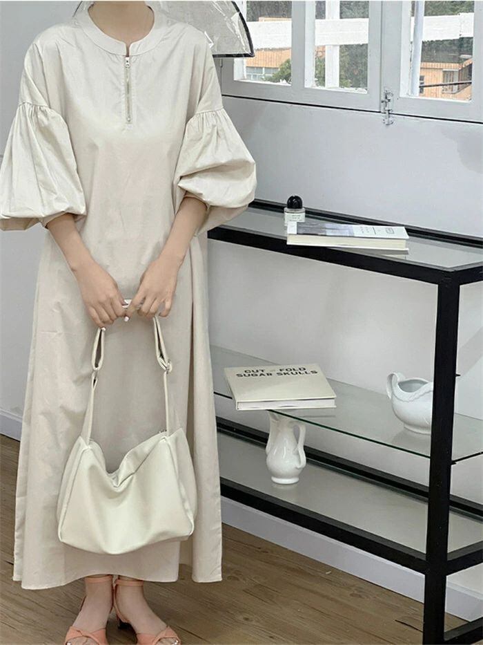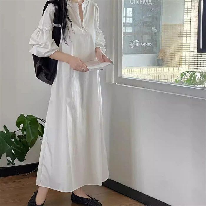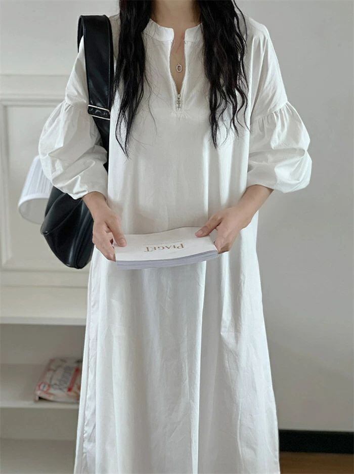 ワンピース レディース 春秋 ロングワンピース 長袖 ハーフジップ ロング丈 ぽわん袖 夏 立ち襟 マキシワンピース マキシ丈 春服 ボリュー