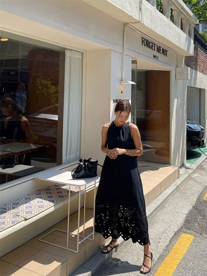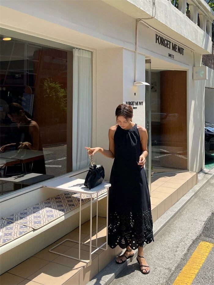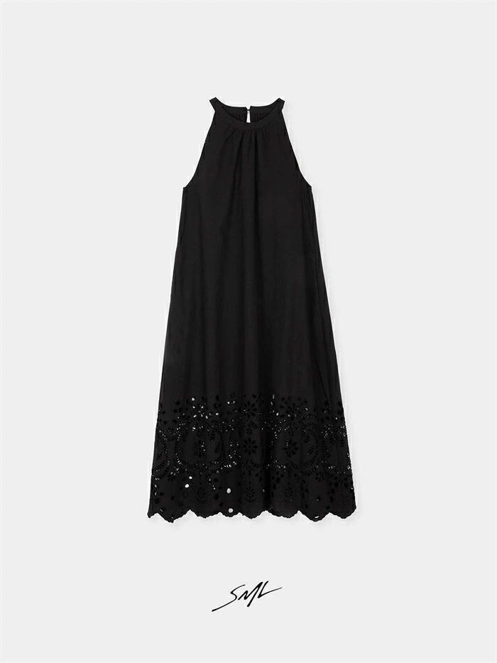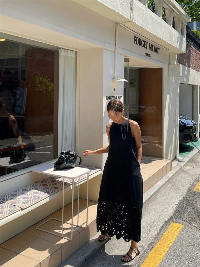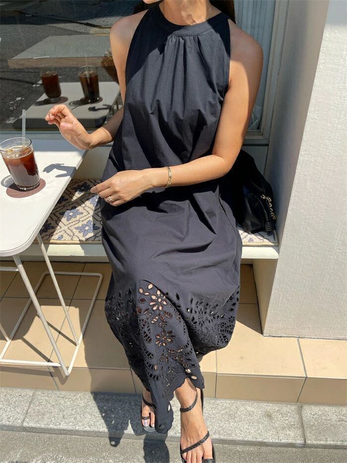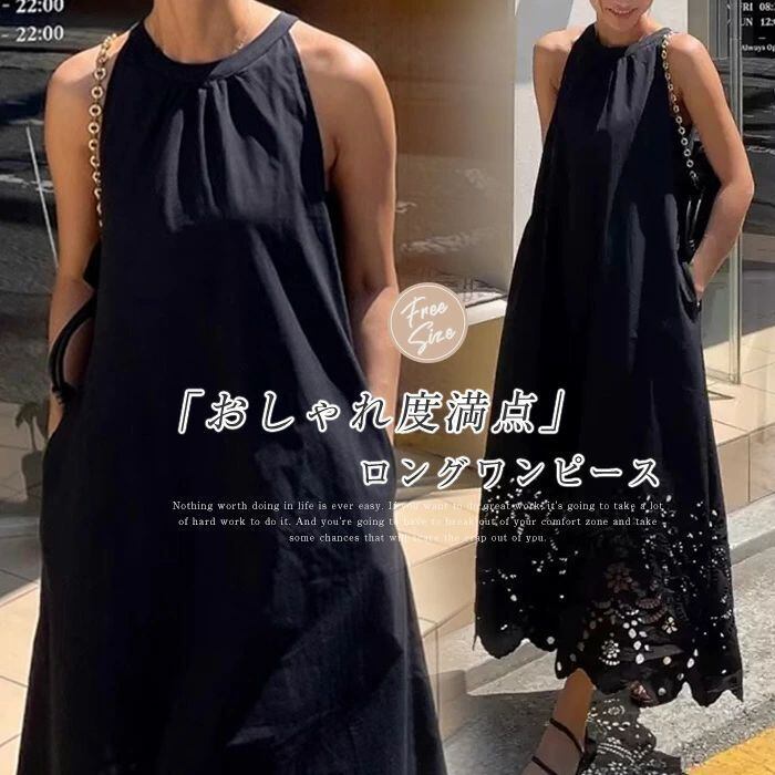 ワンピース ホルターネック ロング ワンピース レディース 夏 ノースリーブ レース裾 透かし彫り 無地 きれいめ ロング丈 ワンピ ロング丈 大人 春 夏 リゾート ワンピース 体型カバー 20代 30代 40代 大人 可愛い おしゃれ デザイン感 着痩せ 通勤 OL デート 送料無料