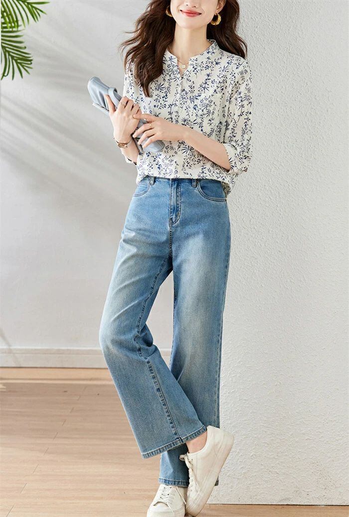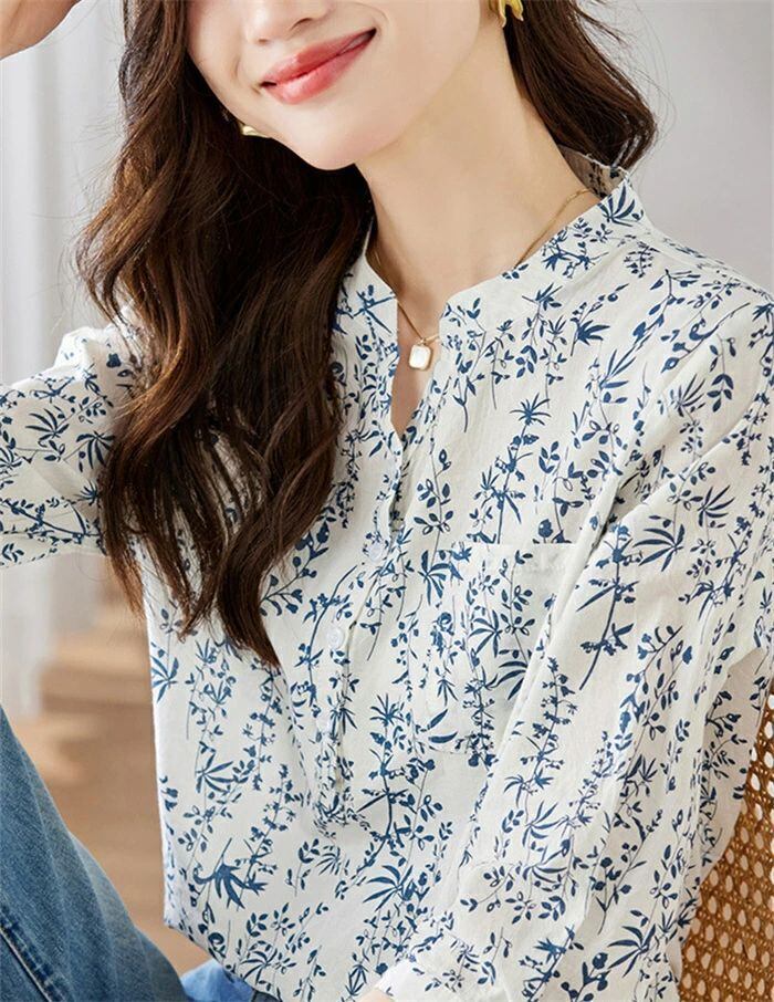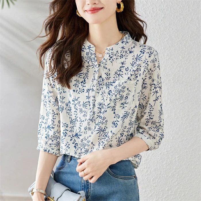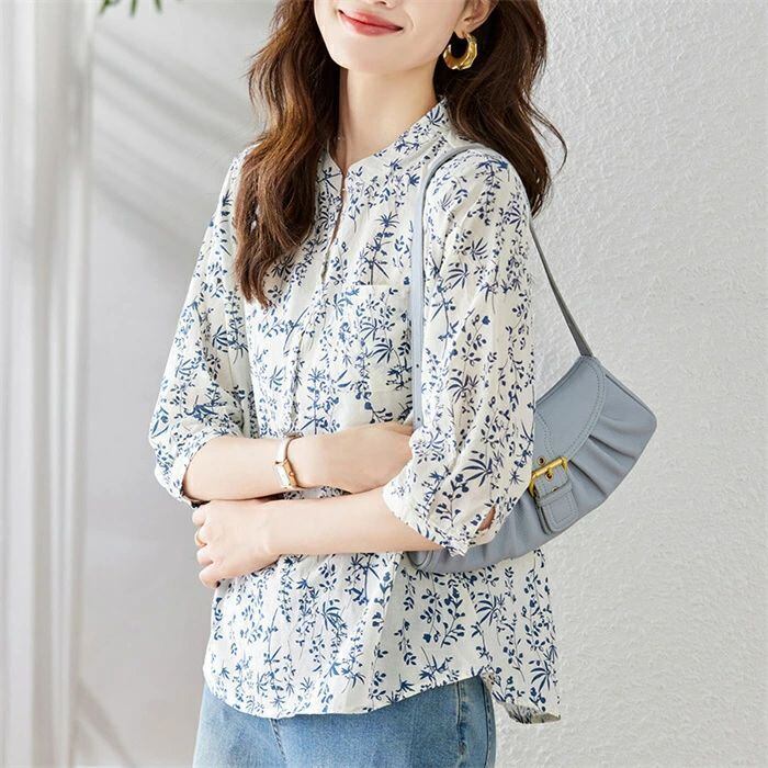シャツ レディース 春夏 シャツブラウス ブラウス 綿100% 花柄 七分袖 綿シャツ vネック 綿 エスニック コットン フォーマル オフィス ト