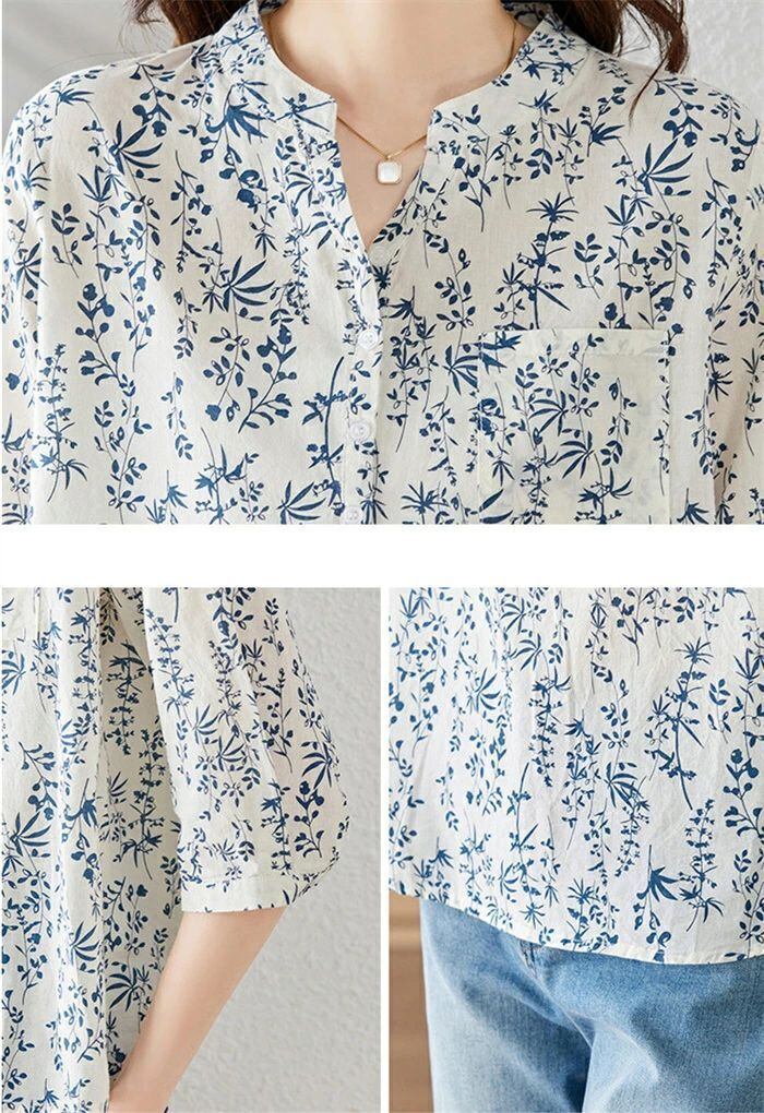 シャツ レディース 春夏 シャツブラウス ブラウス 綿100% 花柄 七分袖 綿シャツ vネック 綿 エスニック コットン フォーマル オフィス トップス ゆったり 体型カバー カジュアル 柔らかい 大きいサイズ 通勤 シンプル 上品 着回し 送料無料