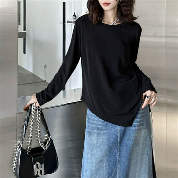 ヘムデザインTシャツ Tシャツ レディース 長袖 トップス カットソー クルーネック アシンメトリーTシャツ 綿麻 変形Tシャツ 変形デザイン