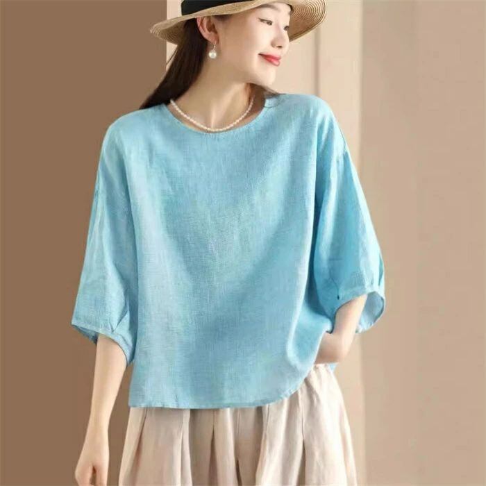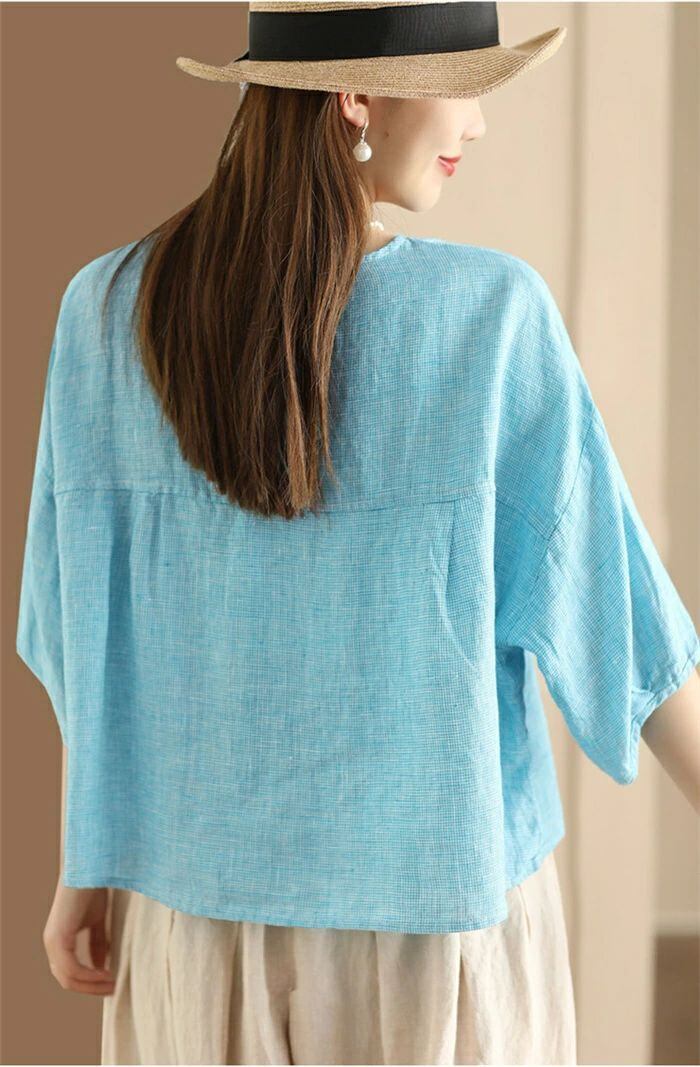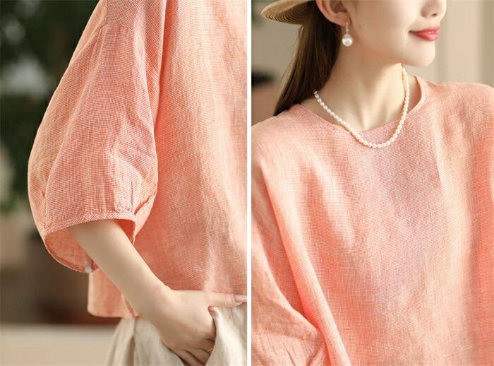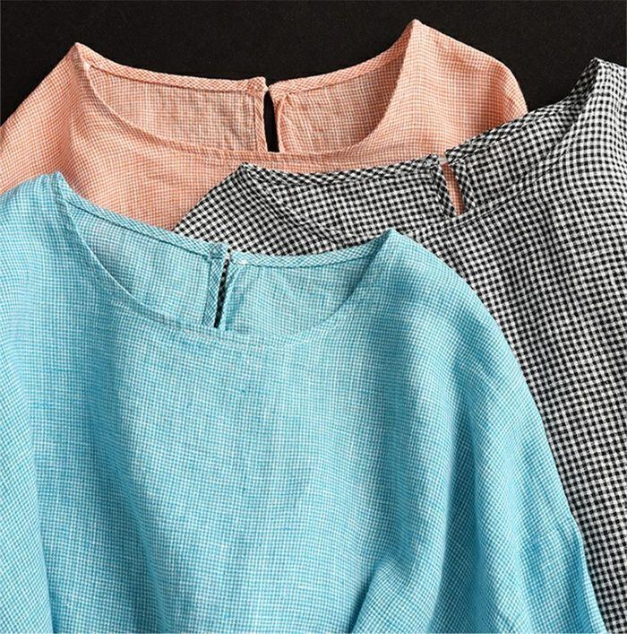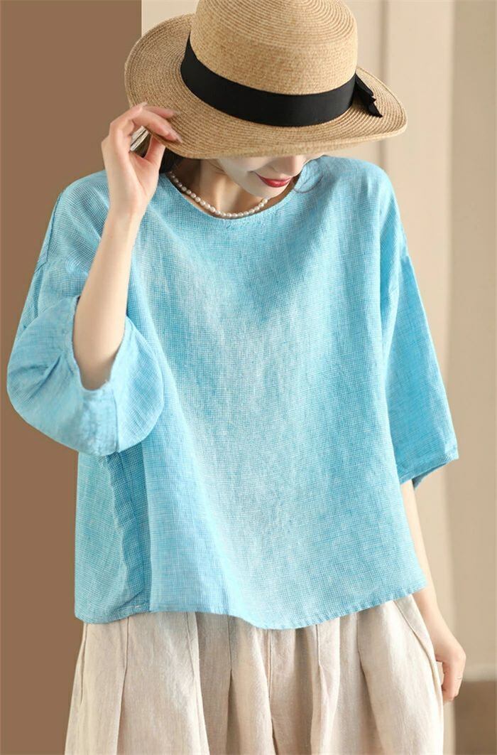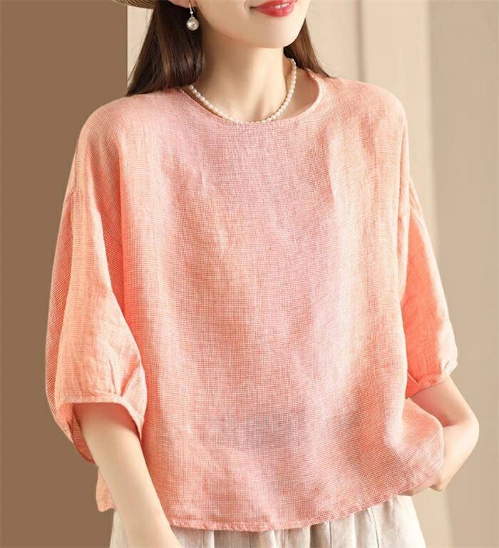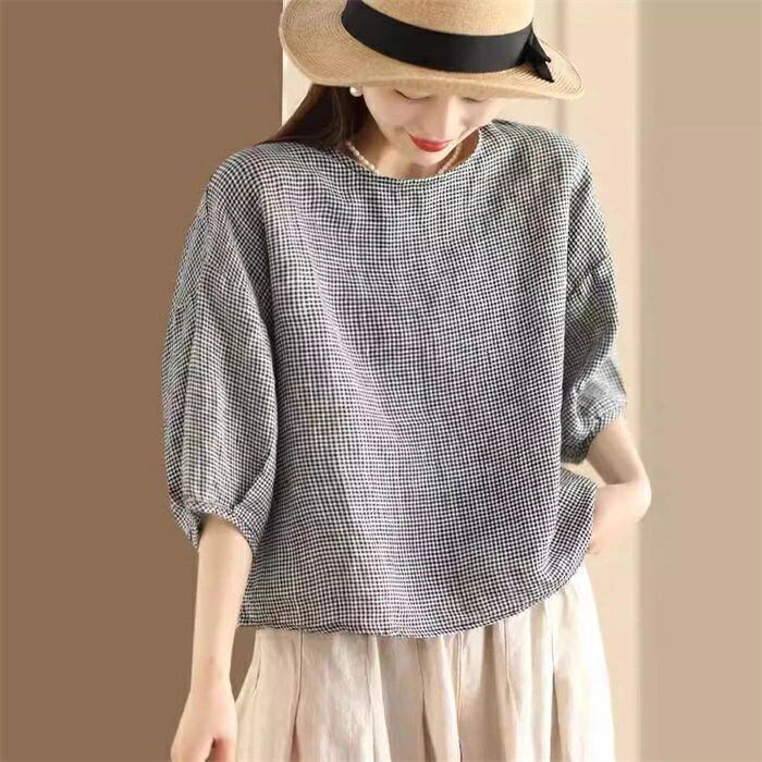 ブラウス チェック柄 レディース 春夏 チェックシャツ 麻ブラウス シャツブラウス リネン ナチュラル 五分袖 シャツ 麻 プルオーバー クルーネック トップス ゆったり 体型カバー 大人 可愛い カジュアル 透気性 吸汗 エレガント 春 夏 送料無料