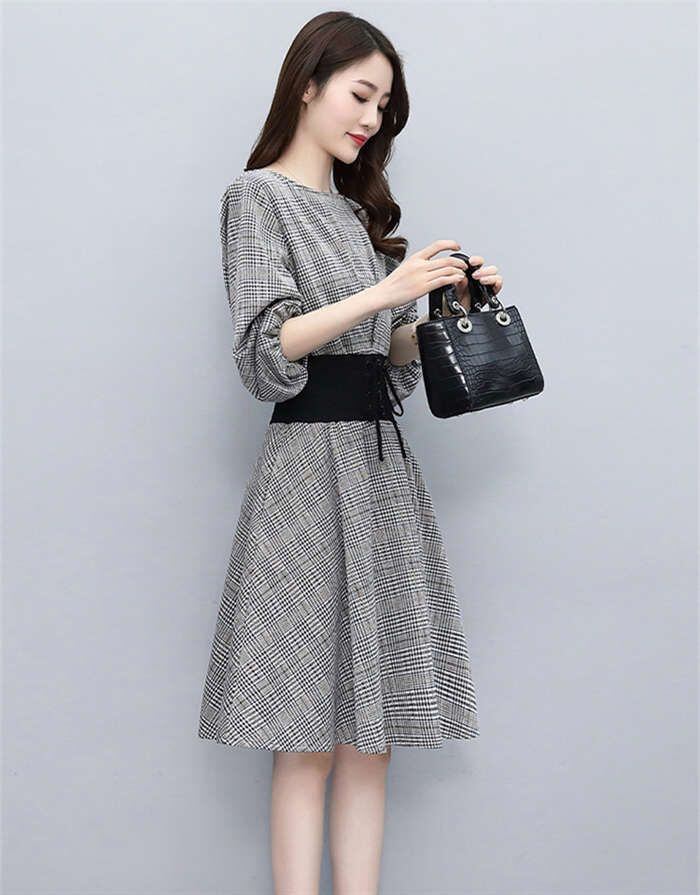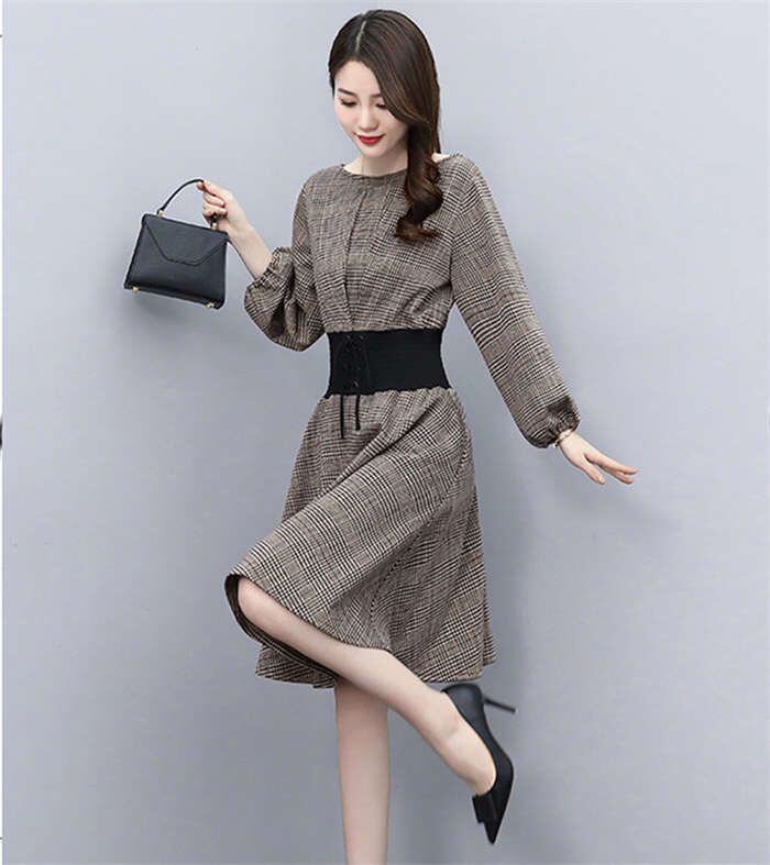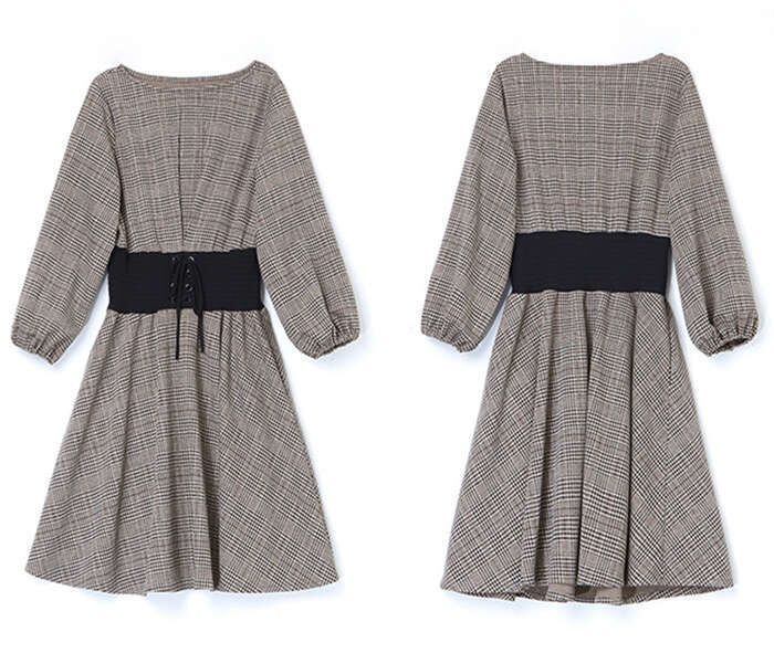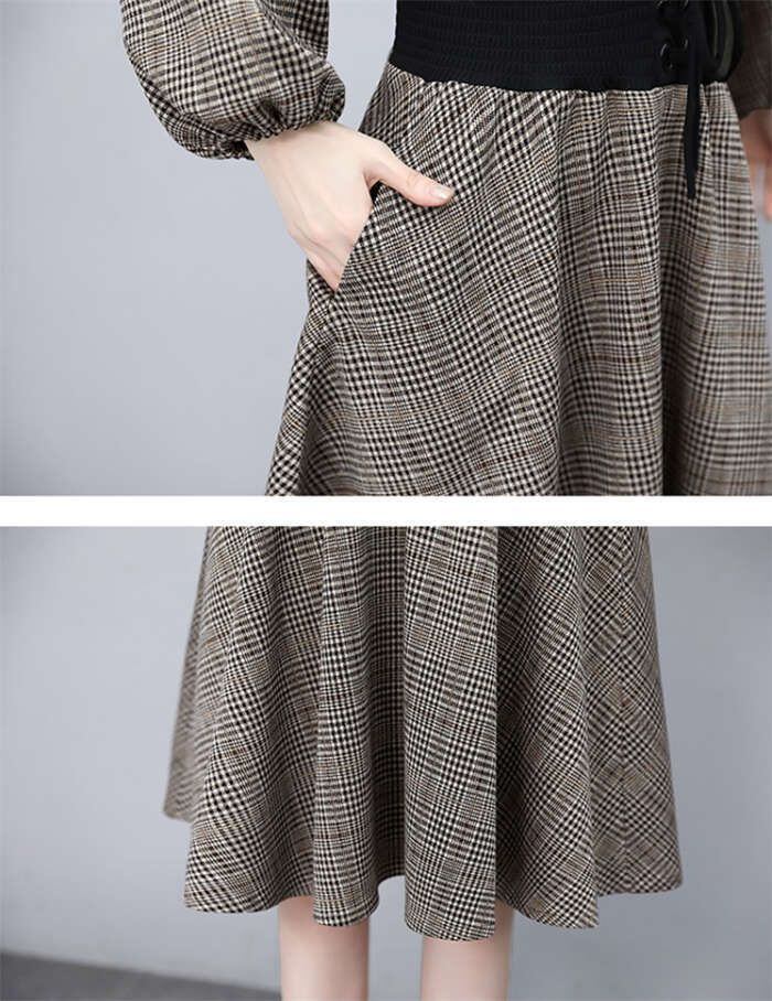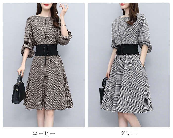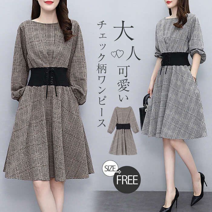 膝丈ワンピース レディース ワンピース 秋 九分丈 秋冬 フレアワンピース きれいめ 着痩せ 美シルエット ウエストマーク クルーネック チェ