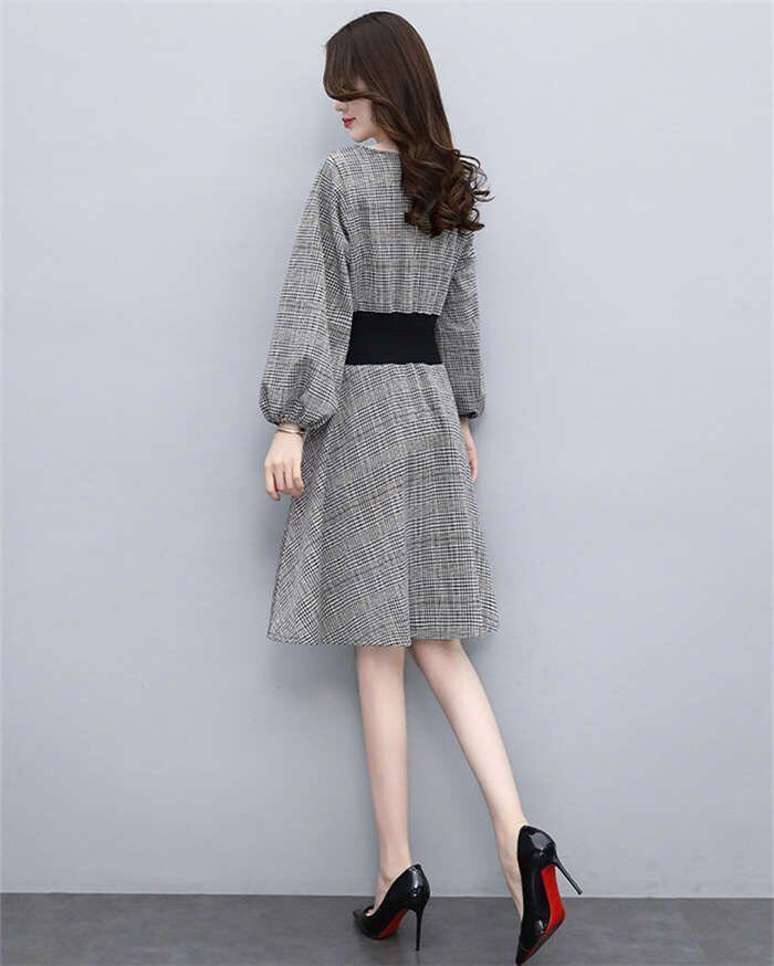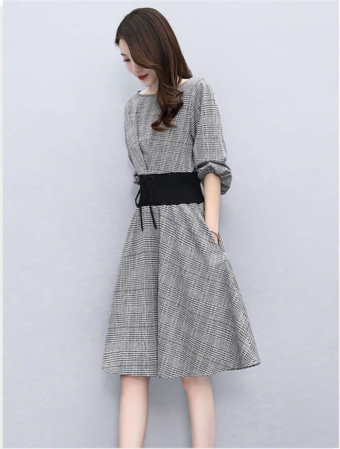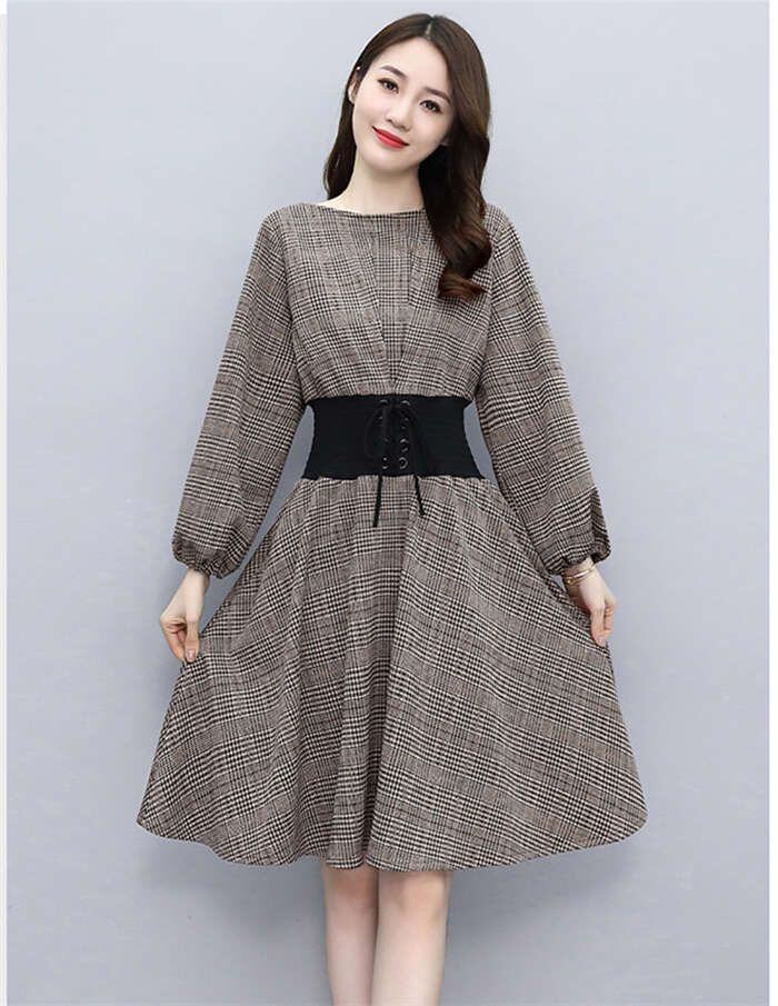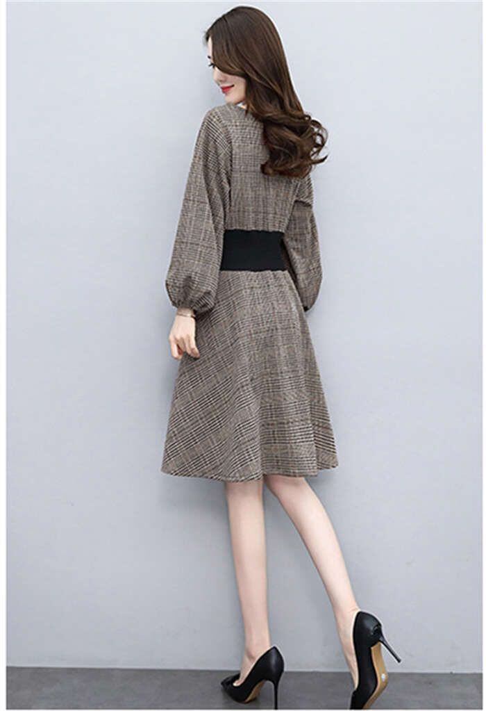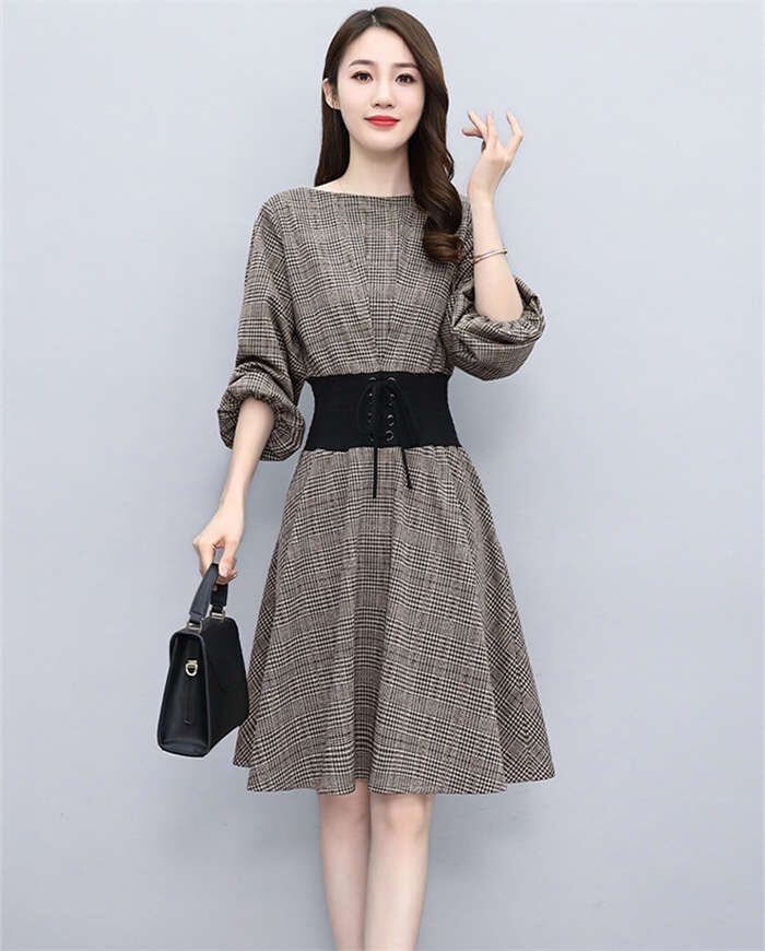 膝丈ワンピース レディース ワンピース 秋 九分丈 秋冬 フレアワンピース きれいめ 着痩せ 美シルエット ウエストマーク クルーネック チェ