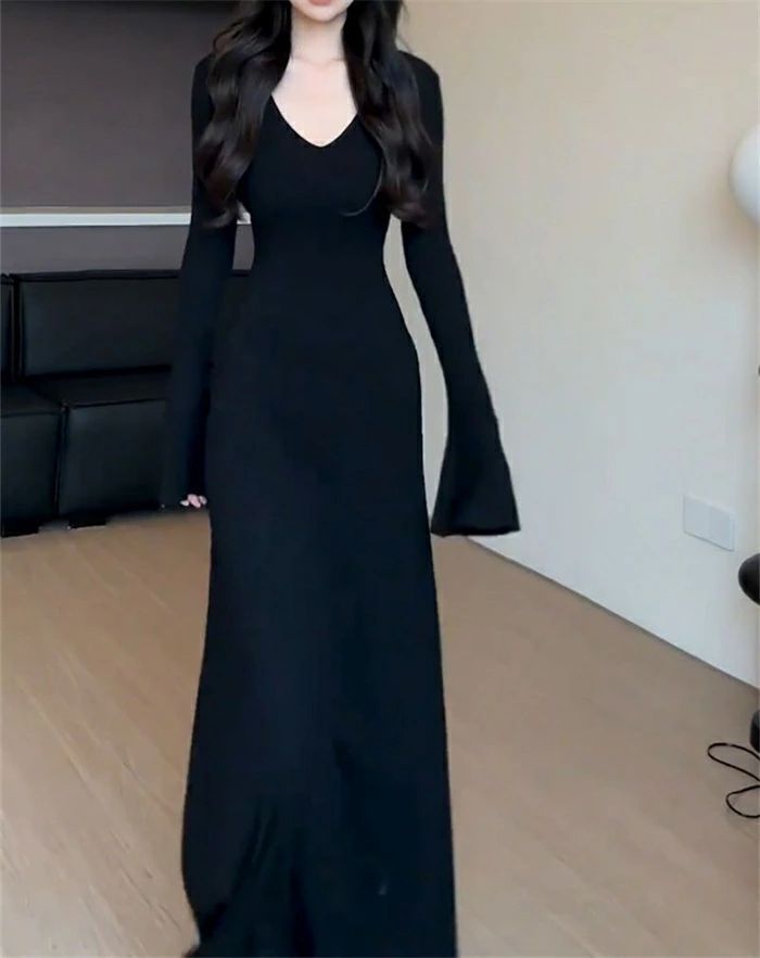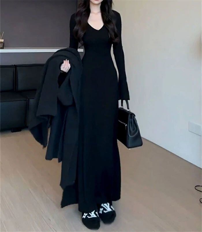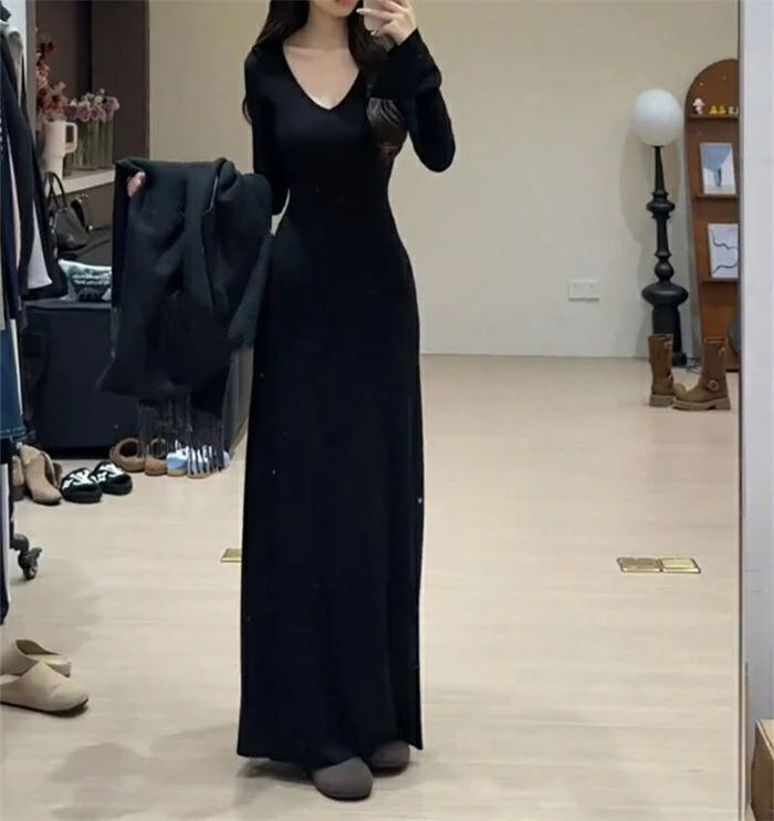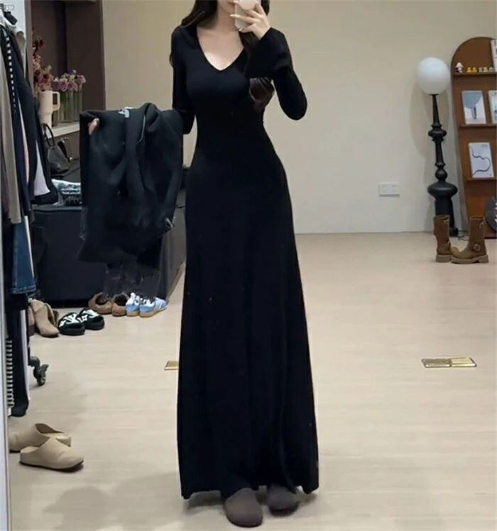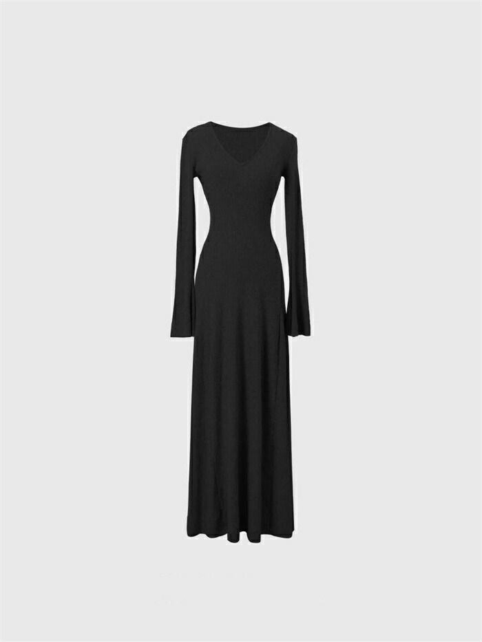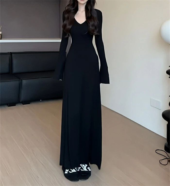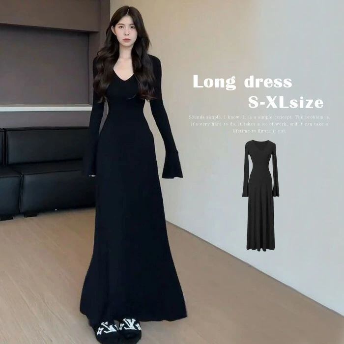 ワンピース マキシワンピース レディース 秋冬 ワンピ ロングワンピース 長袖 タイプ Vネック マキシ Aライン フレア ロング丈 フェミニン 無地 着?せ エレガント トレンド カジュアル シンプル 着回し フォーマル 通勤 普段着 20代 30代 40代 50代
