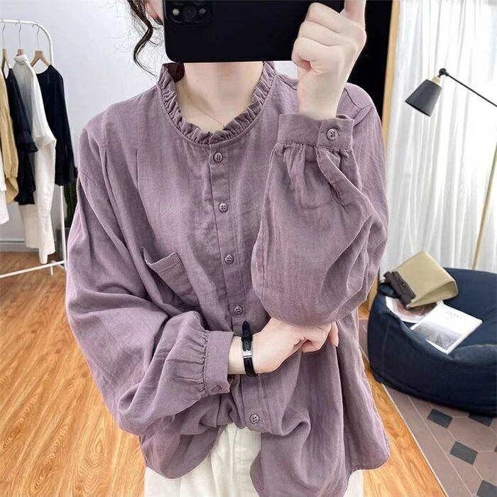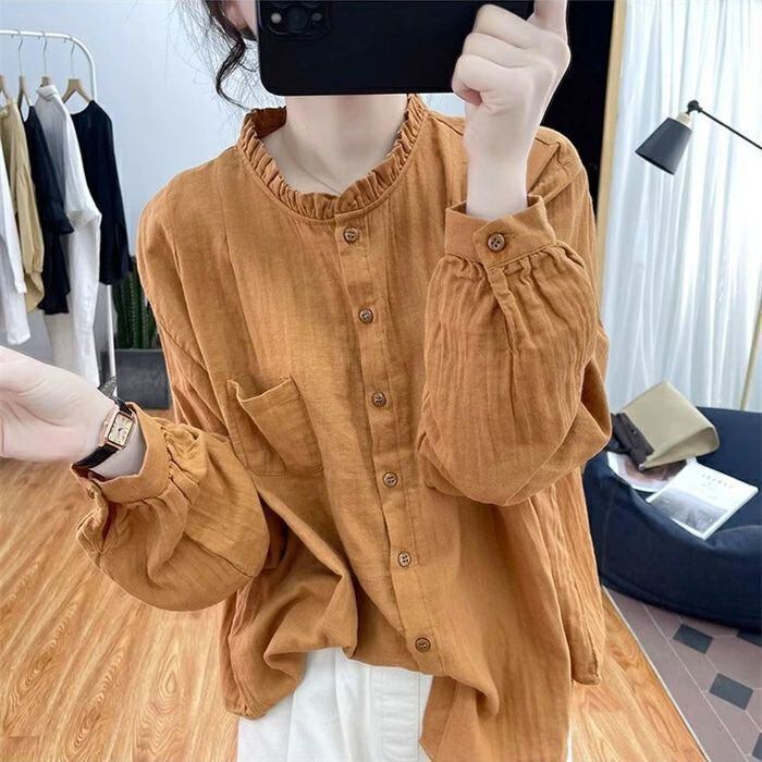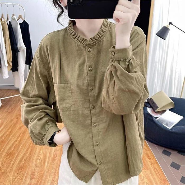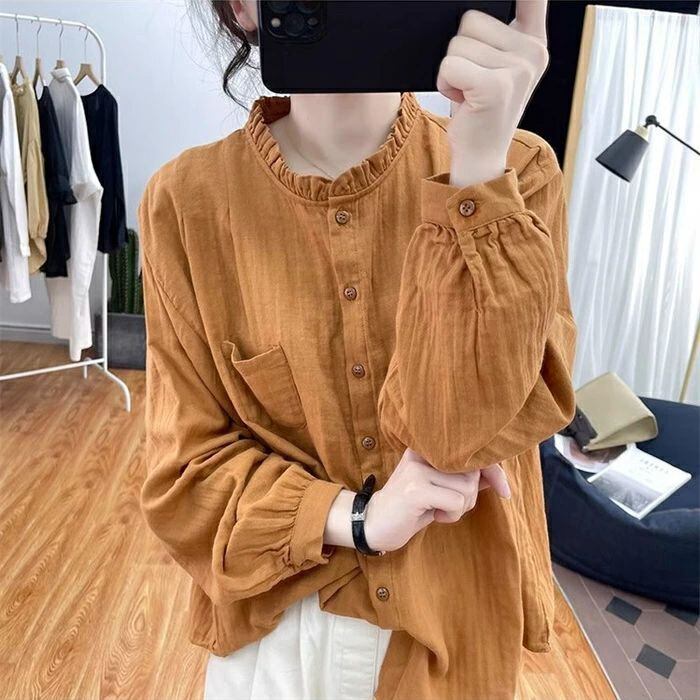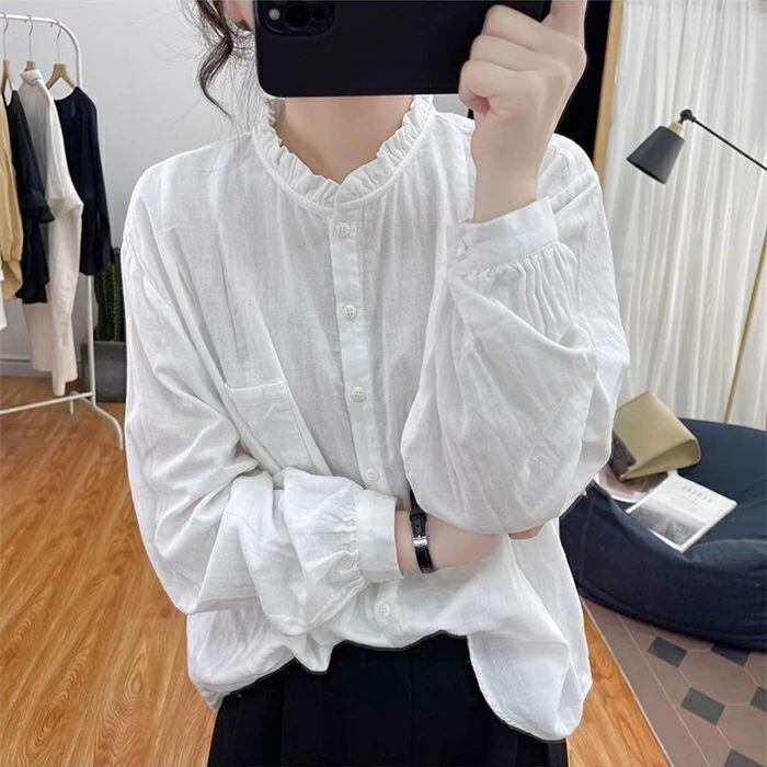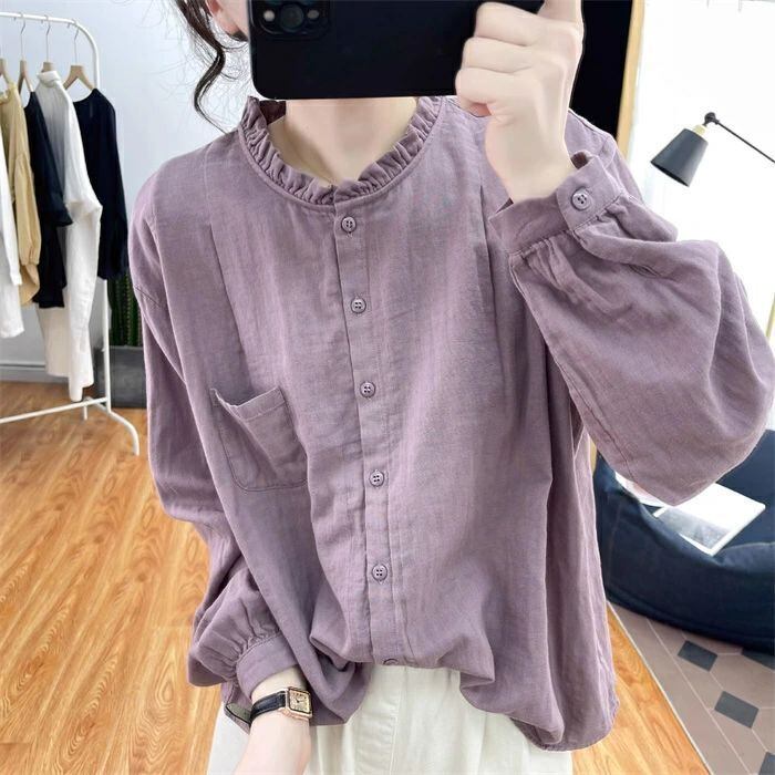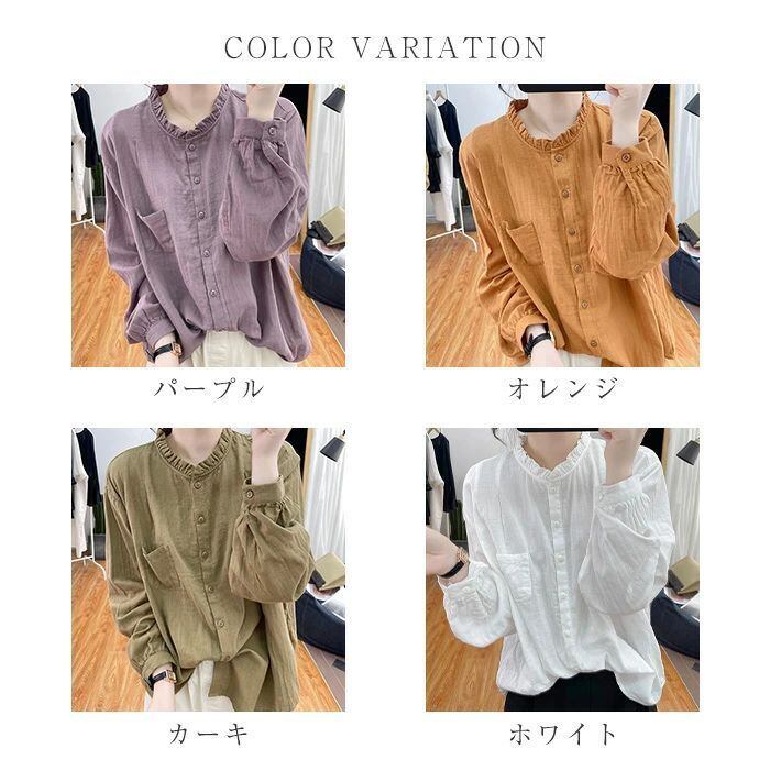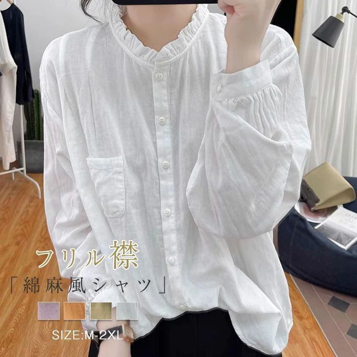 シャツ レディース 春秋 シャツブラウス フリル襟 長袖 綿麻シャツ ブラウス 綿麻風 トップス インナー レトロ 大きいサイズ 上着 ゆったり