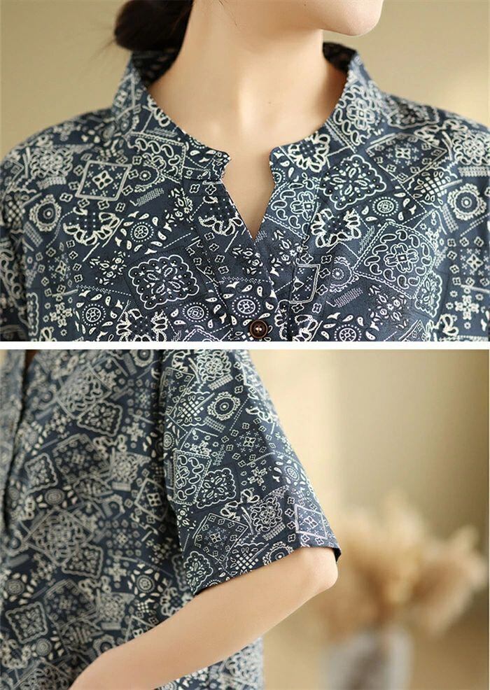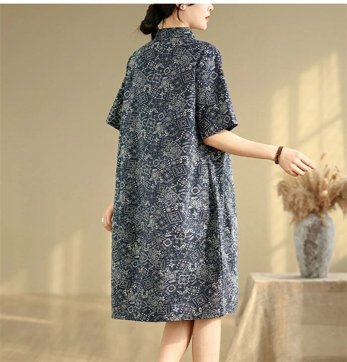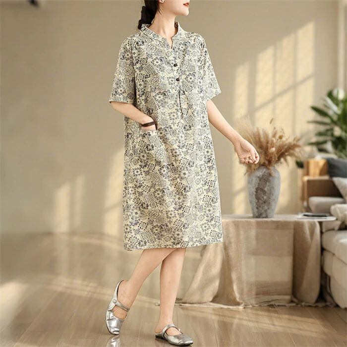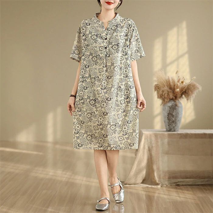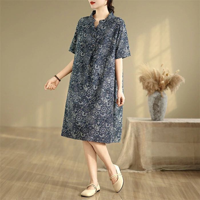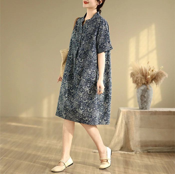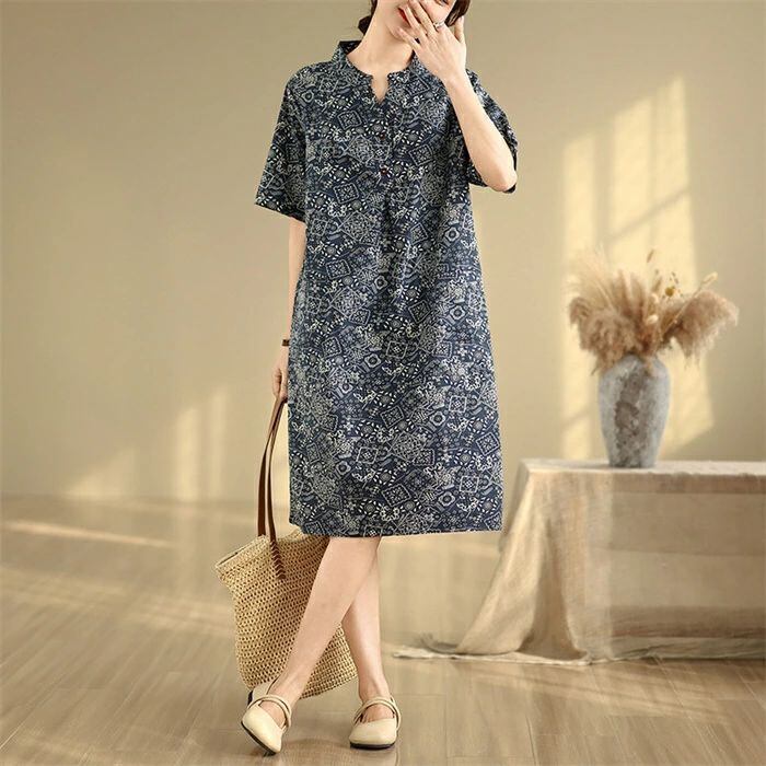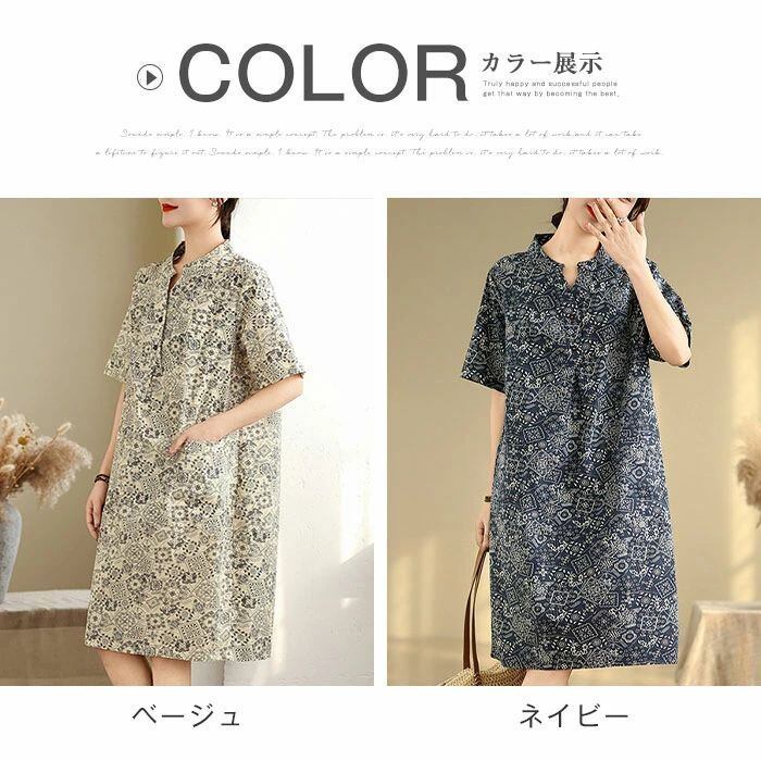 ワンピース チュニック 綿麻風 レディース 綿麻ワンピース ロングワンピース ロング丈 半袖 総柄 大きいサイズ ワンピ ゆったり 体型カバー