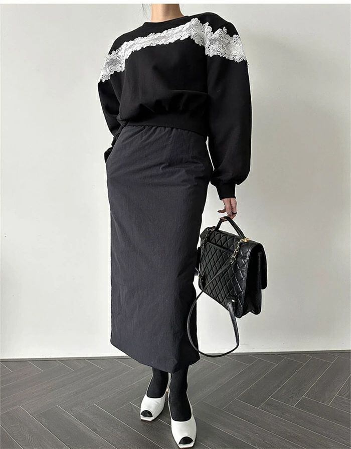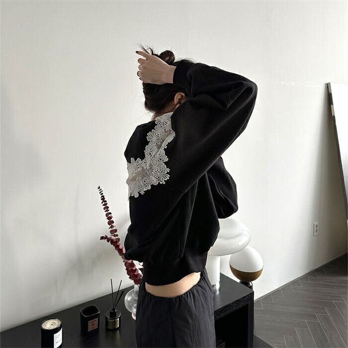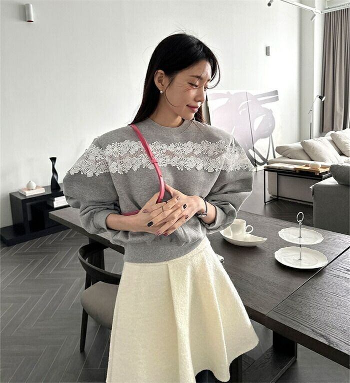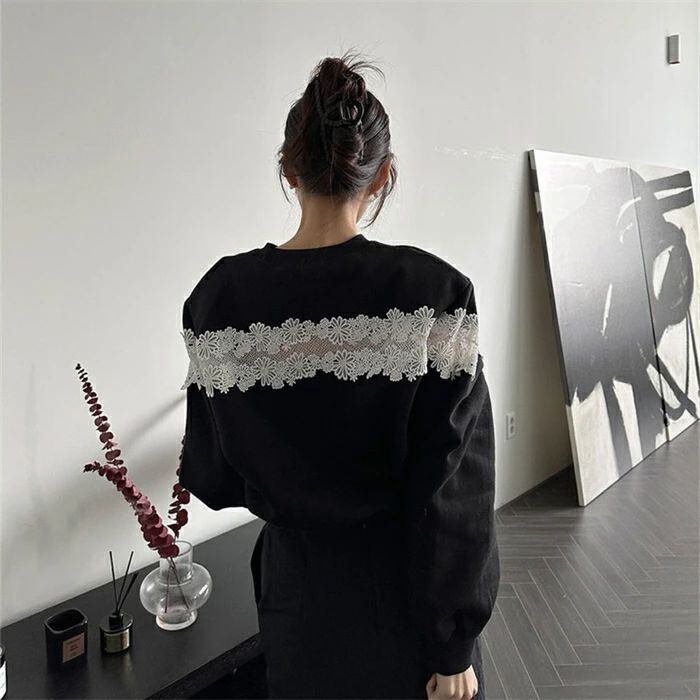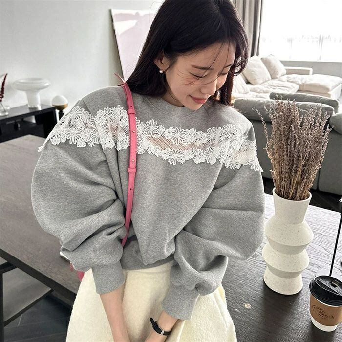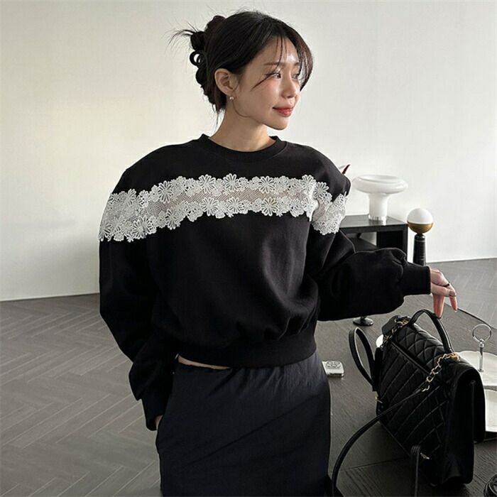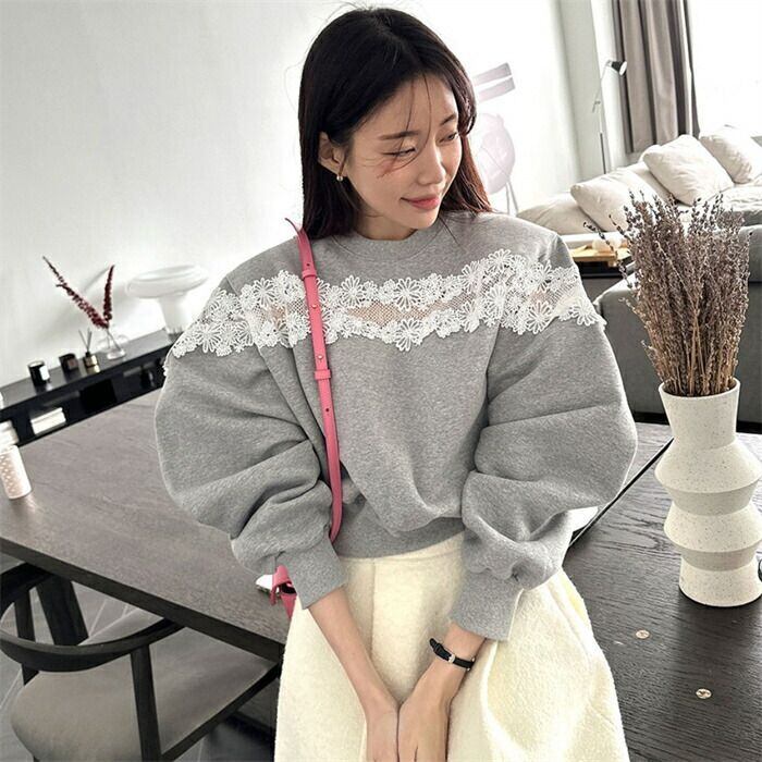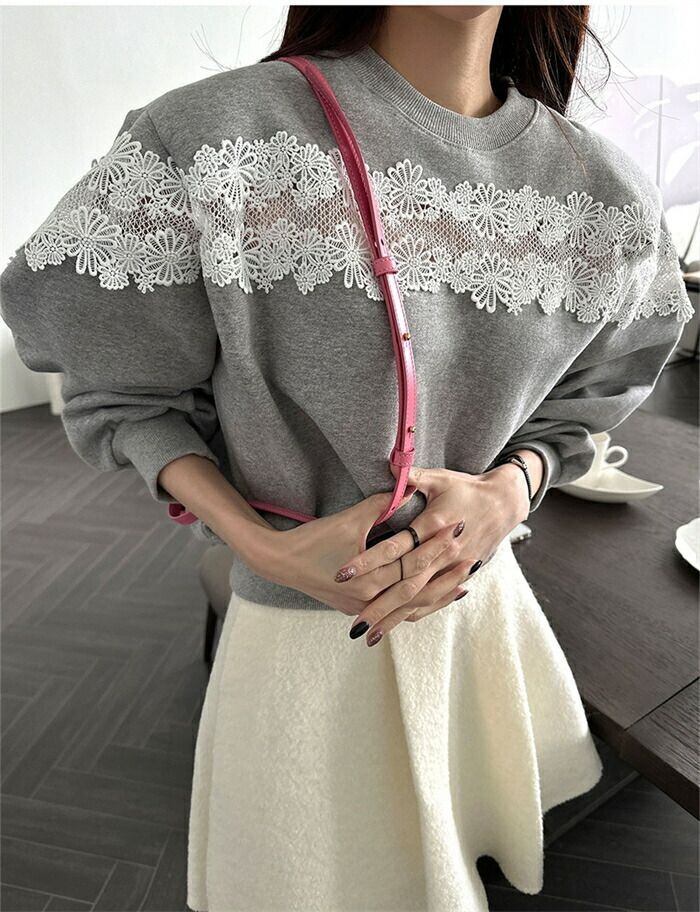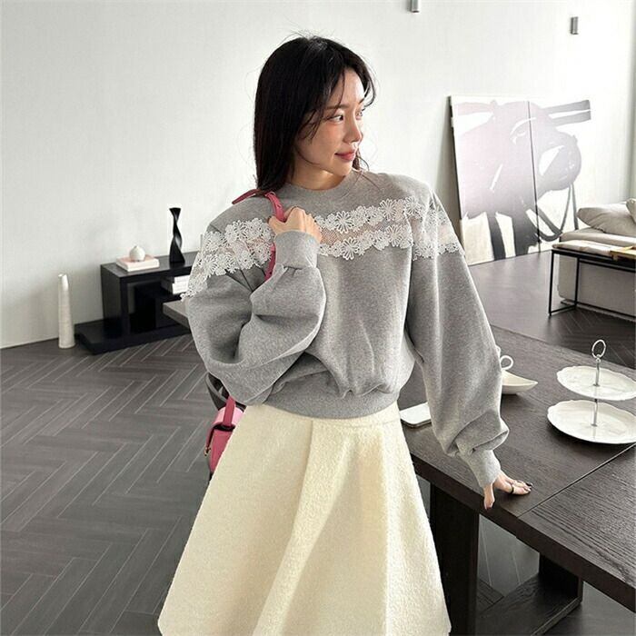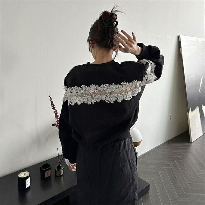 トレーナー レディース 長袖 秋冬 スウェット ショート丈 レース 切替 キレイめ ラウンドネック 裏起毛 プルオーバー トップス 透かし編み