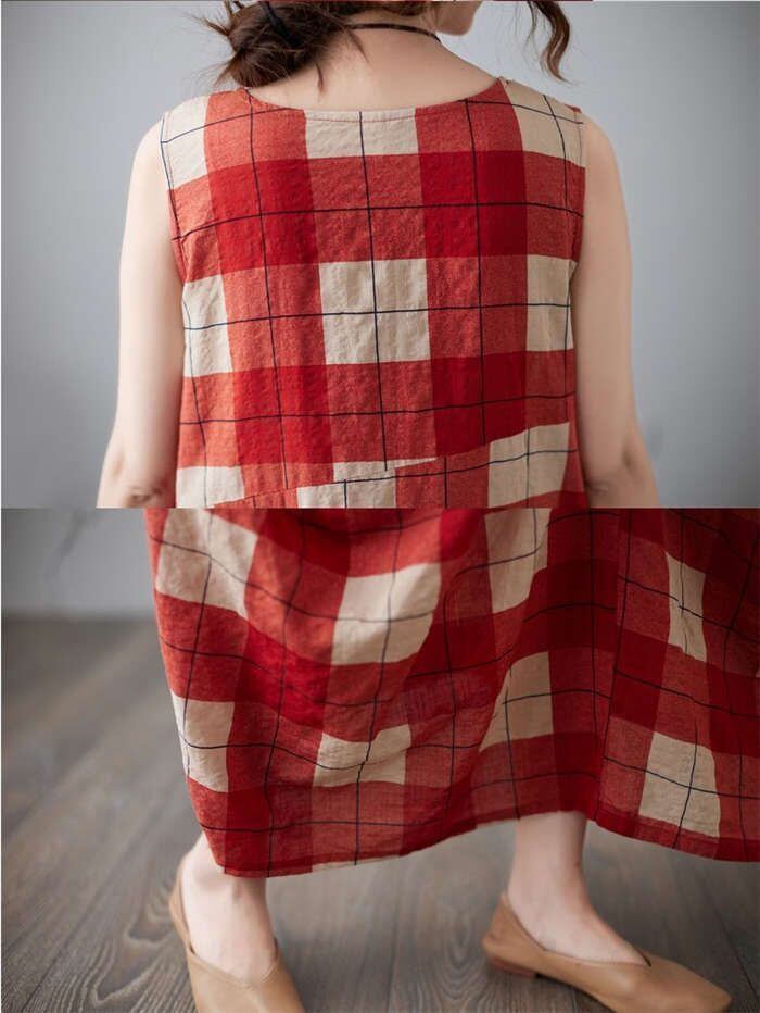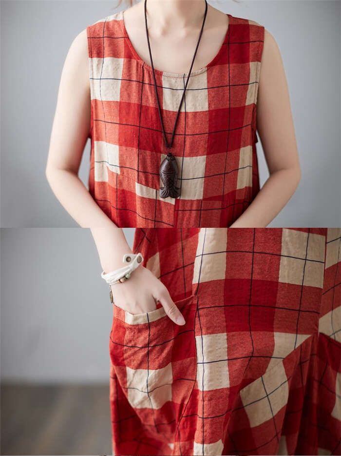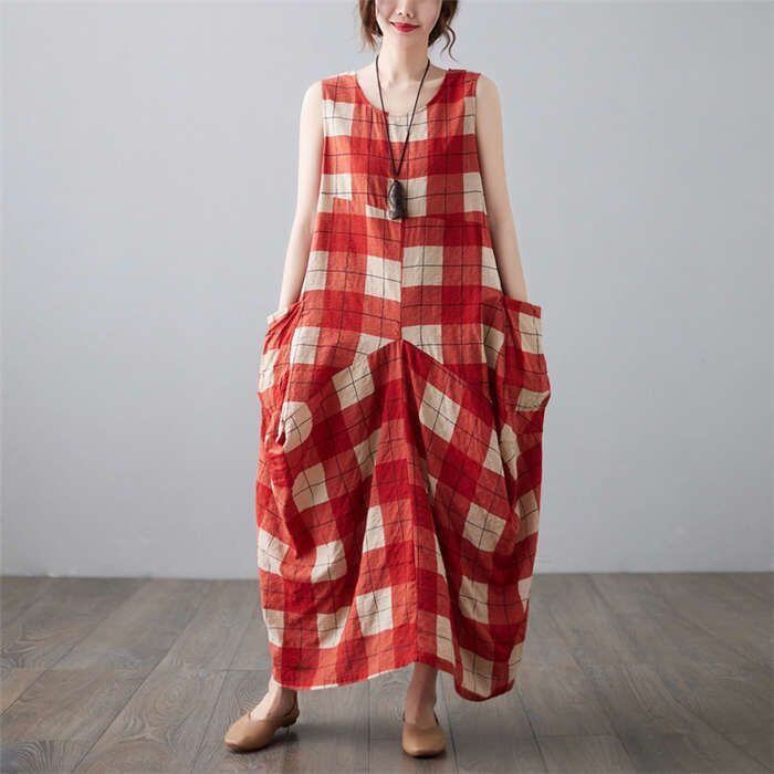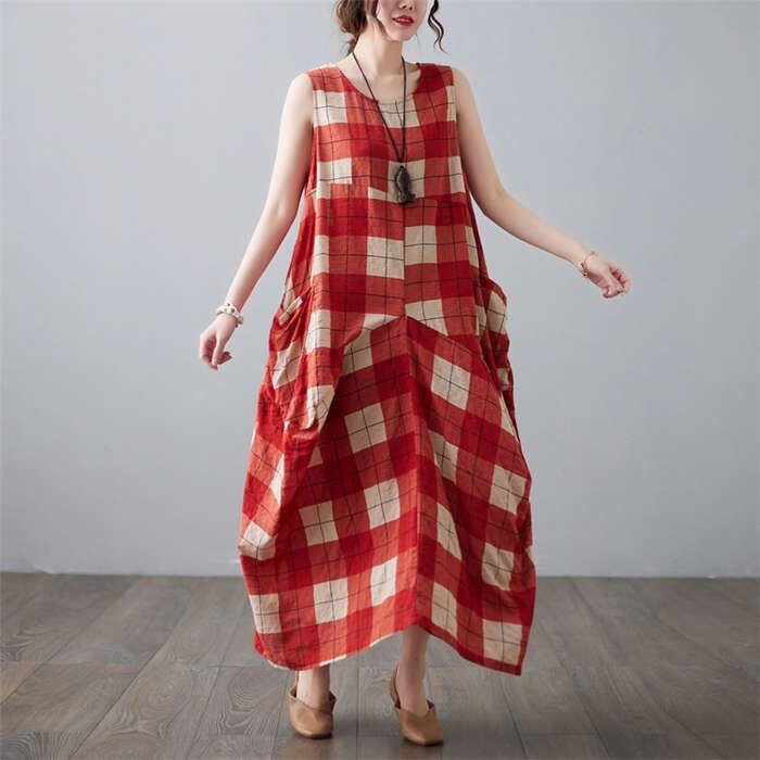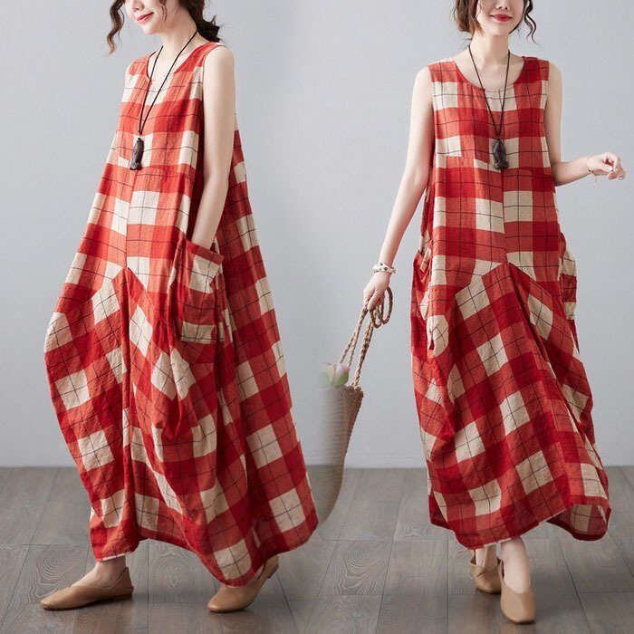 ワンピース レディース 40代 マキシワンピース 春夏 ノースリーブ 綿麻 リネン ワンピース チェック柄ワンピース ロング丈ワンピース ゆっ